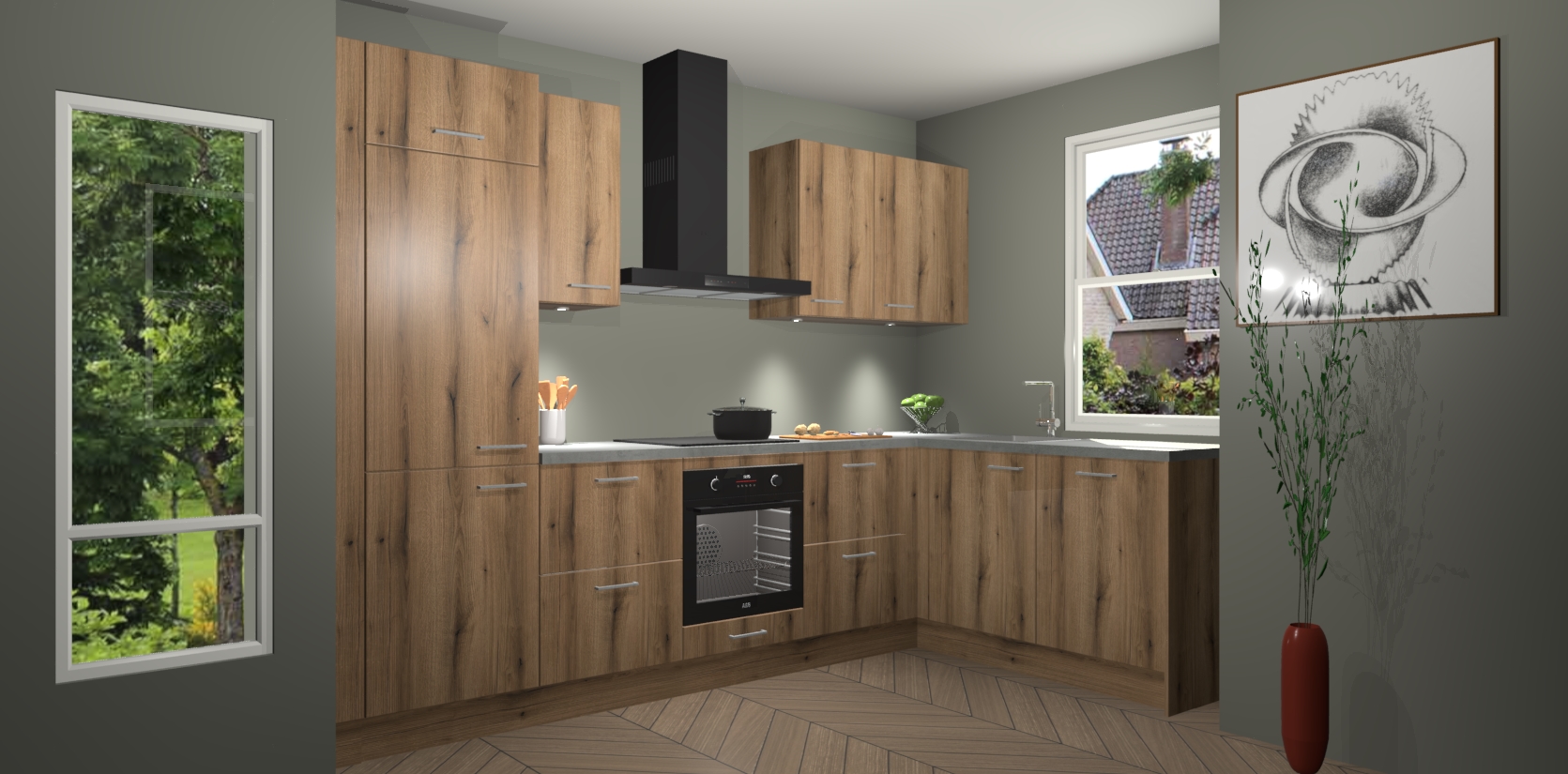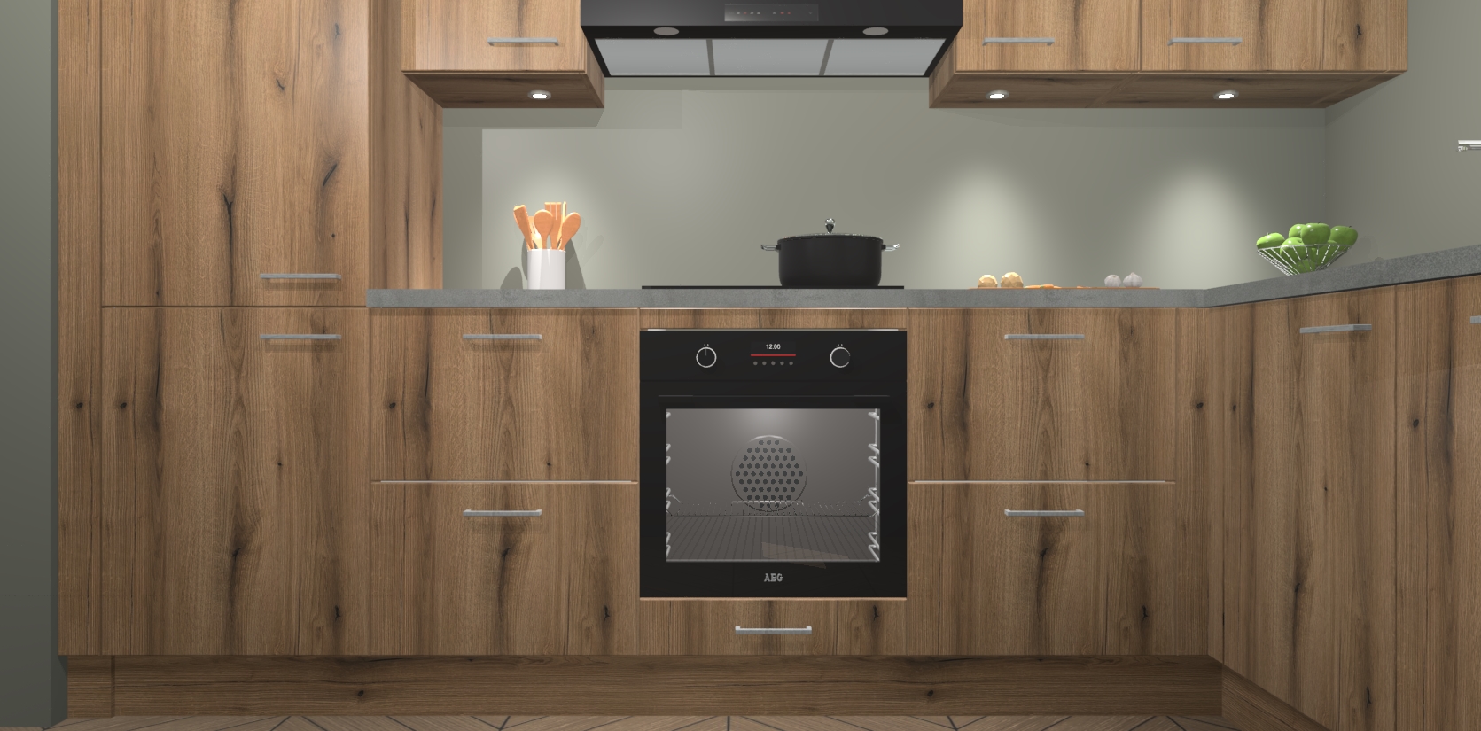 De Goud Eiken keuken Geneve is uitgerust met 5 inbouwapparaten - een oven, inductiekookplaat, afzuigkap, vaatwasser en koelkast - voor al uw kook- en bewaarbehoeftes. U kunt deze apparaten desgewenst eenvoudig upgraden naar AEG of de oven omruilen voor een combimagnetron na het plaatsen van uw bestelling. En met de soft close deuren, voldoende opbergruimte en kasten die voorgemonteerd worden geleverd, bent u in een mum van tijd klaar om heerlijke maaltijden te bereiden!