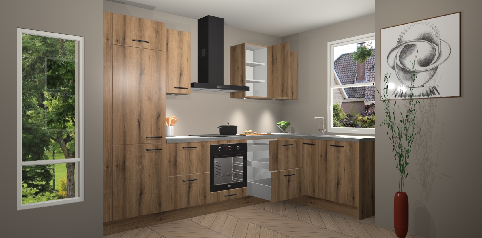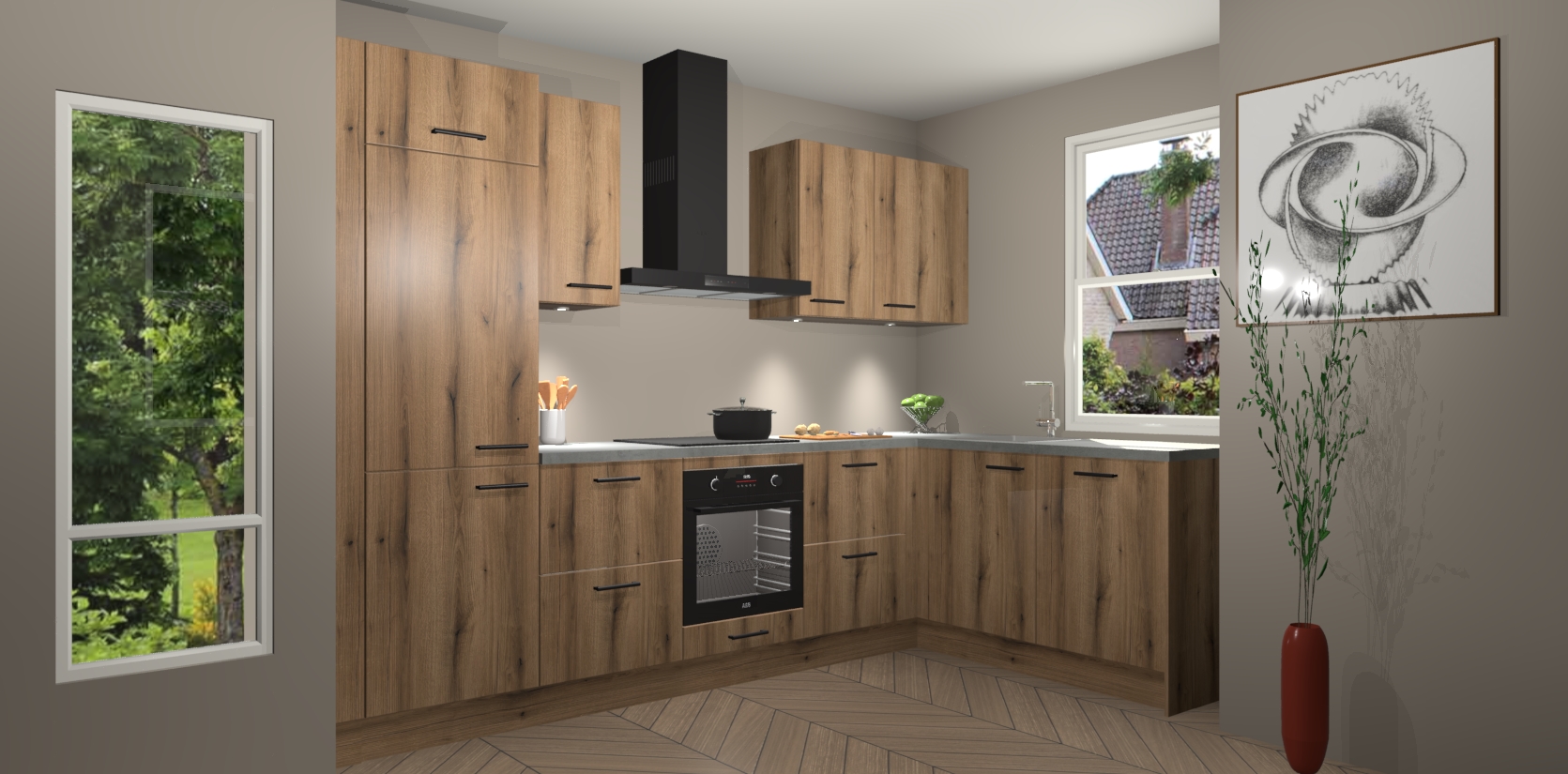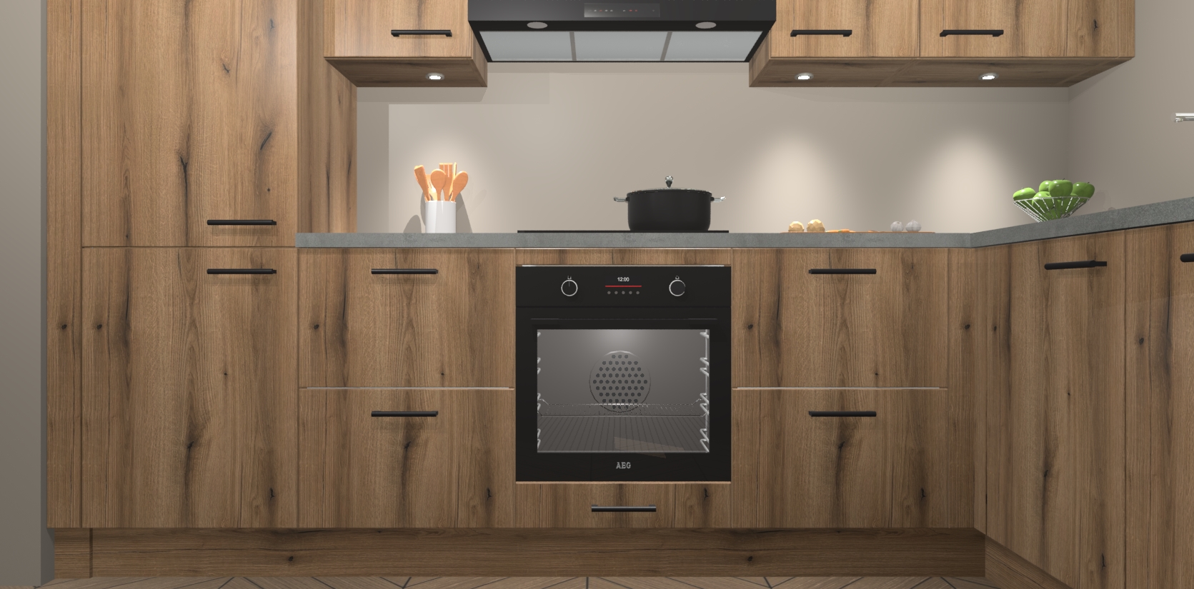 De Goud Eiken keuken Geneve is uitgerust met 5 inbouwapparaten - een oven, inductiekookplaat, afzuigkap, vaatwasser en koelkast - voor al uw kook- en bewaarbehoeftes. U kunt deze apparaten desgewenst eenvoudig upgraden naar AEG of de oven omruilen voor een combimagnetron na het plaatsen van uw bestelling. En met de soft close deuren, voldoende opbergruimte en kasten die voorgemonteerd worden geleverd, bent u in een mum van tijd klaar om heerlijke maaltijden te bereiden!