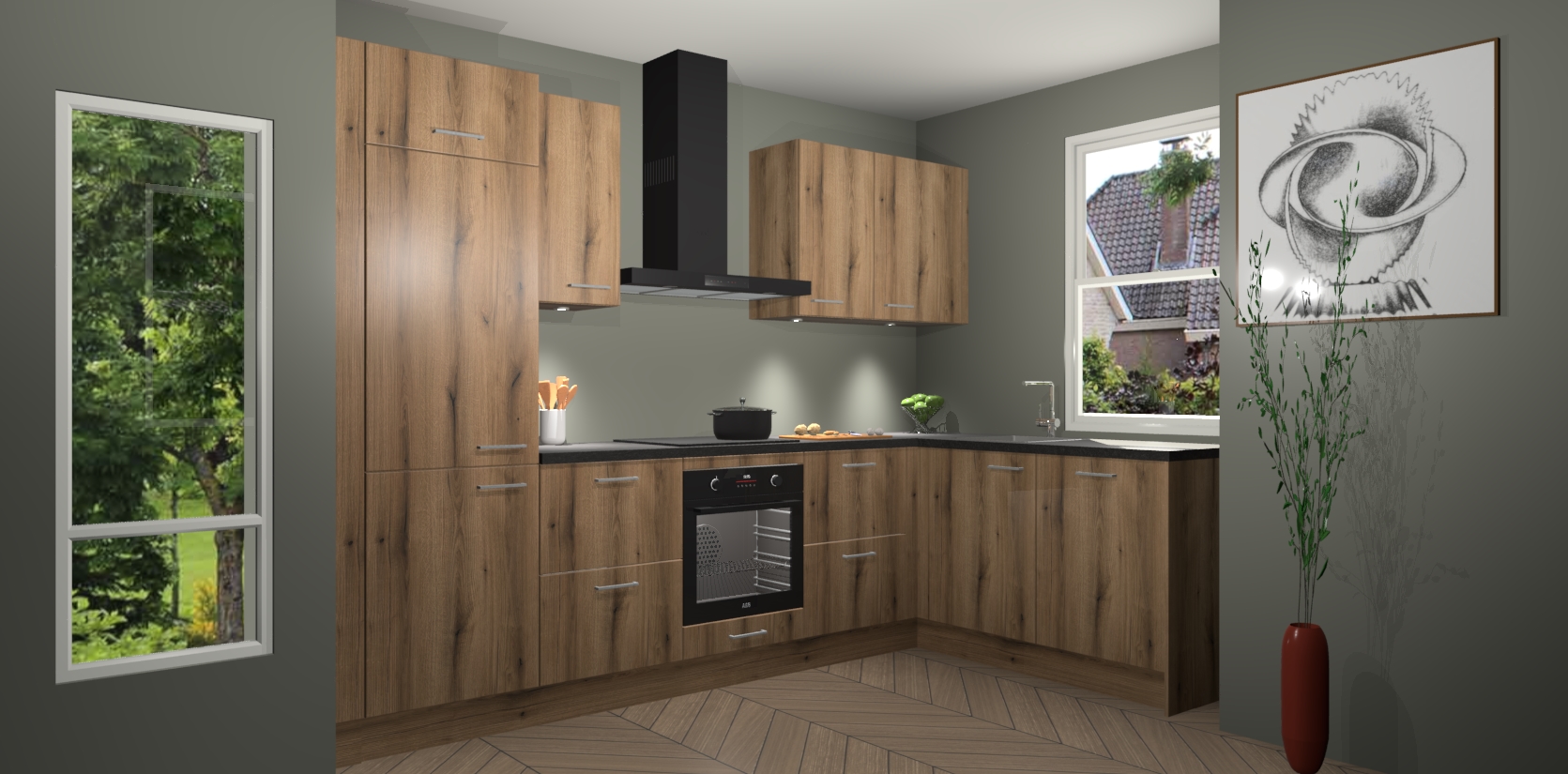 De Goud Eiken keuken Geneve is precies wat u nodig heeft als u op zoek bent naar modern design, versmolten met tijdloze schoonheid. De strakke afwerking voegt klasse toe terwijl het toch een uitnodigende sfeer behoudt; zeker om zowel gasten als uzelf te inspireren om in stijl te gaan koken! En nog beter, het zal uw budget niet breken - dus waarom wachten? Met de Goud Eiken keuken Geneve bent u verzekerd van kwaliteit zonder in te leveren op de prijs!