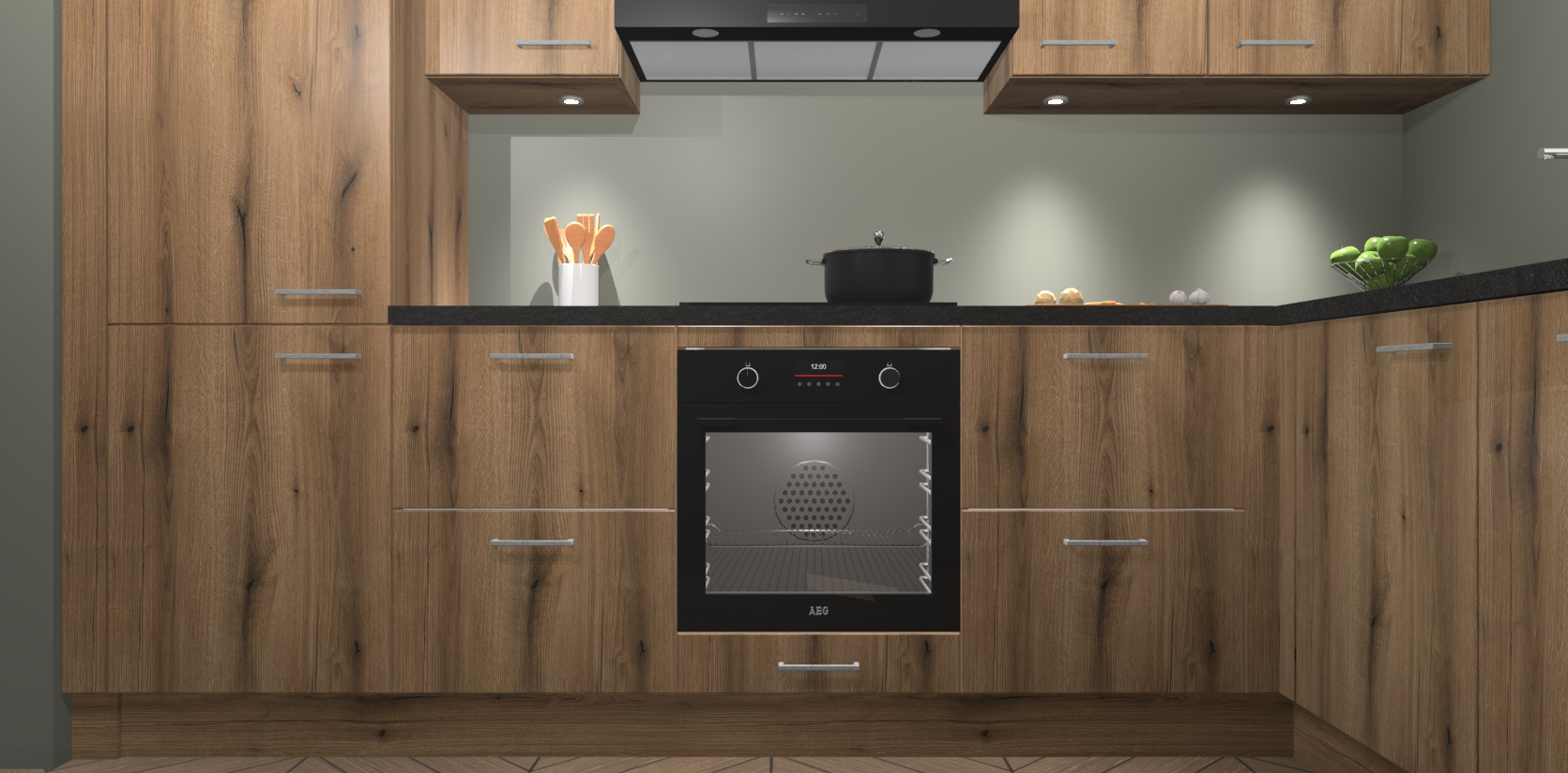 De Goud Eiken keuken Geneve is uitgerust met 5 inbouwapparaten - een oven, inductiekookplaat, afzuigkap, vaatwasser en koelkast - voor al uw kook- en bewaarbehoeftes. U kunt deze apparaten desgewenst eenvoudig upgraden naar AEG of de oven omruilen voor een combimagnetron na het plaatsen van uw bestelling. En met de soft close deuren, voldoende opbergruimte en kasten die voorgemonteerd worden geleverd, bent u in een mum van tijd klaar om heerlijke maaltijden te bereiden!