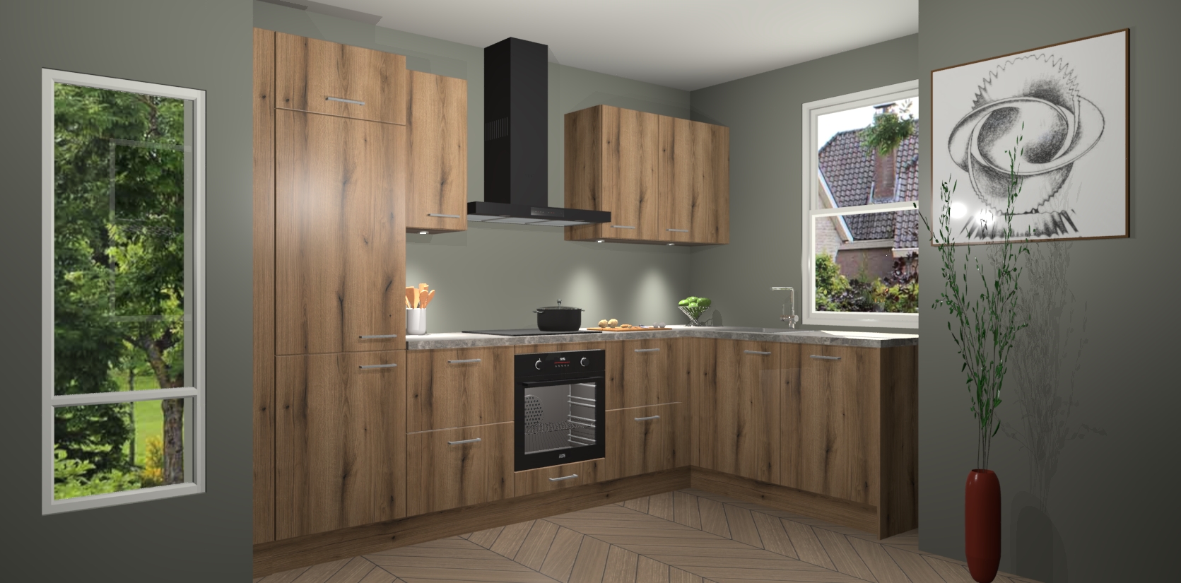 De Goud Eiken keuken Geneve is precies wat u nodig heeft als u op zoek bent naar modern design, versmolten met tijdloze schoonheid. De strakke afwerking voegt klasse toe terwijl het toch een uitnodigende sfeer behoudt; zeker om zowel gasten als uzelf te inspireren om in stijl te gaan koken! En nog beter, het zal uw budget niet breken - dus waarom wachten? Met de Goud Eiken keuken Geneve bent u verzekerd van kwaliteit zonder in te leveren op de prijs!