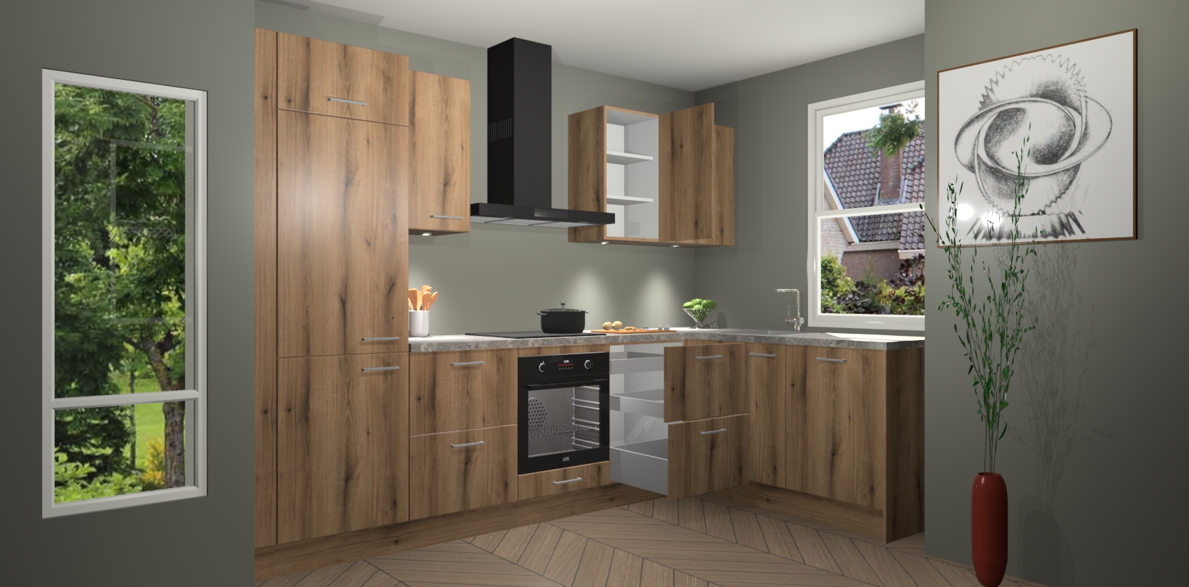De Goud Eiken keuken Geneve is uitgerust met 5 inbouwapparaten - een oven, inductiekookplaat, afzuigkap, vaatwasser en koelkast - voor al uw kook- en bewaarbehoeftes. U kunt deze apparaten desgewenst eenvoudig upgraden naar AEG of de oven omruilen voor een combimagnetron na het plaatsen van uw bestelling. En met de soft close deuren, voldoende opbergruimte en kasten die voorgemonteerd worden geleverd, bent u in een mum van tijd klaar om heerlijke maaltijden te bereiden!
