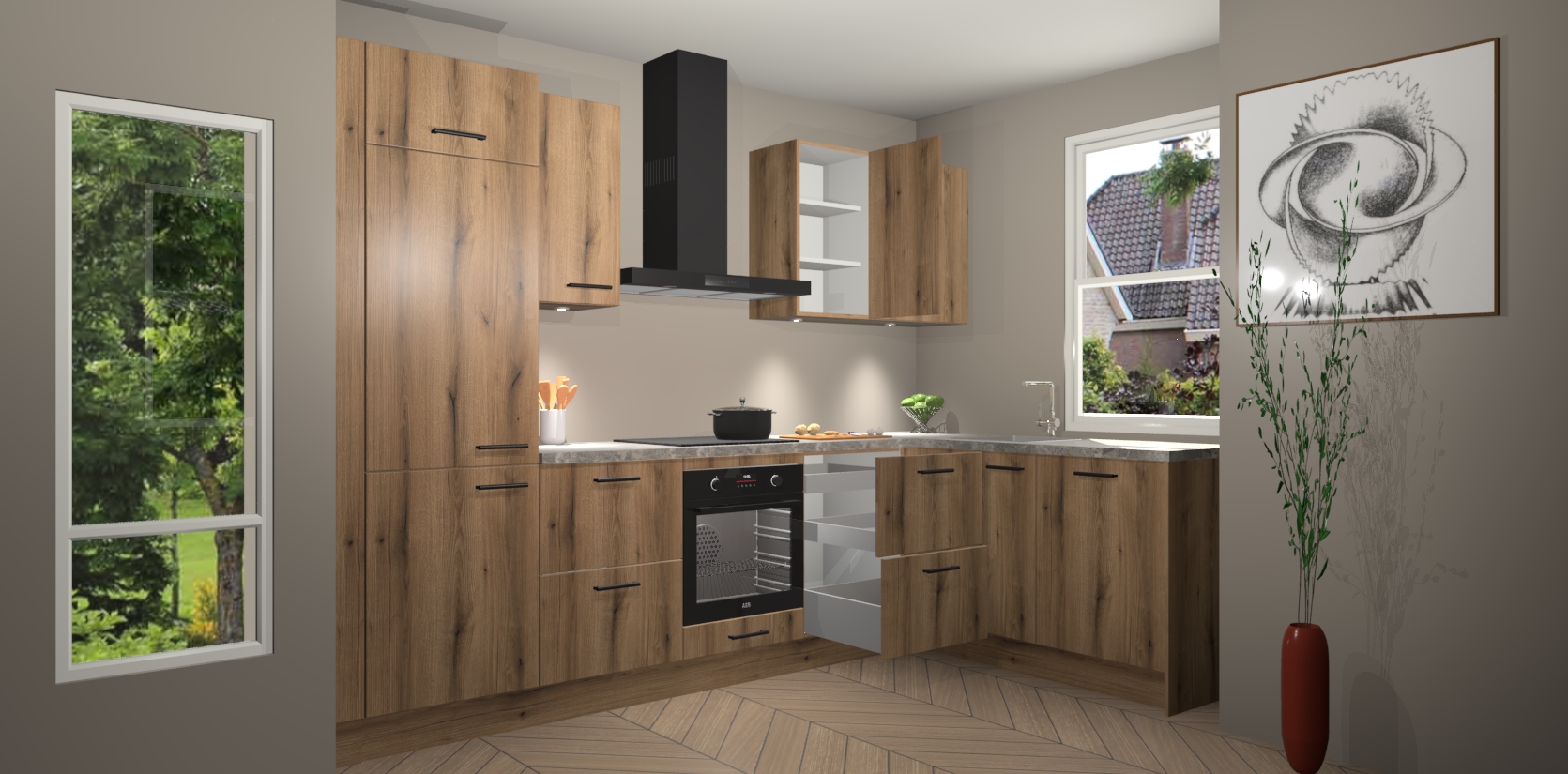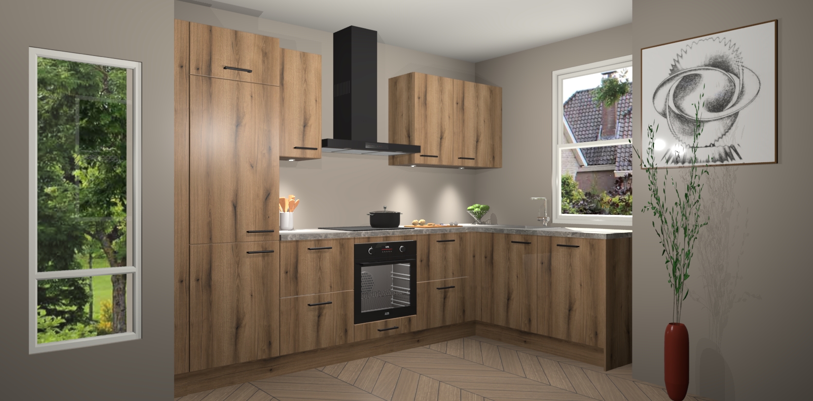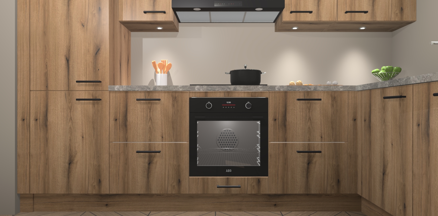 De Goud Eiken keuken Geneve is uitgerust met 5 inbouwapparaten - een oven, inductiekookplaat, afzuigkap, vaatwasser en koelkast - voor al uw kook- en bewaarbehoeftes. U kunt deze apparaten desgewenst eenvoudig upgraden naar AEG of de oven omruilen voor een combimagnetron na het plaatsen van uw bestelling. En met de soft close deuren, voldoende opbergruimte en kasten die voorgemonteerd worden geleverd, bent u in een mum van tijd klaar om heerlijke maaltijden te bereiden!