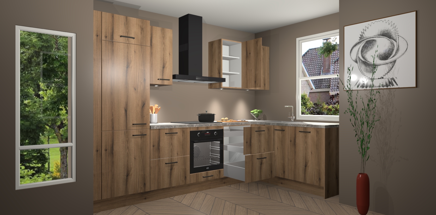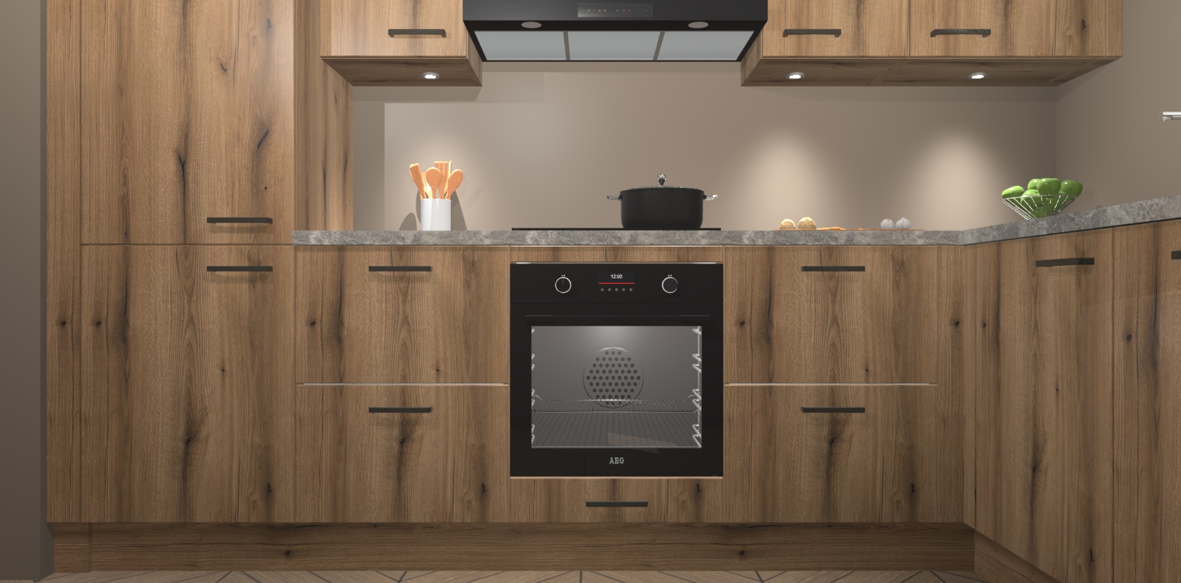 De Goud Eiken keuken Geneve is uitgerust met 5 inbouwapparaten - een oven, inductiekookplaat, afzuigkap, vaatwasser en koelkast - voor al uw kook- en bewaarbehoeftes. U kunt deze apparaten desgewenst eenvoudig upgraden naar AEG of de oven omruilen voor een combimagnetron na het plaatsen van uw bestelling. En met de soft close deuren, voldoende opbergruimte en kasten die voorgemonteerd worden geleverd, bent u in een mum van tijd klaar om heerlijke maaltijden te bereiden!