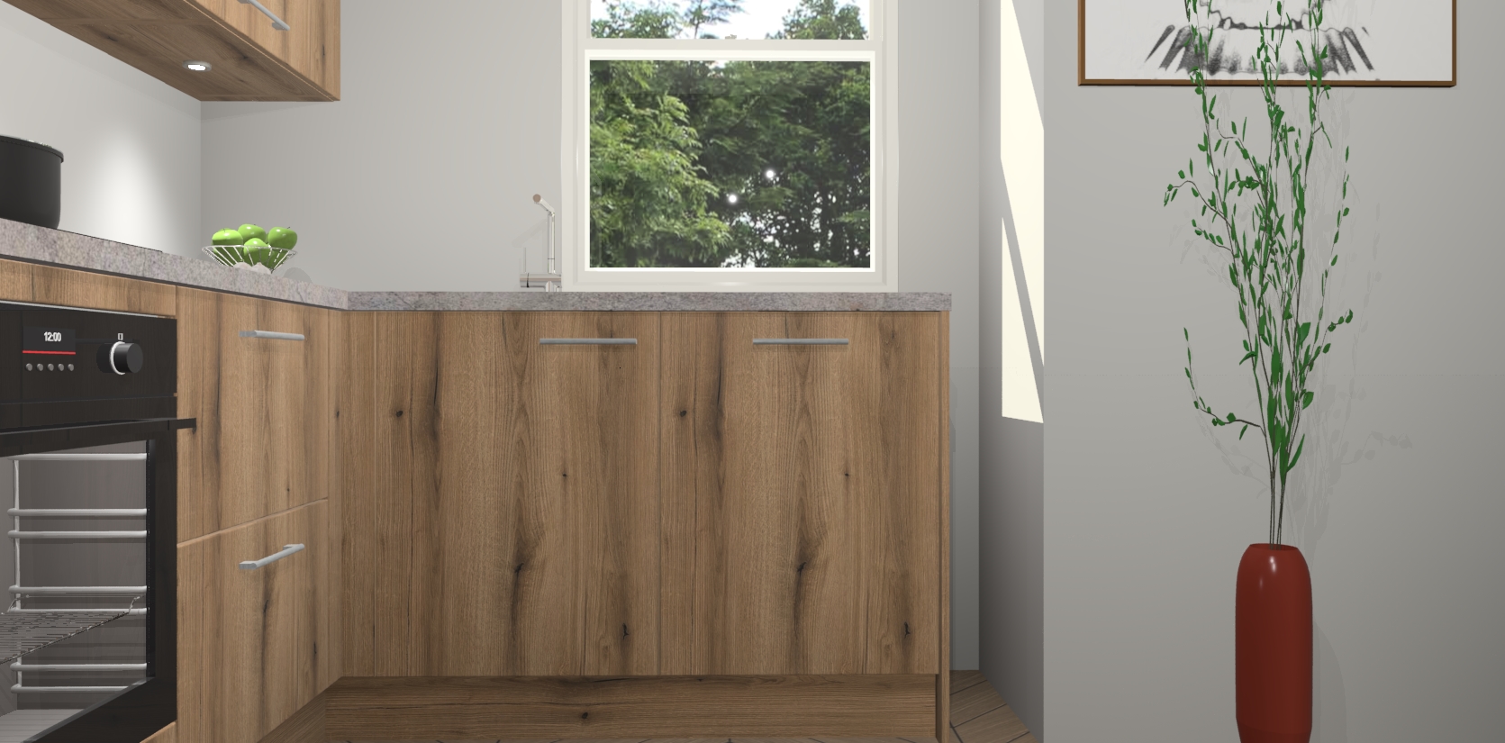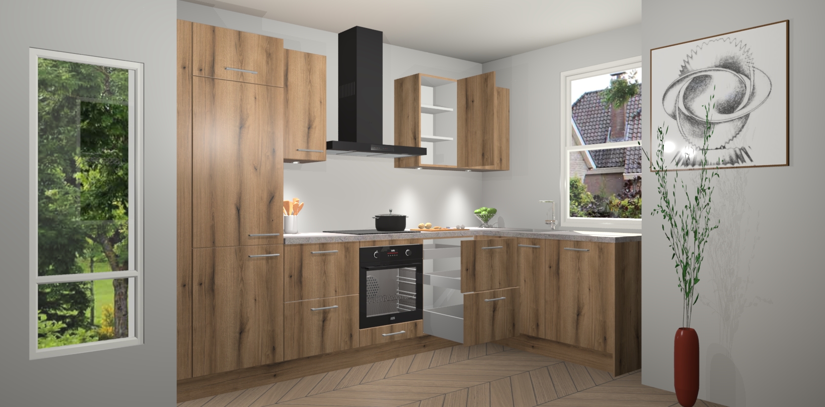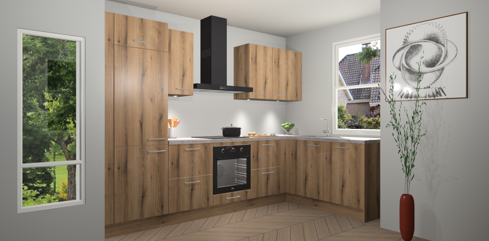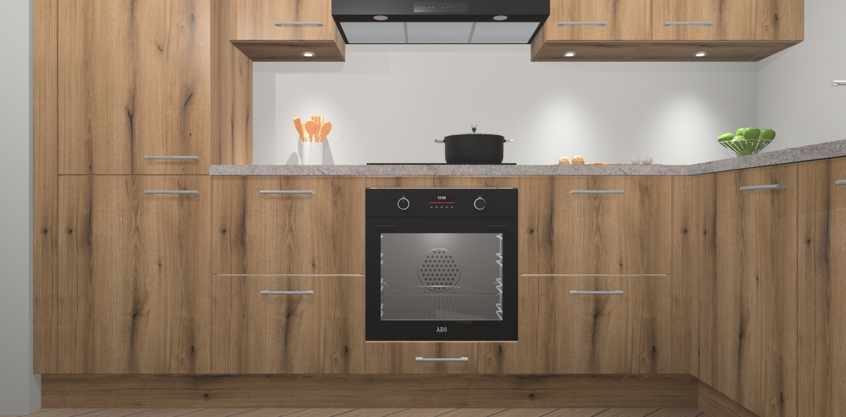 De Goud Eiken keuken Geneve is uitgerust met 5 inbouwapparaten - een oven, inductiekookplaat, afzuigkap, vaatwasser en koelkast - voor al uw kook- en bewaarbehoeftes. U kunt deze apparaten desgewenst eenvoudig upgraden naar AEG of de oven omruilen voor een combimagnetron na het plaatsen van uw bestelling. En met de soft close deuren, voldoende opbergruimte en kasten die voorgemonteerd worden geleverd, bent u in een mum van tijd klaar om heerlijke maaltijden te bereiden!