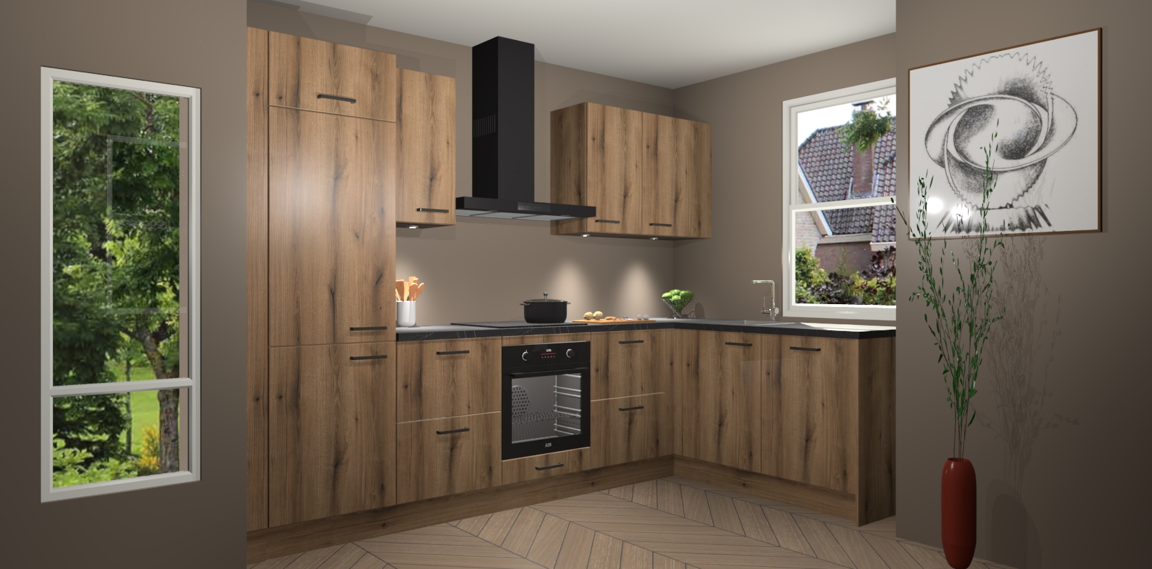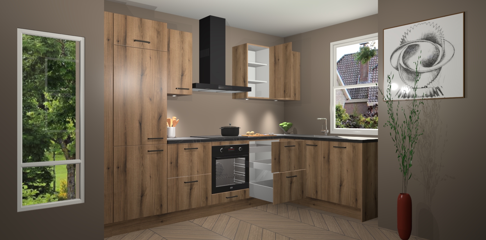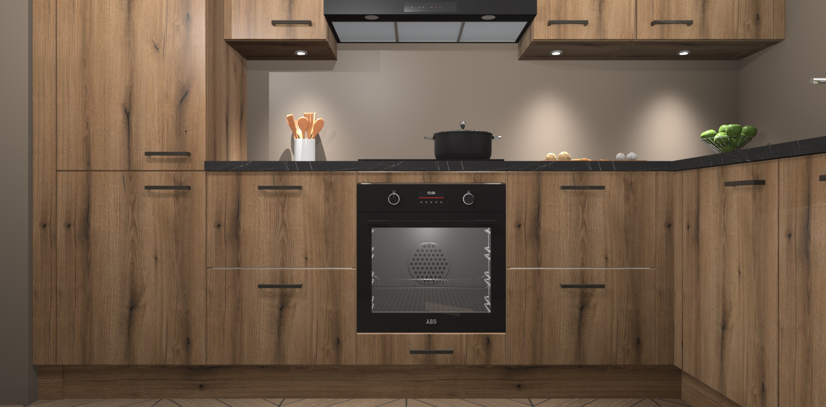 De Goud Eiken keuken Geneve is uitgerust met 5 inbouwapparaten - een oven, inductiekookplaat, afzuigkap, vaatwasser en koelkast - voor al uw kook- en bewaarbehoeftes. U kunt deze apparaten desgewenst eenvoudig upgraden naar AEG of de oven omruilen voor een combimagnetron na het plaatsen van uw bestelling. En met de soft close deuren, voldoende opbergruimte en kasten die voorgemonteerd worden geleverd, bent u in een mum van tijd klaar om heerlijke maaltijden te bereiden!