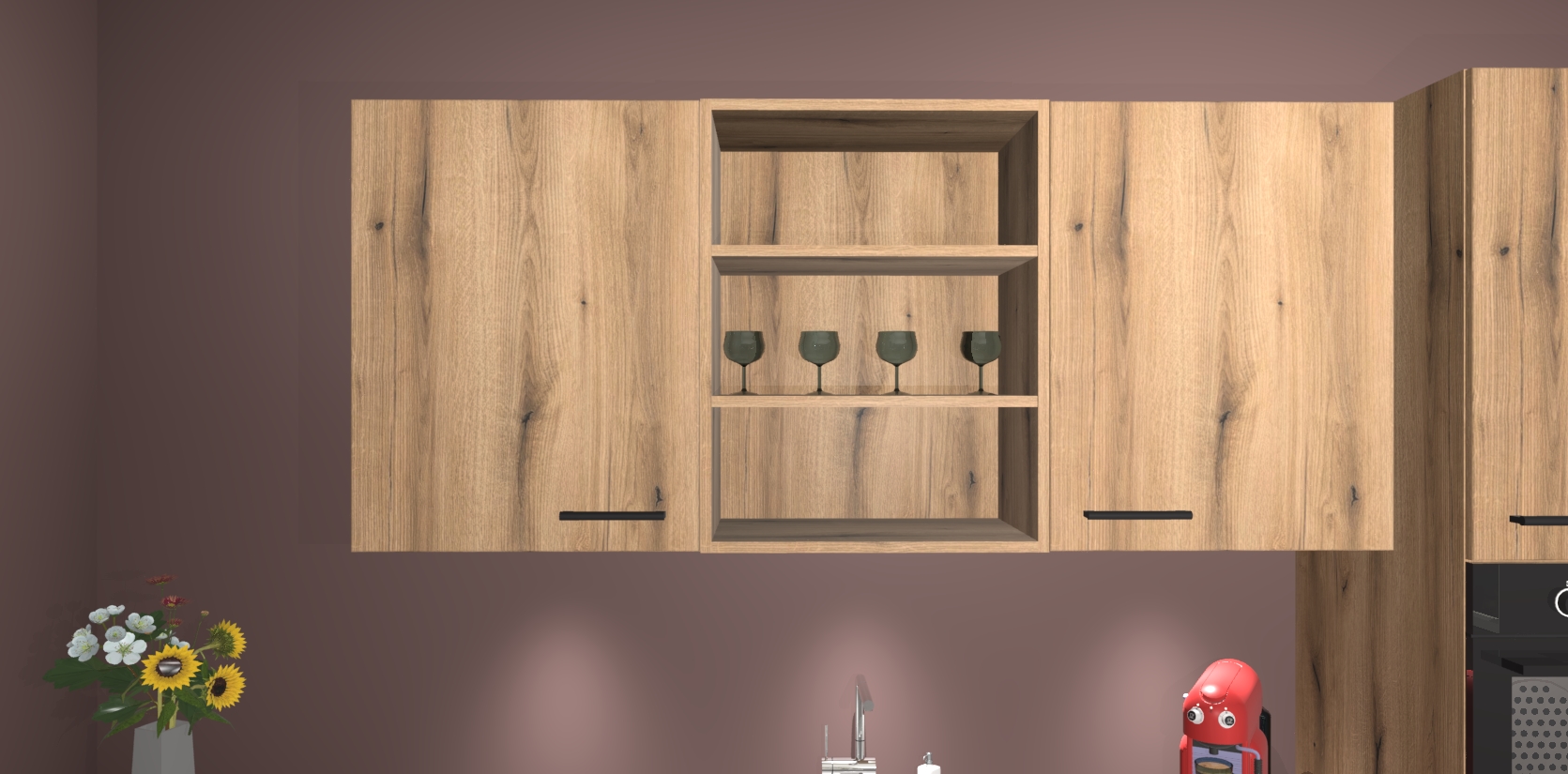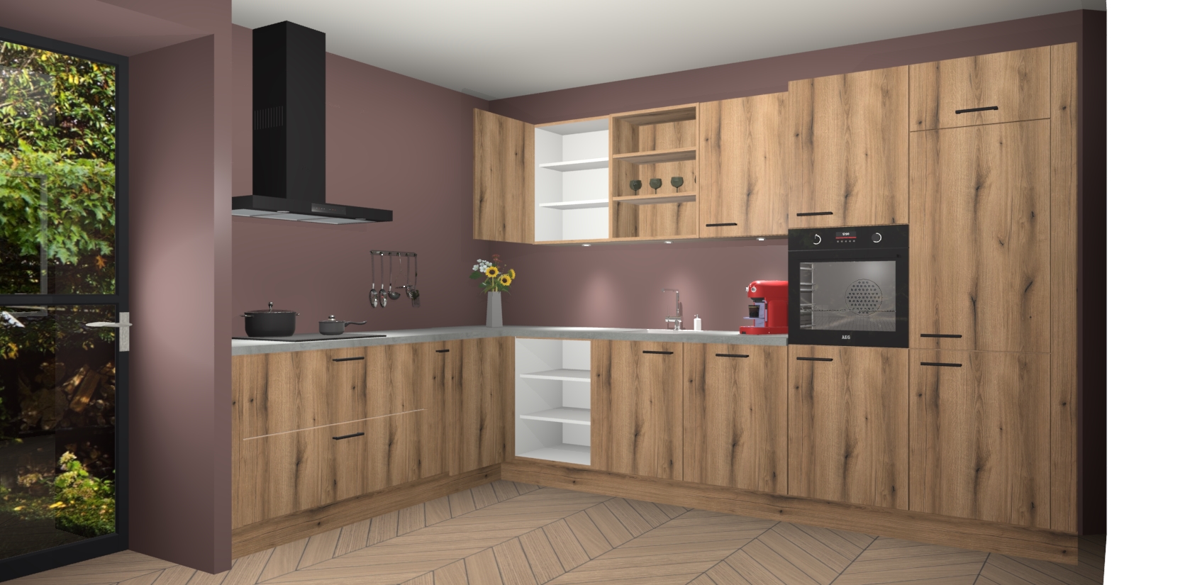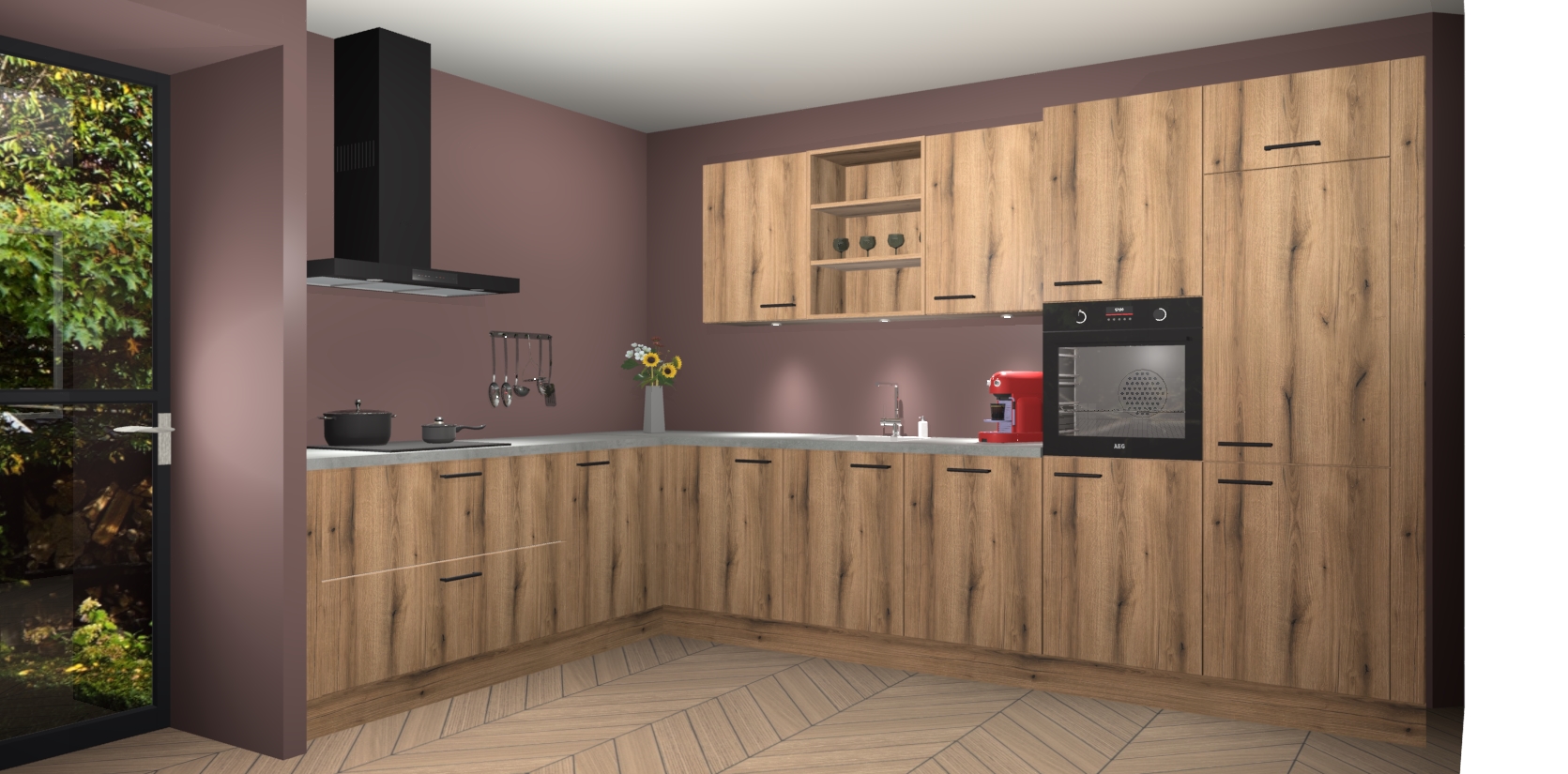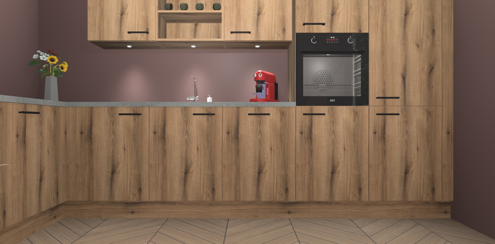 De Goud Eiken keuken Gotenburg is zo ontworpen dat u alle mogelijke vormen van opslagruimte kunt genieten. Bovendien heeft u meteen toegang tot vijf ingebouwde apparaten: een oven, inductiekookplaat, afzuigkap, vaatwasser en koelkast. Gewoon upgraden naar AEG na bestelling? Dit kan heel gemakkelijk worden geregeld. De deuren sluiten zacht dankzij zachtsluitende scharnieren en ze houden warmte vast terwijl ze uitzonderlijk stil blijven wanneer ze worden geopend of gesloten.