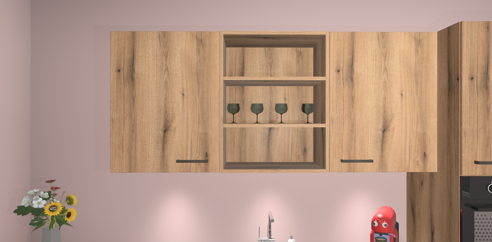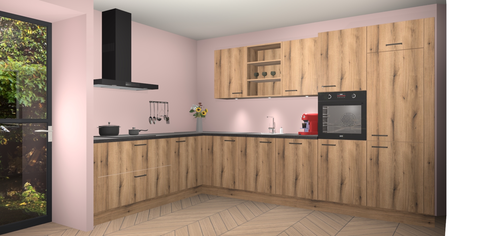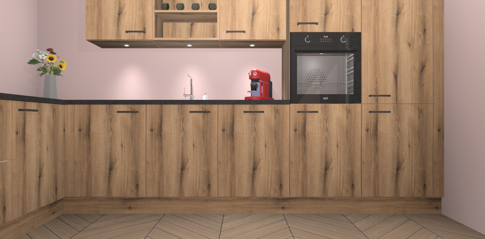 De Goud Eiken keuken Gotenburg is zo ontworpen dat u alle mogelijke vormen van opslagruimte kunt genieten. Bovendien heeft u meteen toegang tot vijf ingebouwde apparaten: een oven, inductiekookplaat, afzuigkap, vaatwasser en koelkast. Gewoon upgraden naar AEG na bestelling? Dit kan heel gemakkelijk worden geregeld. De deuren sluiten zacht dankzij zachtsluitende scharnieren en ze houden warmte vast terwijl ze uitzonderlijk stil blijven wanneer ze worden geopend of gesloten.
