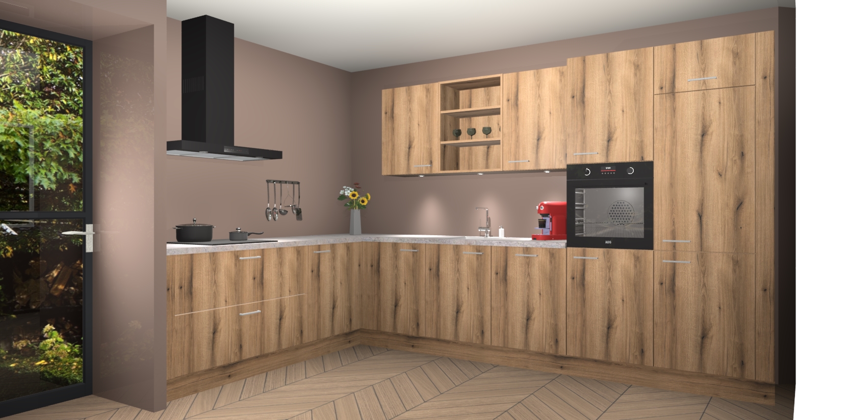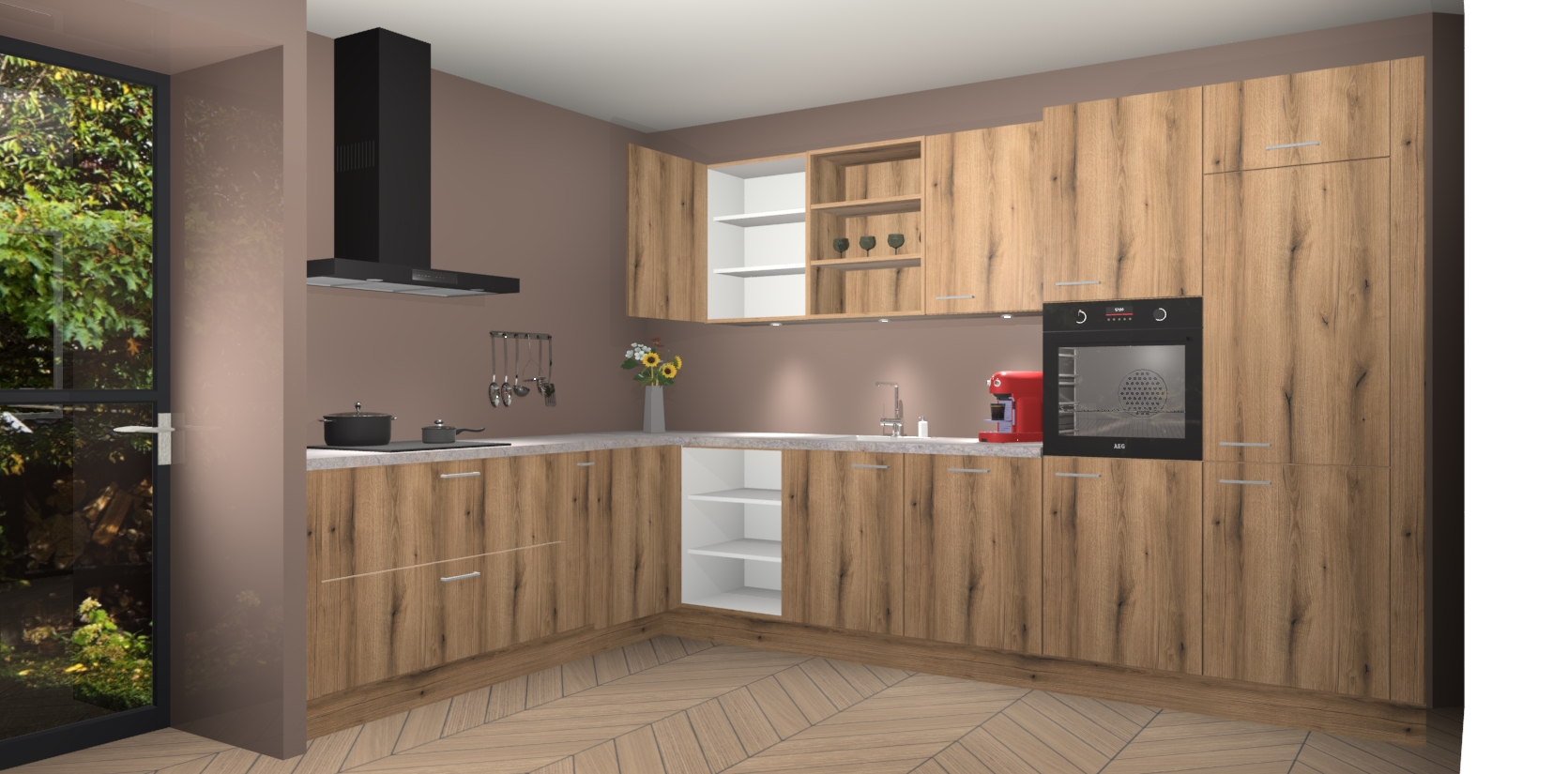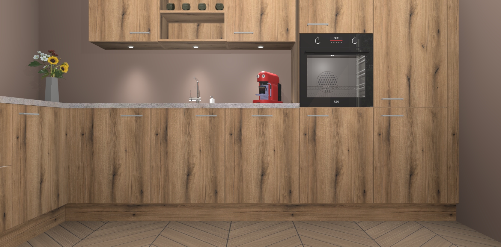 De Goud Eiken keuken Gotenburg is zo ontworpen dat u alle mogelijke vormen van opslagruimte kunt genieten. Bovendien heeft u meteen toegang tot vijf ingebouwde apparaten: een oven, inductiekookplaat, afzuigkap, vaatwasser en koelkast. Gewoon upgraden naar AEG na bestelling? Dit kan heel gemakkelijk worden geregeld. De deuren sluiten zacht dankzij zachtsluitende scharnieren en ze houden warmte vast terwijl ze uitzonderlijk stil blijven wanneer ze worden geopend of gesloten.