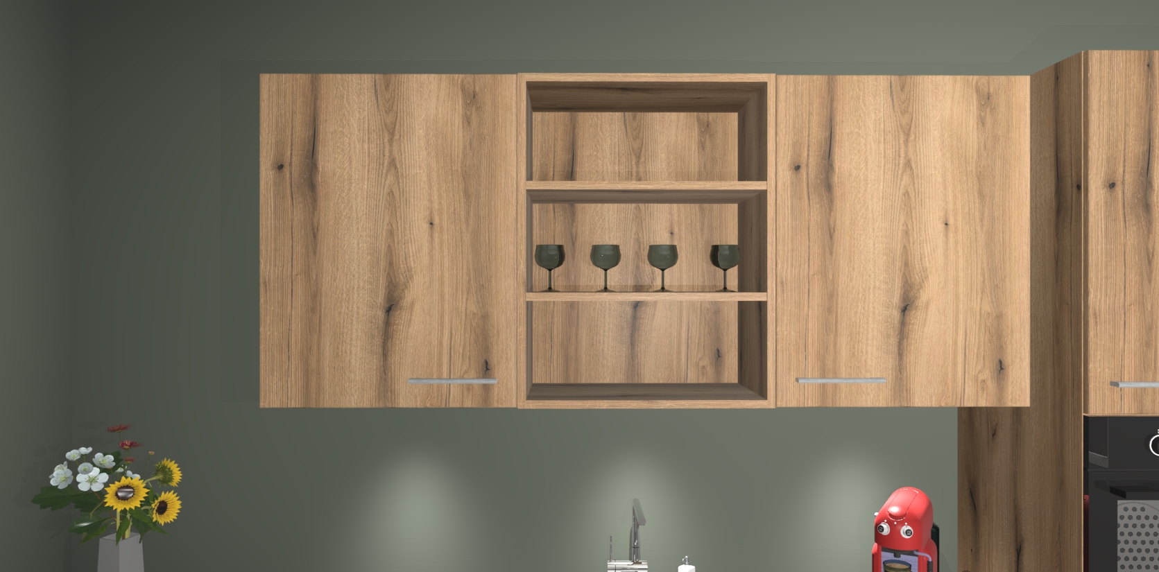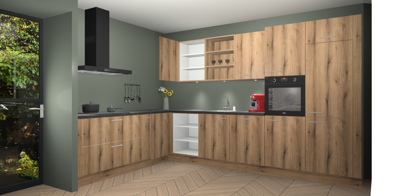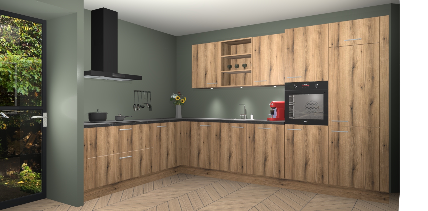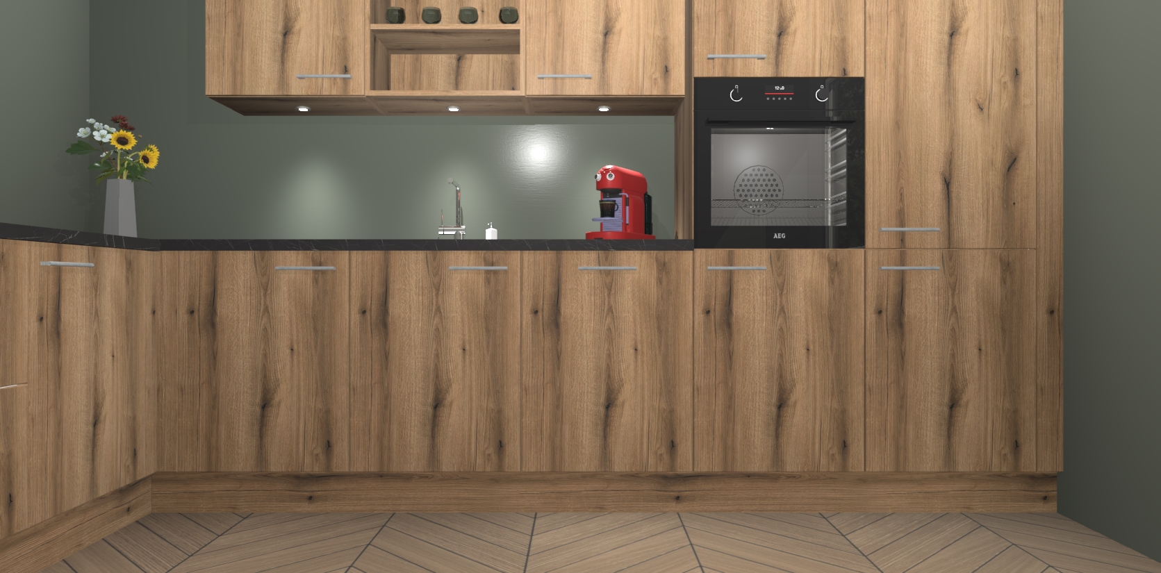 De Goud Eiken keuken Gotenburg is zo ontworpen dat u alle mogelijke vormen van opslagruimte kunt genieten. Bovendien heeft u meteen toegang tot vijf ingebouwde apparaten: een oven, inductiekookplaat, afzuigkap, vaatwasser en koelkast. Gewoon upgraden naar AEG na bestelling? Dit kan heel gemakkelijk worden geregeld. De deuren sluiten zacht dankzij zachtsluitende scharnieren en ze houden warmte vast terwijl ze uitzonderlijk stil blijven wanneer ze worden geopend of gesloten.