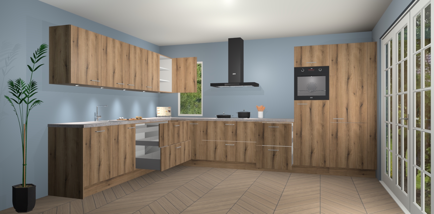 Heeft u nog apparatuur nodig? Geen probleem: de goud eiken keuken Harare bevat vijf ingebouwde apparaten - een oven, inductiekookplaat, afzuigkap, vaatwasser en koelkast - die gemakkelijk kunnen worden bijgewerkt naar AEG na bestelling. En als dat nog niet genoeg is; onze kasten worden pre-geassembleerd geleverd en zijn verkrijgbaar tegen een vastgeroeste lage prijs! U hoeft nooit meer te zoeken naar goede kwaliteit en service want onze producten hebben echt Duitse kwaliteit.