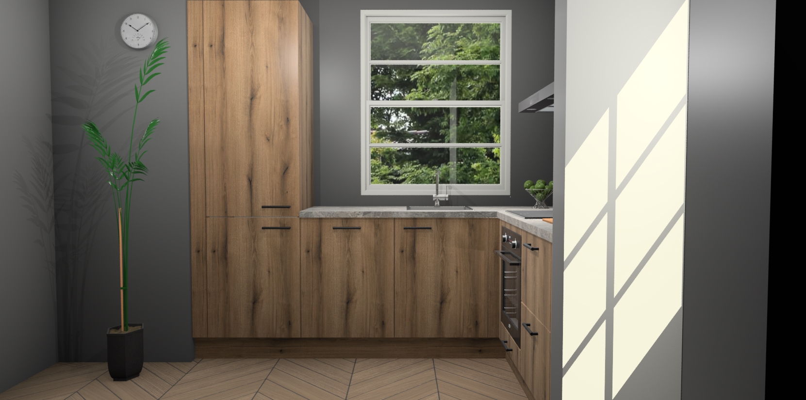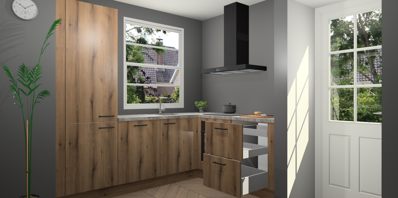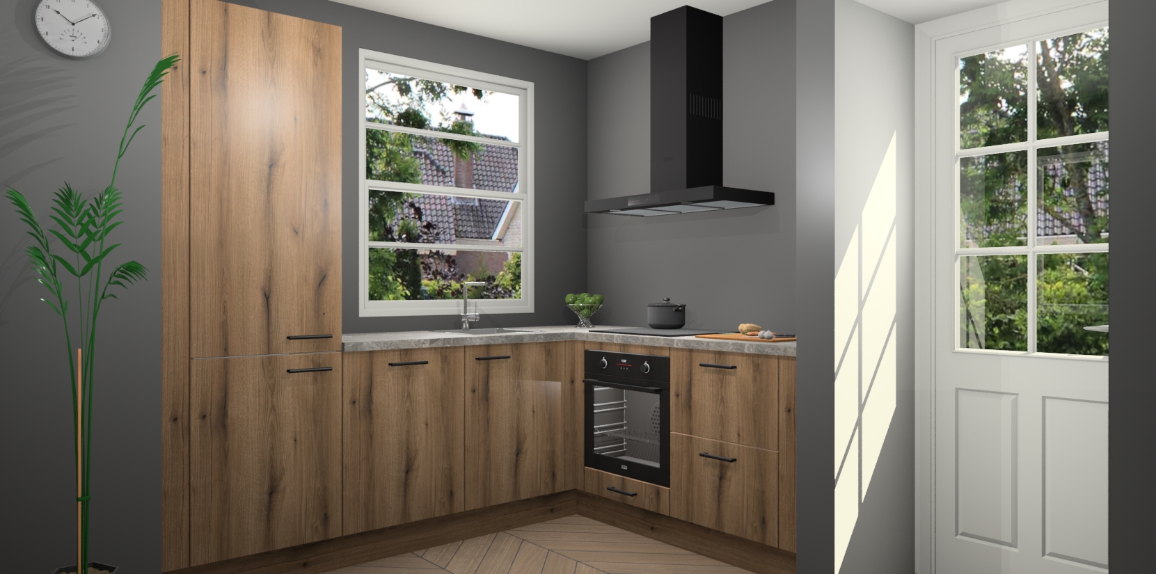 Wilt u een echte aanwinst voor uw keuken, maar bent u op zoek naar iets specialers dan de standaardkeukens? Kies dan voor de Goud Eiken keuken Harbin! Dit prachtige hoekkeukenontwerp geeft u alle ruimte om optimaal te genieten van heerlijk koken. Het uitmuntende afwerkingsniveau, de fraaie houtstructuur en de sfeervolle zwarte grepen maken van de Goud Eiken keuken Harbin de perfecte keuze voor zowel enthousiaste thuiskoks als design-minded interieurliefhebbers.