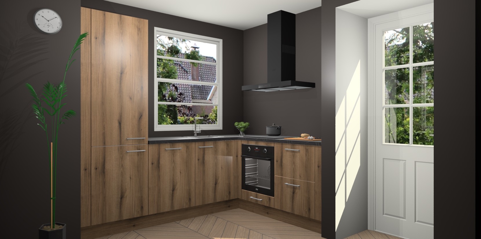 Wilt u een echte aanwinst voor uw keuken, maar bent u op zoek naar iets specialers dan de standaardkeukens? Kies dan voor de Goud Eiken keuken Harbin! Dit prachtige hoekkeukenontwerp geeft u alle ruimte om optimaal te genieten van heerlijk koken. Het uitmuntende afwerkingsniveau, de fraaie houtstructuur en de sfeervolle zwarte grepen maken van de Goud Eiken keuken Harbin de perfecte keuze voor zowel enthousiaste thuiskoks als design-minded interieurliefhebbers.