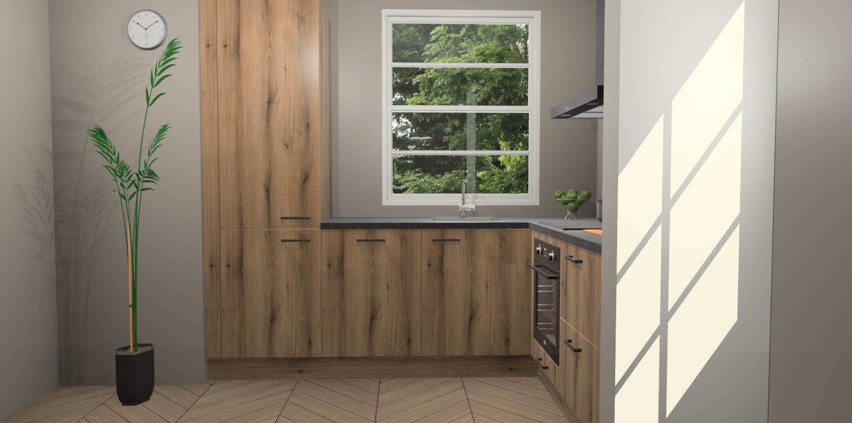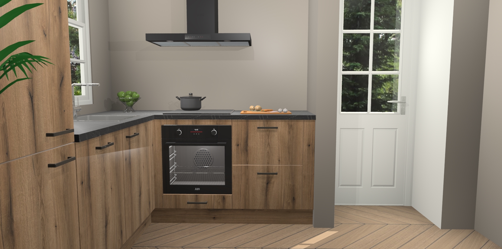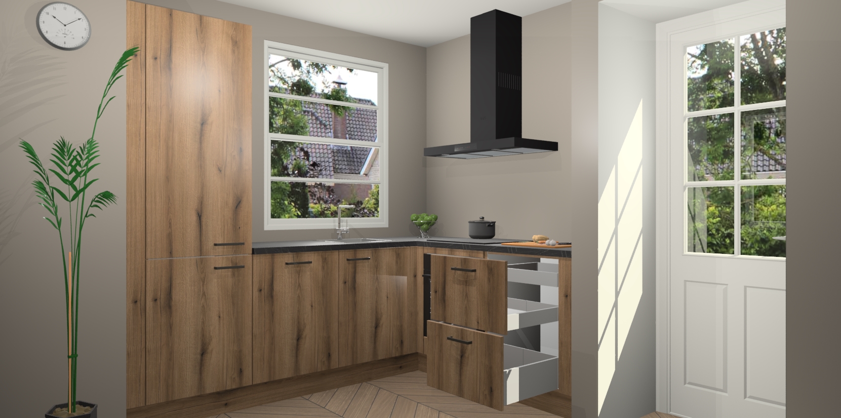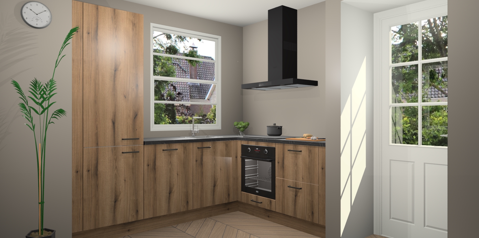 Wilt u een echte aanwinst voor uw keuken, maar bent u op zoek naar iets specialers dan de standaardkeukens? Kies dan voor de Goud Eiken keuken Harbin! Dit prachtige hoekkeukenontwerp geeft u alle ruimte om optimaal te genieten van heerlijk koken. Het uitmuntende afwerkingsniveau, de fraaie houtstructuur en de sfeervolle zwarte grepen maken van de Goud Eiken keuken Harbin de perfecte keuze voor zowel enthousiaste thuiskoks als design-minded interieurliefhebbers.