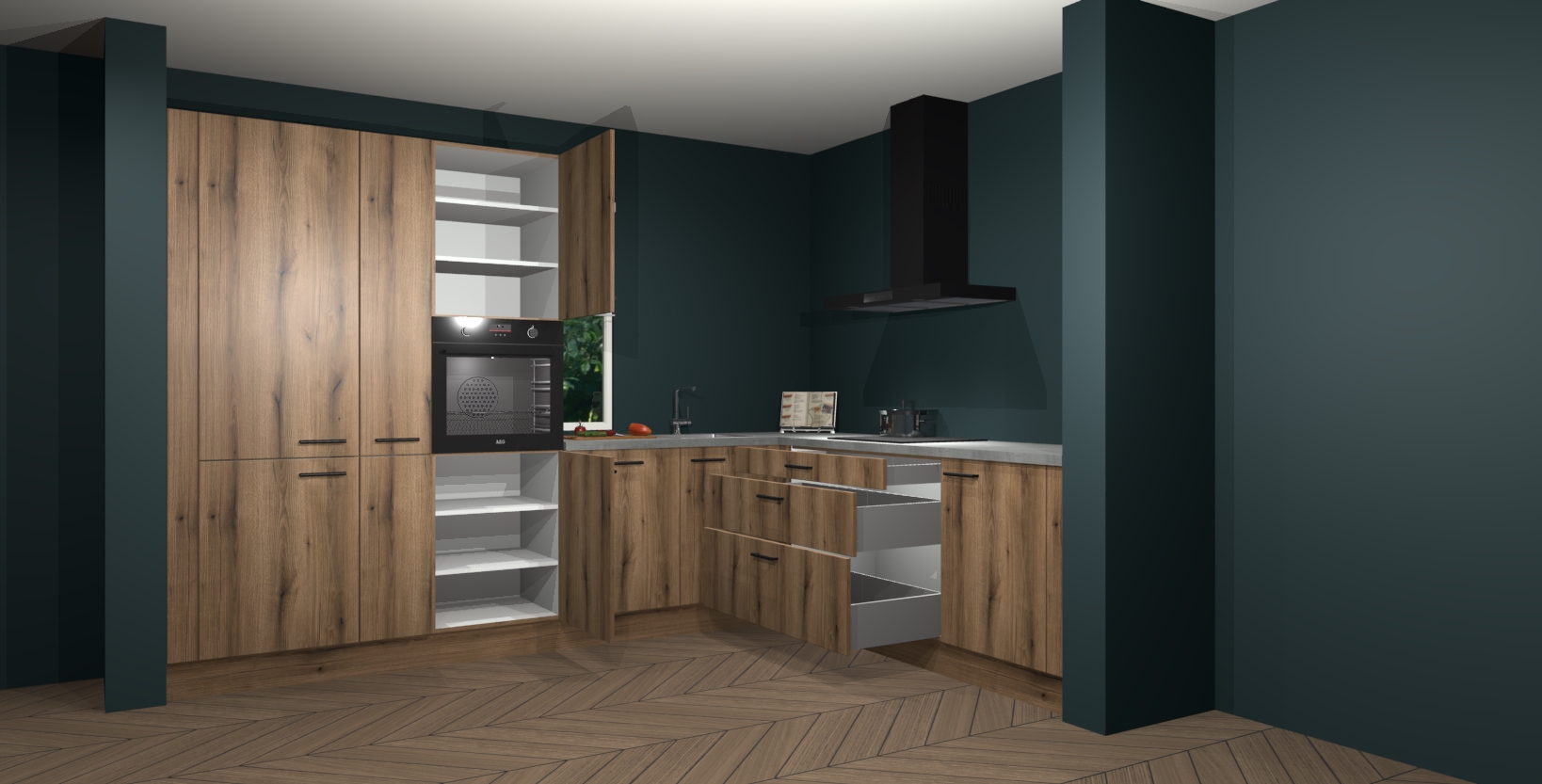 Met een modern, tijdloos design en ruime opslagruimte, zult u zich in no-time thuis voelen in uw nieuwe keuken. Uw leven wordt eenvoudiger met de soft-close deuren die voor het ultieme stille comfort zorgen - geen geluid dat u stoort terwijl u kookt. Ook is de keuken voorzien van 5 ingebouwde apparaten: een oven, inductie kookplaat, afzuigkap, vaatwasser en koelkast. Deze kunnen gemakkelijk na bestelling worden bijgewerkt naar AEG - waardoor uw luxe ervaring compleet is.
