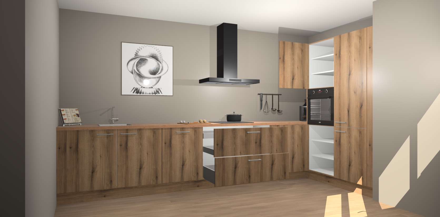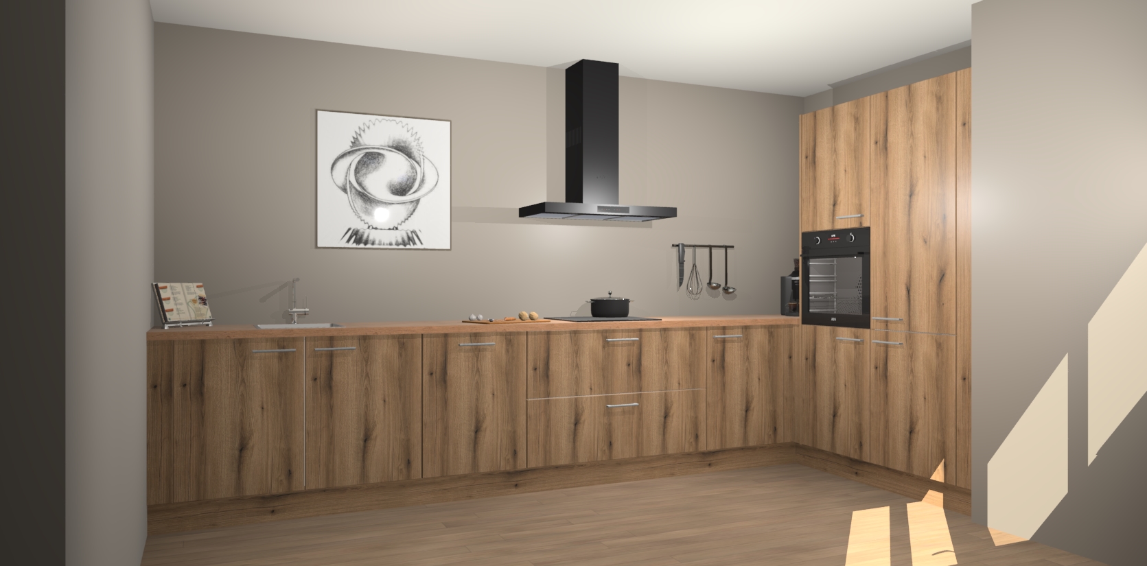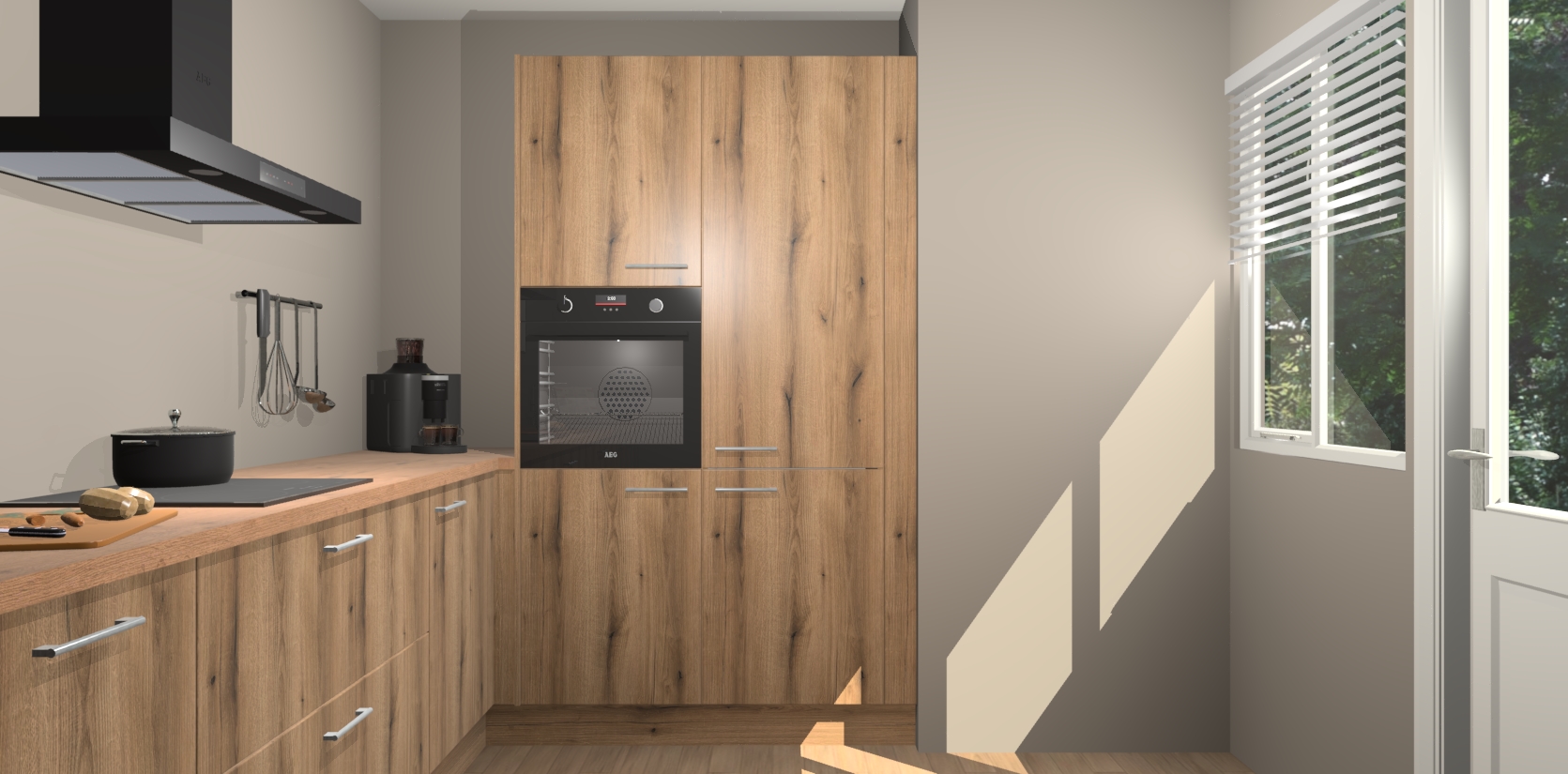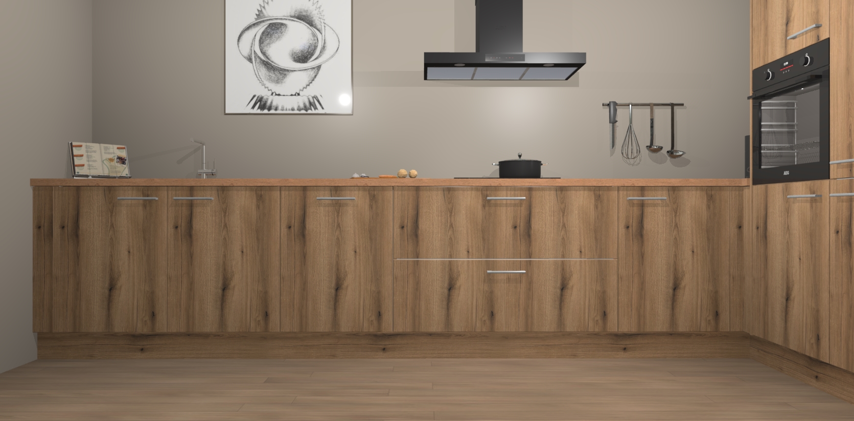 Welkom bij de Goud Eiken keuken Khao Lak. Deze prachtige keuken zal de komende jaren het middelpunt van de belangstelling in uw huis zijn. Uitgerust met vijf inbouwapparaten komt u nooit kookgereedschap tekort. Bovendien geeft de warme houtlook elke ruimte een uitnodigende en tijdloze uitstraling.