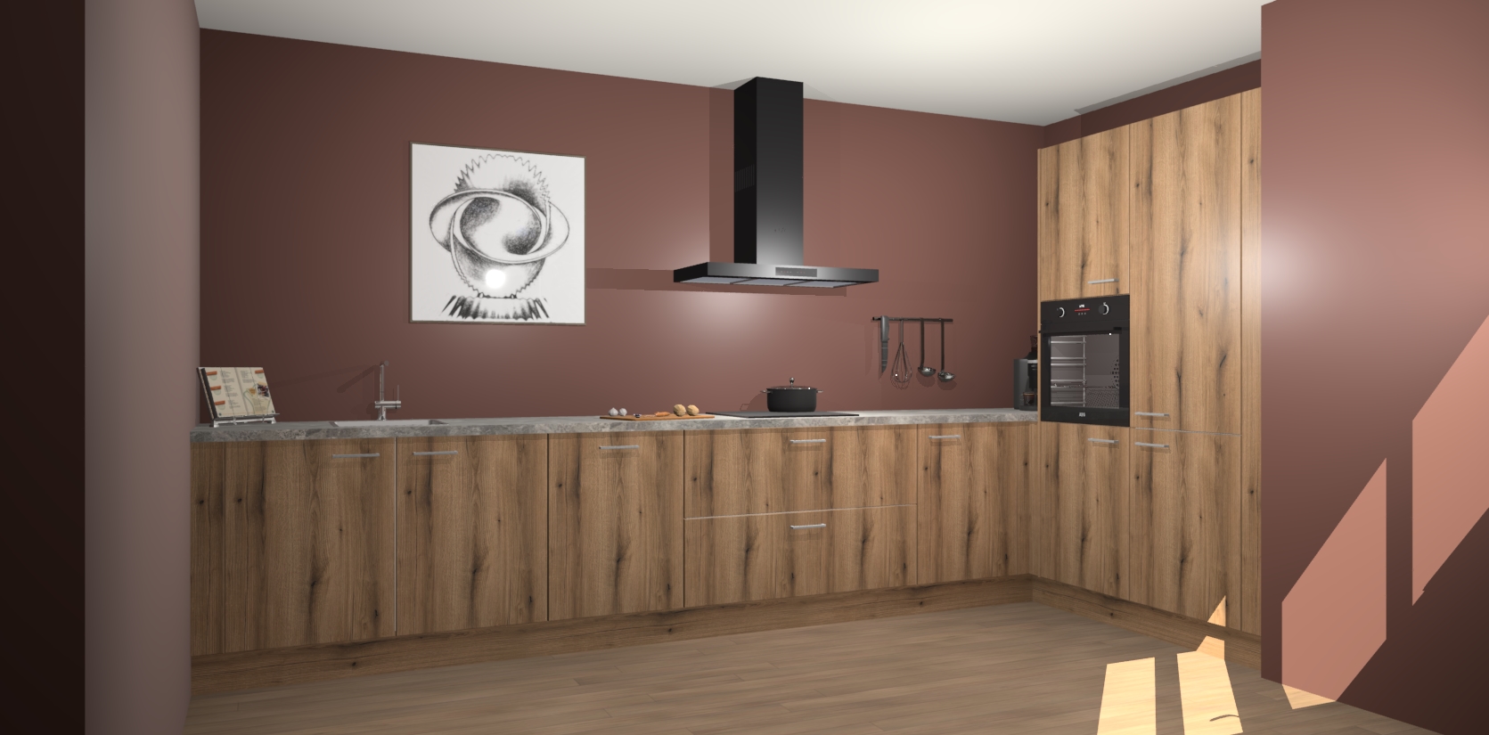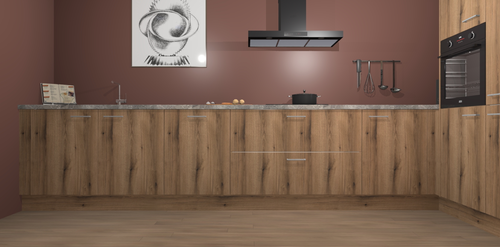 Welkom bij de Goud Eiken keuken Khao Lak. Deze prachtige keuken zal de komende jaren het middelpunt van de belangstelling in uw huis zijn. Uitgerust met vijf inbouwapparaten komt u nooit kookgereedschap tekort. Bovendien geeft de warme houtlook elke ruimte een uitnodigende en tijdloze uitstraling.