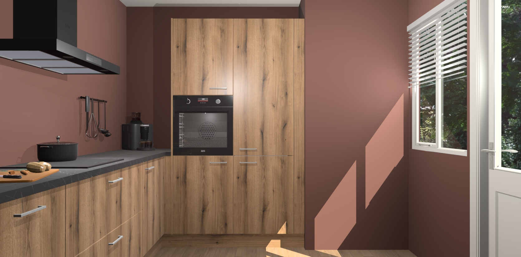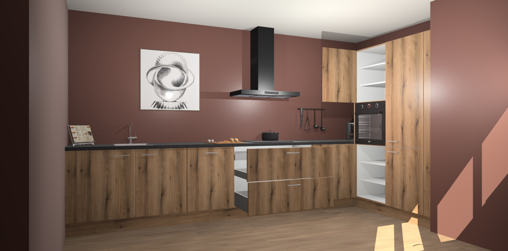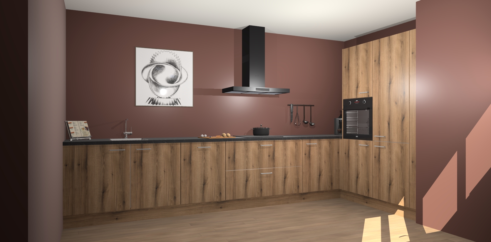Welkom bij de Goud Eiken keuken Khao Lak. Deze prachtige keuken zal de komende jaren het middelpunt van de belangstelling in uw huis zijn. Uitgerust met vijf inbouwapparaten komt u nooit kookgereedschap tekort. Bovendien geeft de warme houtlook elke ruimte een uitnodigende en tijdloze uitstraling.