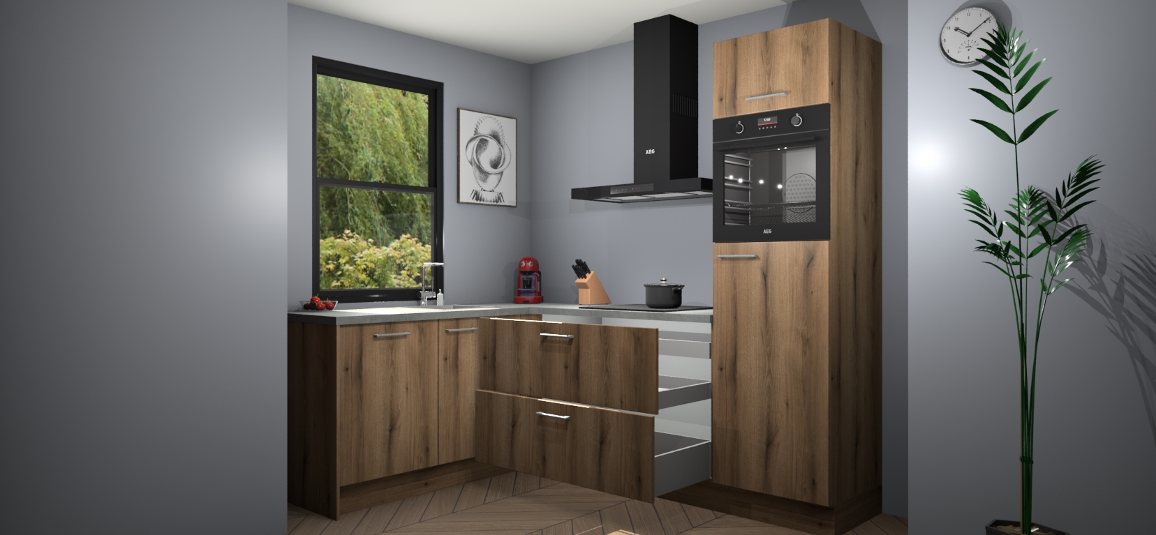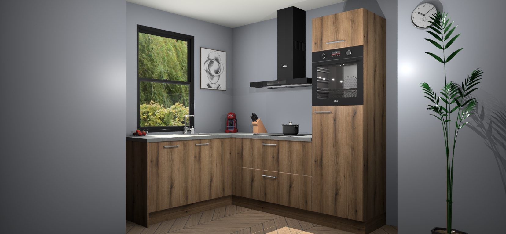Deze prachtige hoekkeuken heeft alle benodigdheden om uw droomkook- en eetruimte compleet te maken. De Goud Eiken kasten bieden een echo van raffinement, terwijl de 5 inbouwapparaten genoeg opties bieden voor het bereiden van heerlijke maaltijden. De oven, inductiekookplaat, afzuigkap, vaatwasser en koelkast zorgen ervoor dat u tijd in de keuken zo efficiënt mogelijk verloopt, terwijl ze ook dat extra vleugje luxe bieden.
