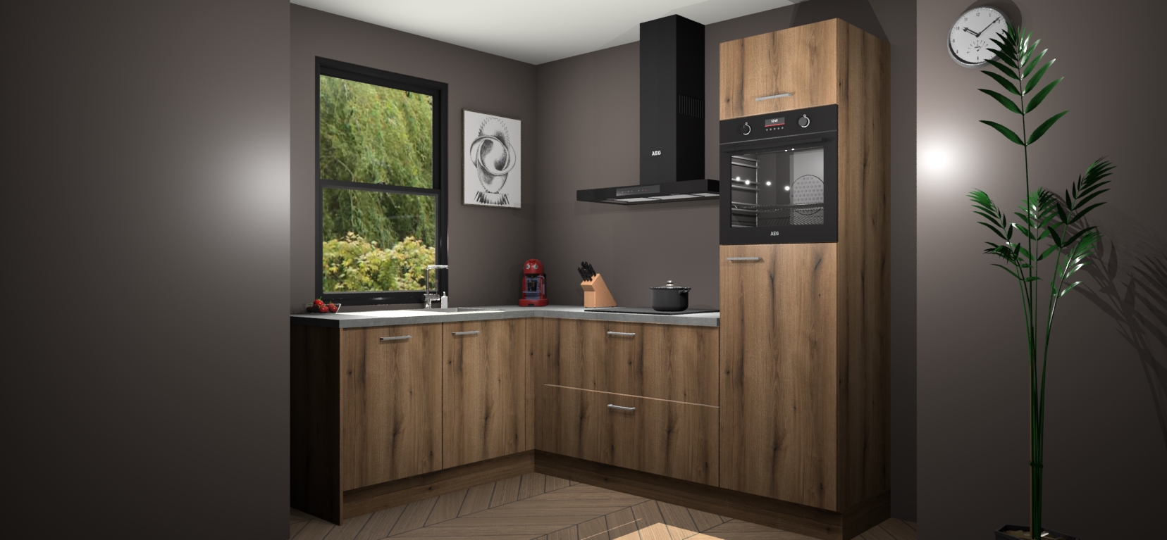 Deze prachtige hoekkeuken heeft alle benodigdheden om uw droomkook- en eetruimte compleet te maken. De Goud Eiken kasten bieden een echo van raffinement, terwijl de 5 inbouwapparaten genoeg opties bieden voor het bereiden van heerlijke maaltijden. De oven, inductiekookplaat, afzuigkap, vaatwasser en koelkast zorgen ervoor dat u tijd in de keuken zo efficiënt mogelijk verloopt, terwijl ze ook dat extra vleugje luxe bieden.