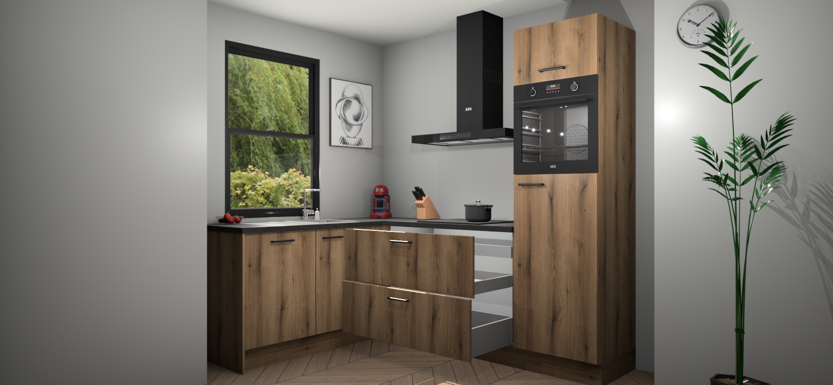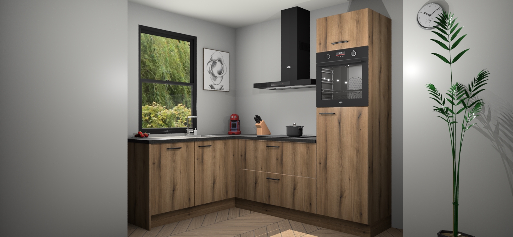 Deze prachtige hoekkeuken heeft alle benodigdheden om uw droomkook- en eetruimte compleet te maken. De Goud Eiken kasten bieden een echo van raffinement, terwijl de 5 inbouwapparaten genoeg opties bieden voor het bereiden van heerlijke maaltijden. De oven, inductiekookplaat, afzuigkap, vaatwasser en koelkast zorgen ervoor dat u tijd in de keuken zo efficiënt mogelijk verloopt, terwijl ze ook dat extra vleugje luxe bieden.