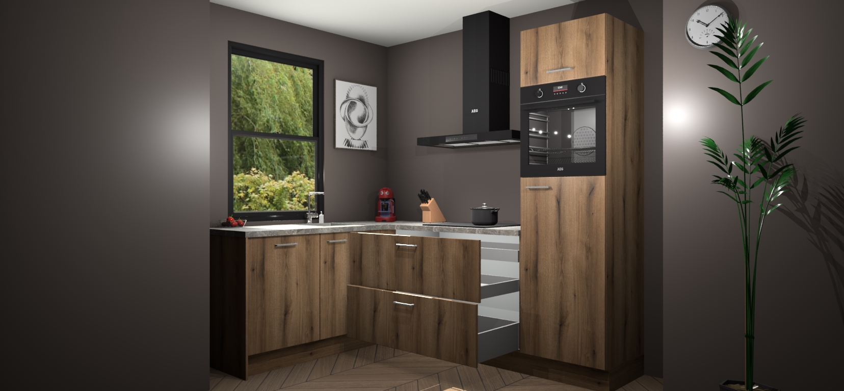 Deze prachtige hoekkeuken heeft alle benodigdheden om uw droomkook- en eetruimte compleet te maken. De Goud Eiken kasten bieden een echo van raffinement, terwijl de 5 inbouwapparaten genoeg opties bieden voor het bereiden van heerlijke maaltijden. De oven, inductiekookplaat, afzuigkap, vaatwasser en koelkast zorgen ervoor dat u tijd in de keuken zo efficiënt mogelijk verloopt, terwijl ze ook dat extra vleugje luxe bieden.