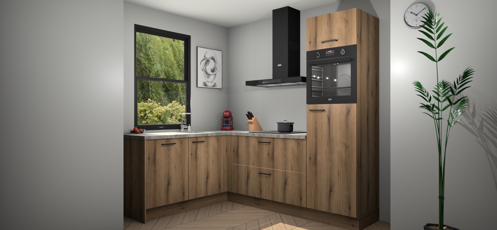 Deze prachtige hoekkeuken heeft alle benodigdheden om uw droomkook- en eetruimte compleet te maken. De Goud Eiken kasten bieden een echo van raffinement, terwijl de 5 inbouwapparaten genoeg opties bieden voor het bereiden van heerlijke maaltijden. De oven, inductiekookplaat, afzuigkap, vaatwasser en koelkast zorgen ervoor dat u tijd in de keuken zo efficiënt mogelijk verloopt, terwijl ze ook dat extra vleugje luxe bieden.