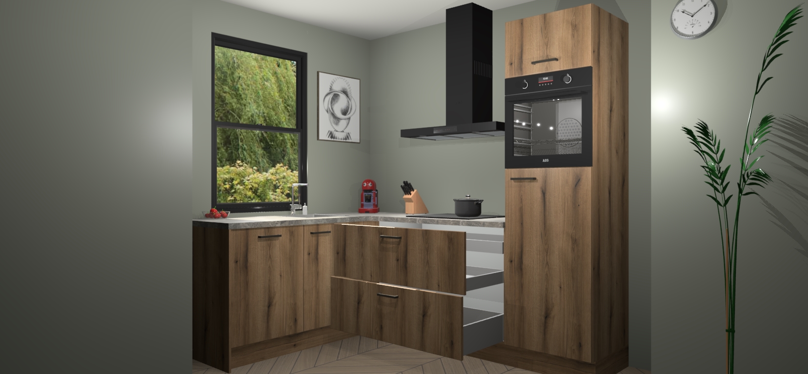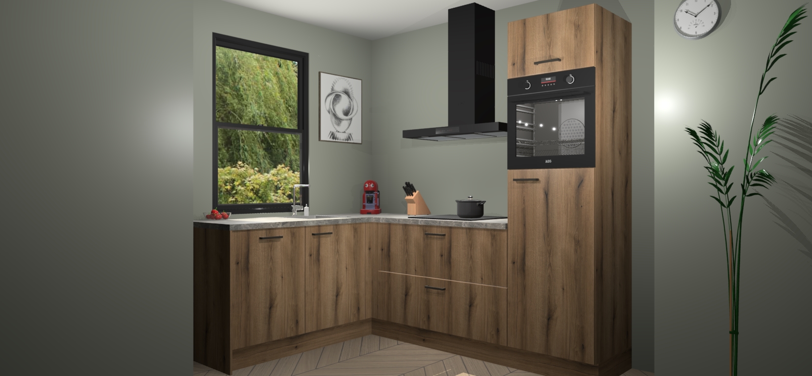 Deze prachtige hoekkeuken heeft alle benodigdheden om uw droomkook- en eetruimte compleet te maken. De Goud Eiken kasten bieden een echo van raffinement, terwijl de 5 inbouwapparaten genoeg opties bieden voor het bereiden van heerlijke maaltijden. De oven, inductiekookplaat, afzuigkap, vaatwasser en koelkast zorgen ervoor dat u tijd in de keuken zo efficiënt mogelijk verloopt, terwijl ze ook dat extra vleugje luxe bieden.