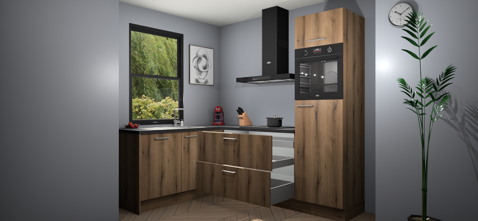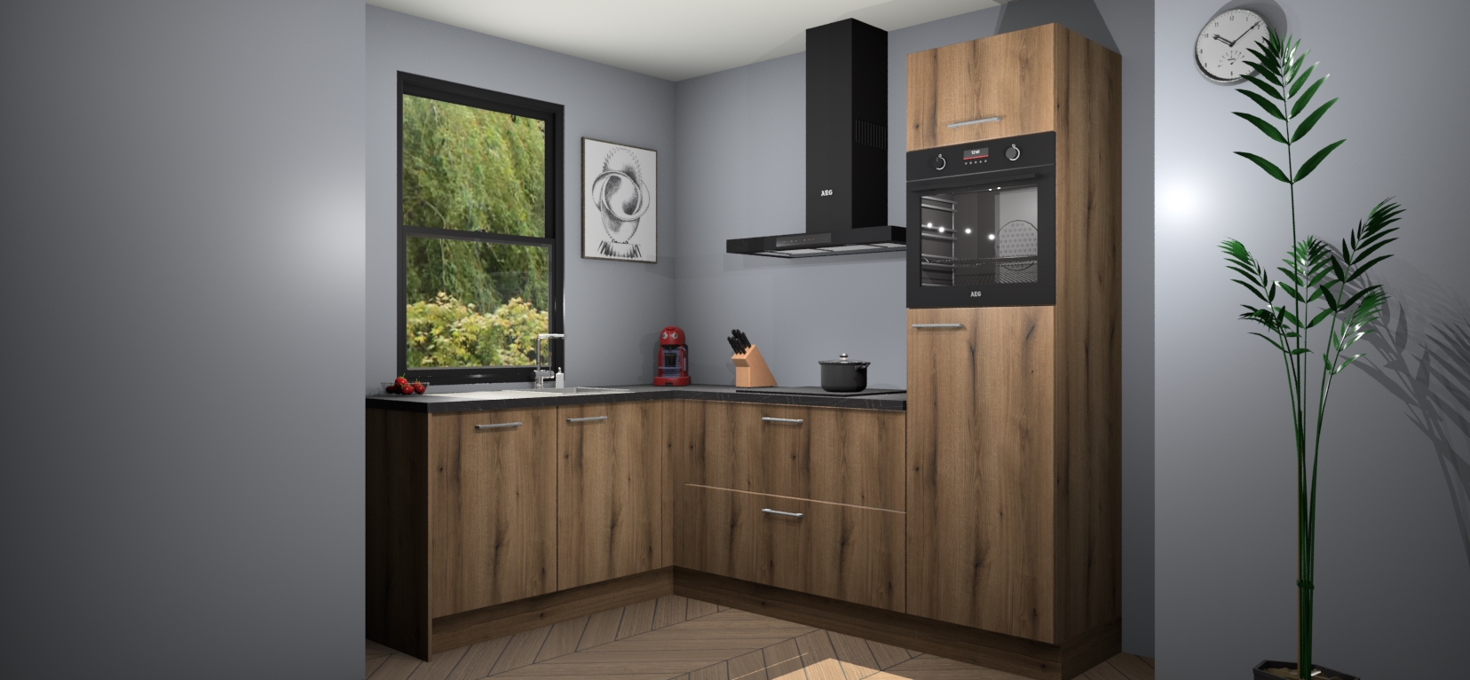 Deze prachtige hoekkeuken heeft alle benodigdheden om uw droomkook- en eetruimte compleet te maken. De Goud Eiken kasten bieden een echo van raffinement, terwijl de 5 inbouwapparaten genoeg opties bieden voor het bereiden van heerlijke maaltijden. De oven, inductiekookplaat, afzuigkap, vaatwasser en koelkast zorgen ervoor dat u tijd in de keuken zo efficiënt mogelijk verloopt, terwijl ze ook dat extra vleugje luxe bieden.
