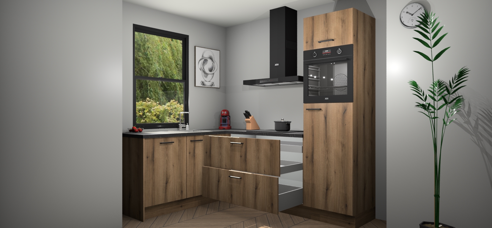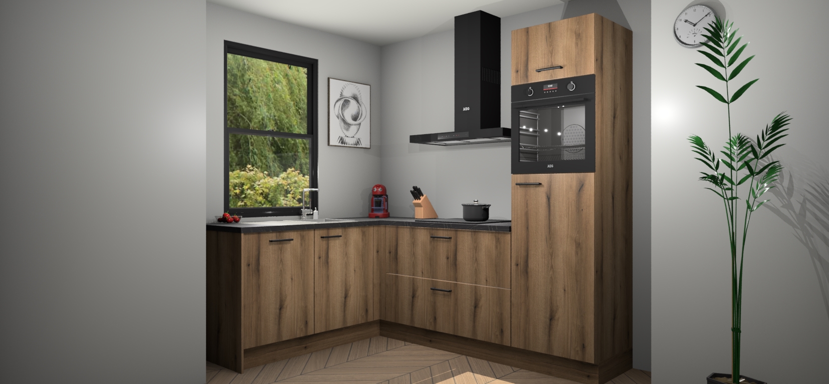 Deze prachtige hoekkeuken heeft alle benodigdheden om uw droomkook- en eetruimte compleet te maken. De Goud Eiken kasten bieden een echo van raffinement, terwijl de 5 inbouwapparaten genoeg opties bieden voor het bereiden van heerlijke maaltijden. De oven, inductiekookplaat, afzuigkap, vaatwasser en koelkast zorgen ervoor dat u tijd in de keuken zo efficiënt mogelijk verloopt, terwijl ze ook dat extra vleugje luxe bieden.