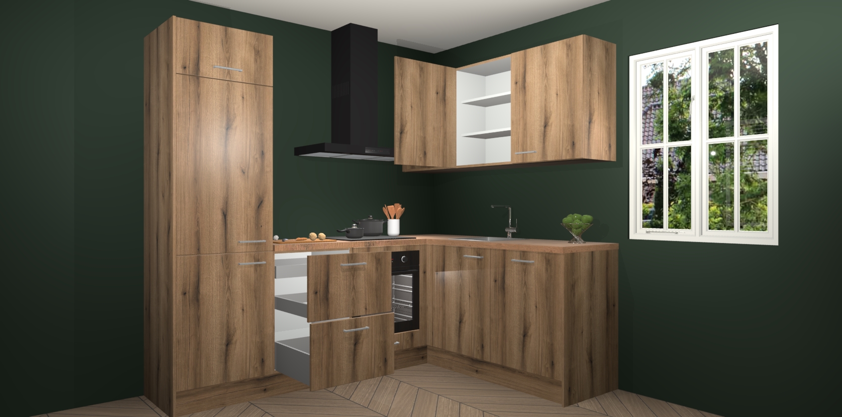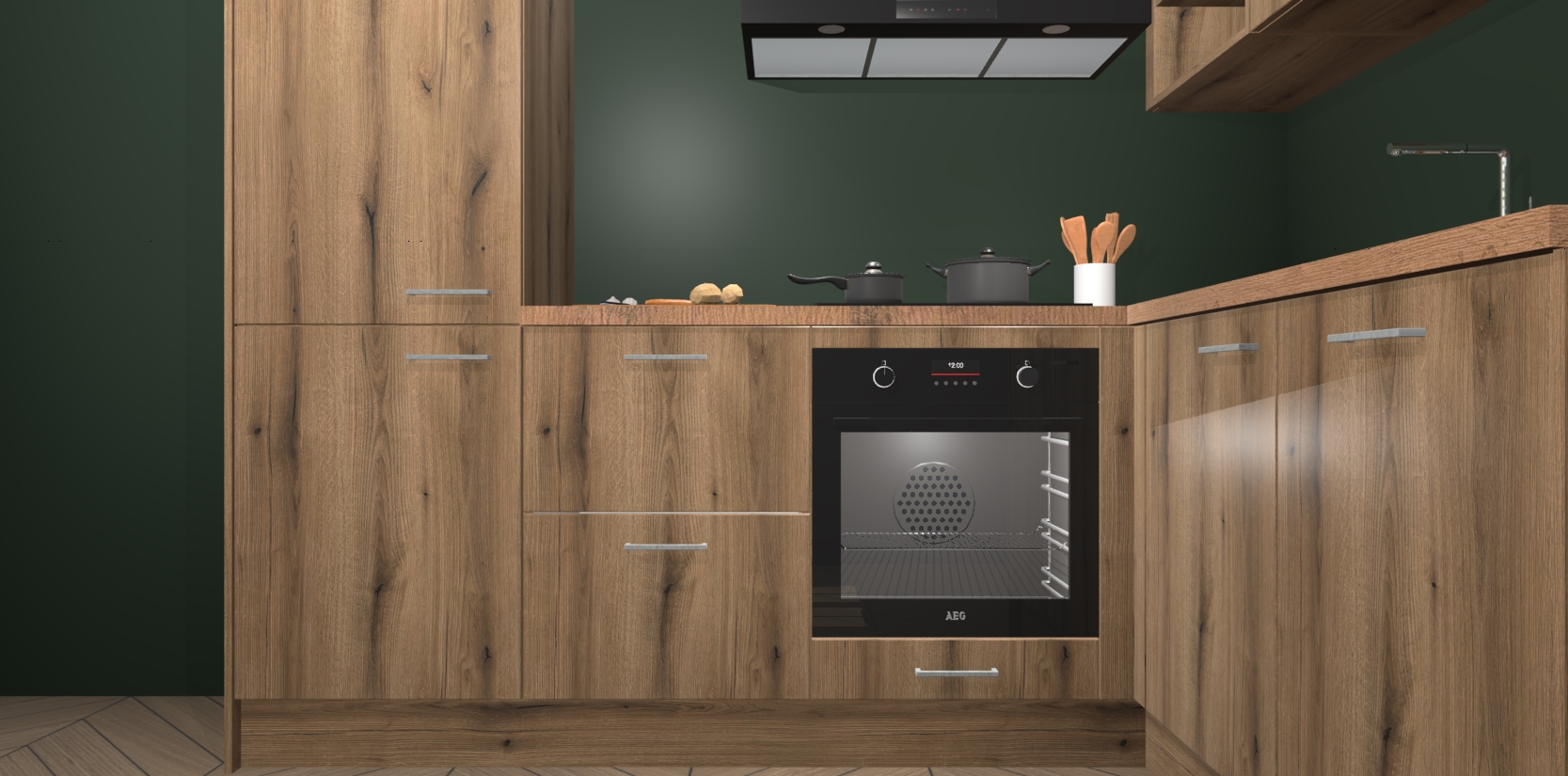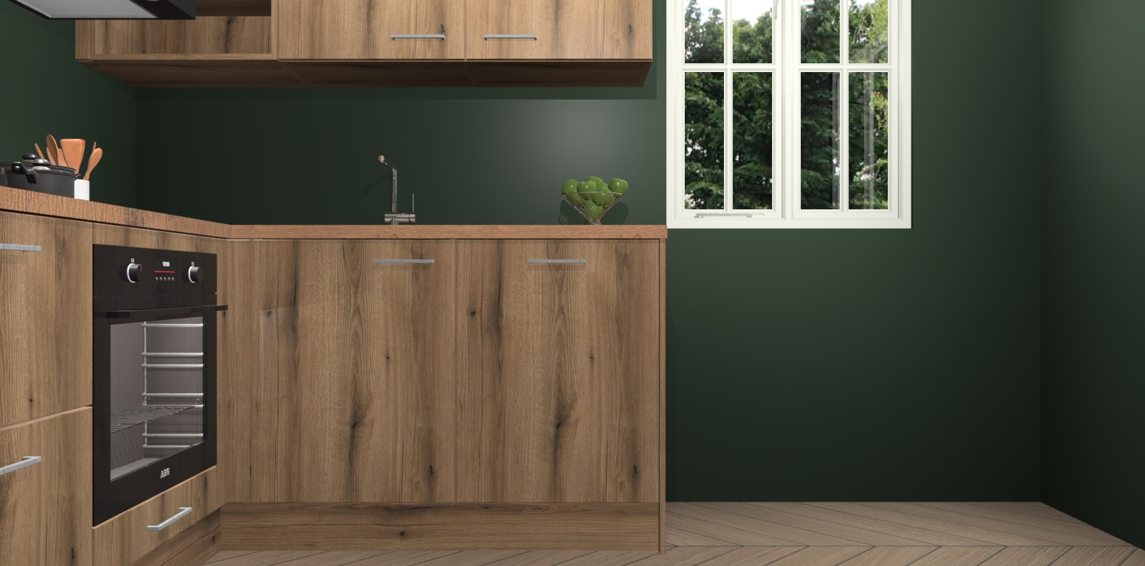 Dit model biedt u voldoende opbergruimte en vijf ingebouwde apparaten: een oven, inductiekookplaat, afzuigkap, vaatwasser en koelkast. Deze apparaten kunnen gemakkelijk worden geüpgrade naar AEG nadat u besteld heeft. De verschillende laden en kastjes bevatten softclose-deuren waardoor ze gezellig dichtvallen met een geruststellend helemaal geruisloos geluid. En dat is nog niet alles! We garanderen ook dat de prijs altijd laag blijft - dus haal nu uw Goud Eiken keuken Krakau terwijl het kan.