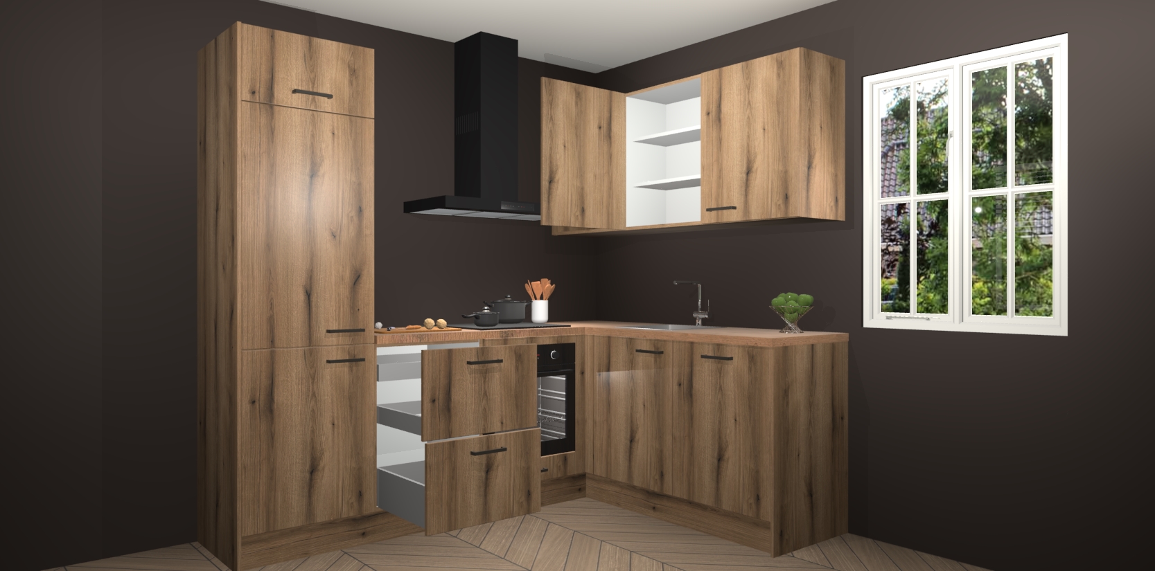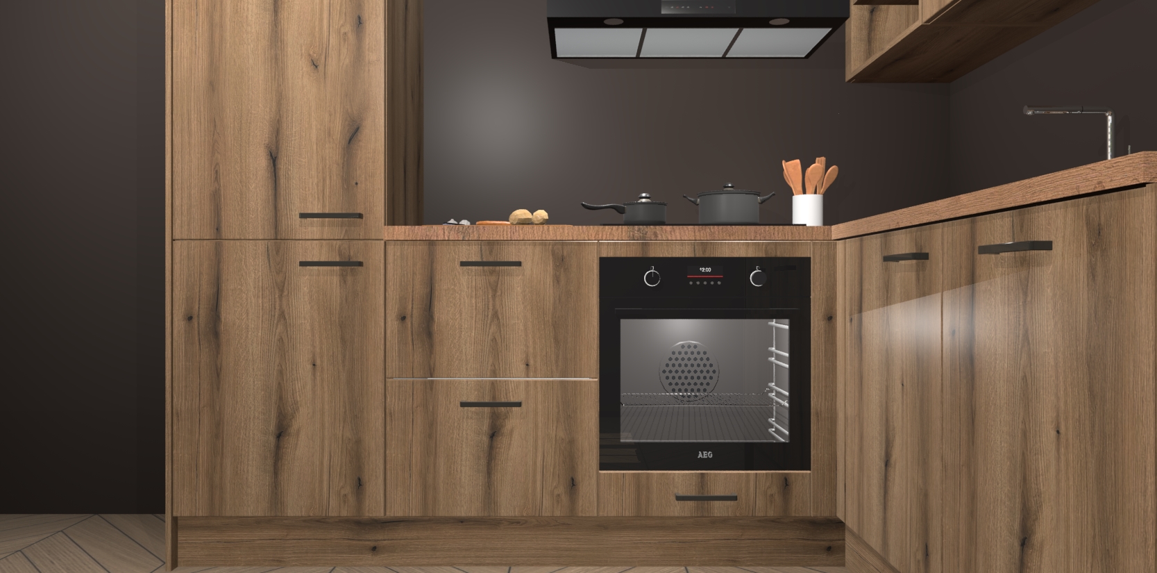 Dit model biedt u voldoende opbergruimte en vijf ingebouwde apparaten: een oven, inductiekookplaat, afzuigkap, vaatwasser en koelkast. Deze apparaten kunnen gemakkelijk worden geüpgrade naar AEG nadat u besteld heeft. De verschillende laden en kastjes bevatten softclose-deuren waardoor ze gezellig dichtvallen met een geruststellend helemaal geruisloos geluid. En dat is nog niet alles! We garanderen ook dat de prijs altijd laag blijft - dus haal nu uw Goud Eiken keuken Krakau terwijl het kan.