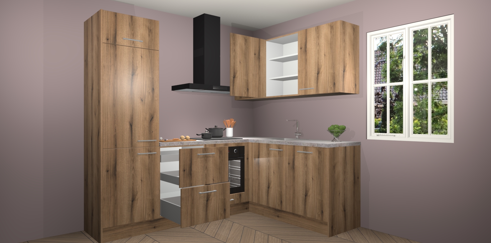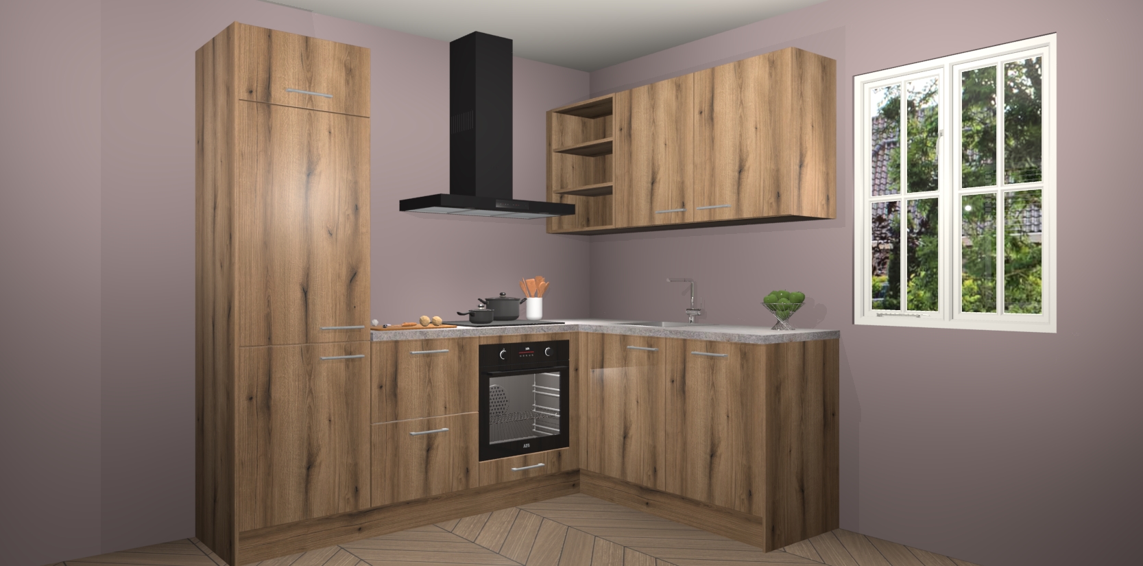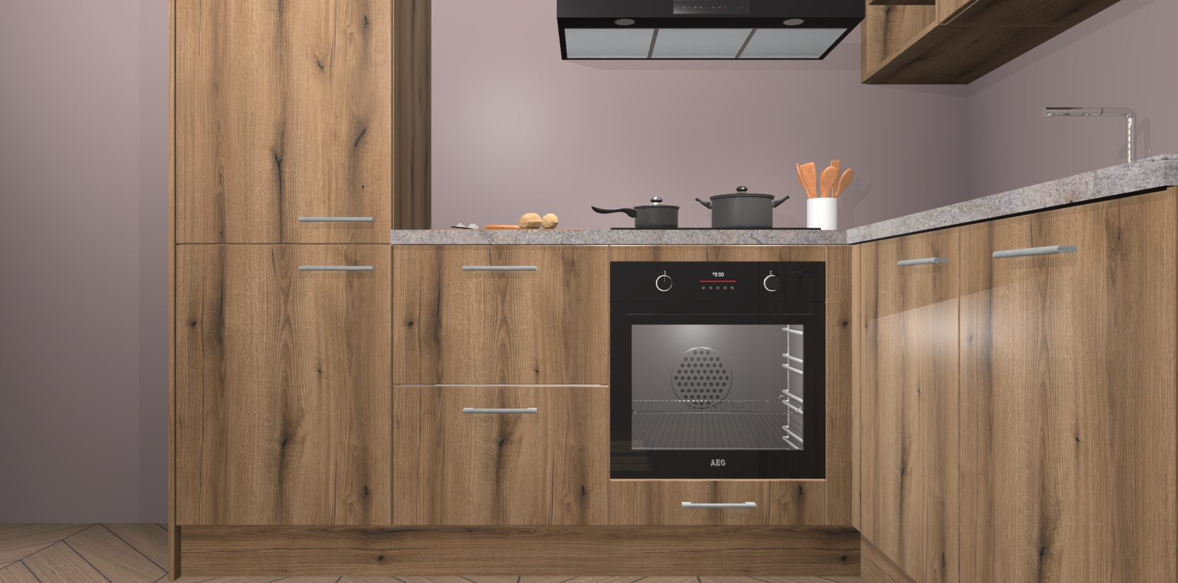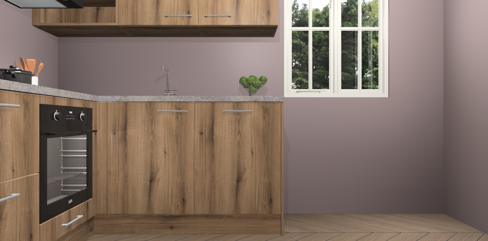Dit model biedt u voldoende opbergruimte en vijf ingebouwde apparaten: een oven, inductiekookplaat, afzuigkap, vaatwasser en koelkast. Deze apparaten kunnen gemakkelijk worden geüpgrade naar AEG nadat u besteld heeft. De verschillende laden en kastjes bevatten softclose-deuren waardoor ze gezellig dichtvallen met een geruststellend helemaal geruisloos geluid. En dat is nog niet alles! We garanderen ook dat de prijs altijd laag blijft - dus haal nu uw Goud Eiken keuken Krakau terwijl het kan.