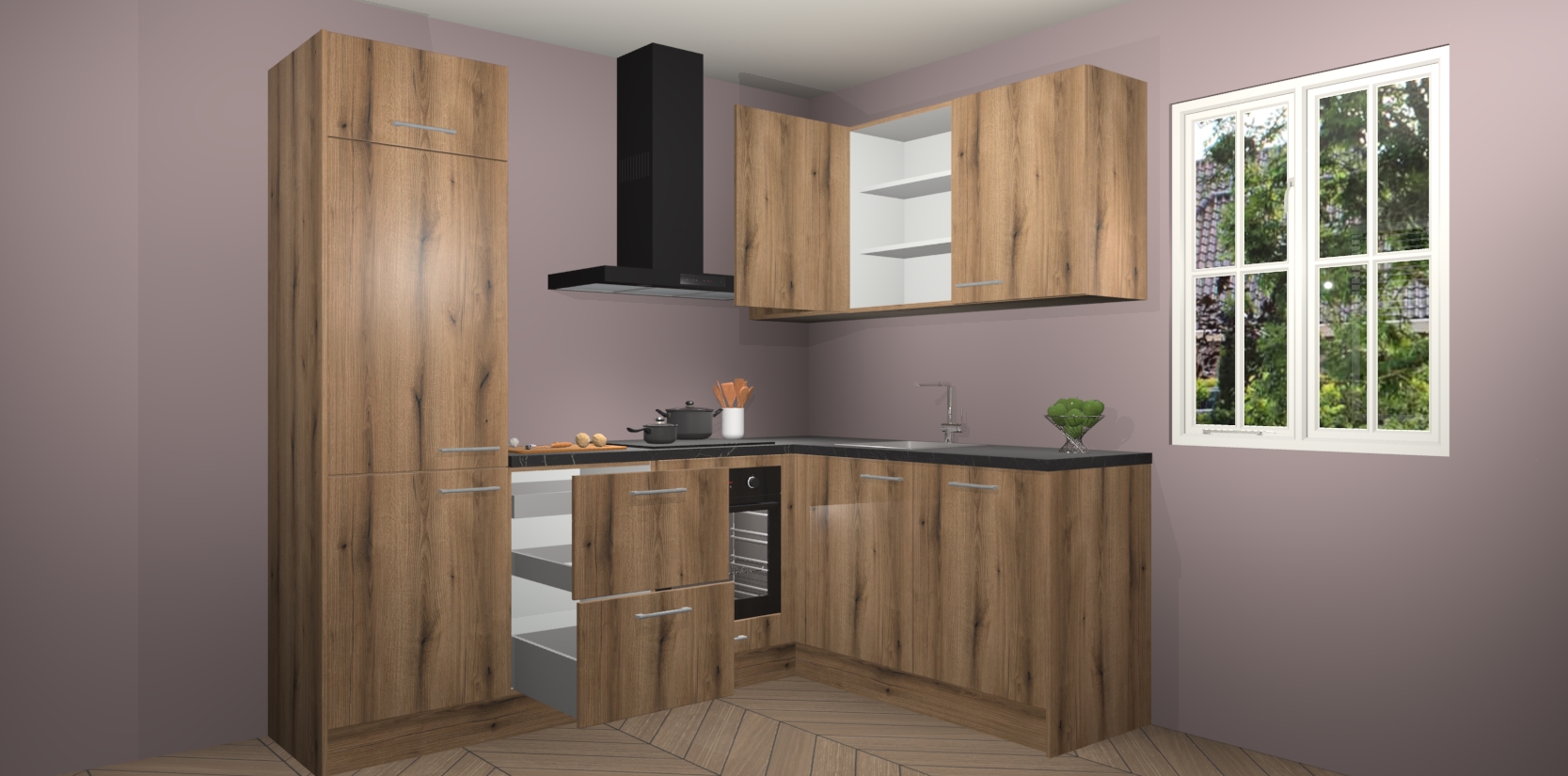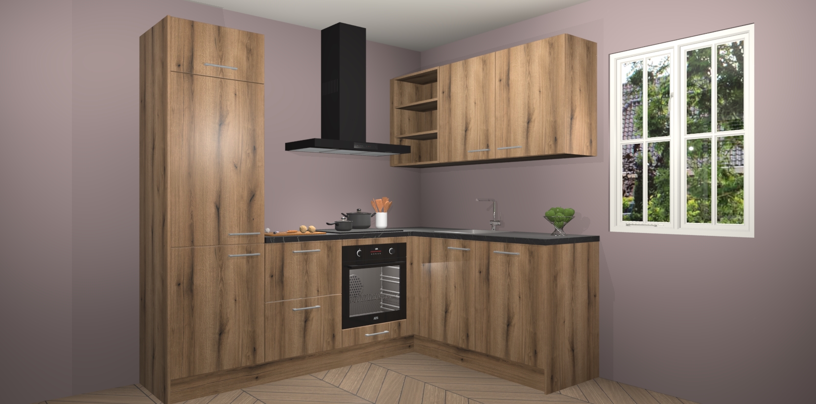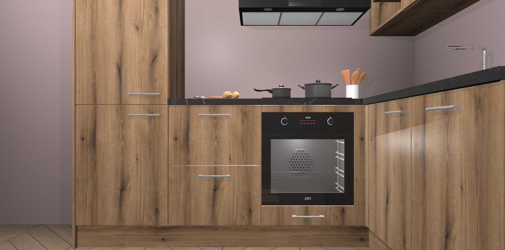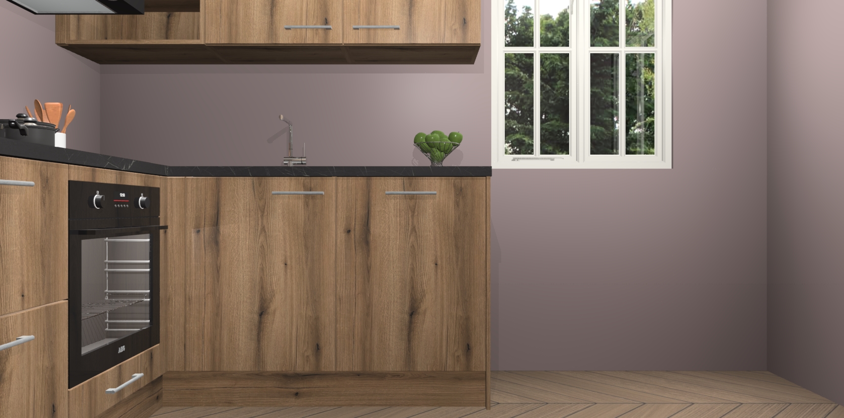 Dit model biedt u voldoende opbergruimte en vijf ingebouwde apparaten: een oven, inductiekookplaat, afzuigkap, vaatwasser en koelkast. Deze apparaten kunnen gemakkelijk worden geüpgrade naar AEG nadat u besteld heeft. De verschillende laden en kastjes bevatten softclose-deuren waardoor ze gezellig dichtvallen met een geruststellend helemaal geruisloos geluid. En dat is nog niet alles! We garanderen ook dat de prijs altijd laag blijft - dus haal nu uw Goud Eiken keuken Krakau terwijl het kan.
