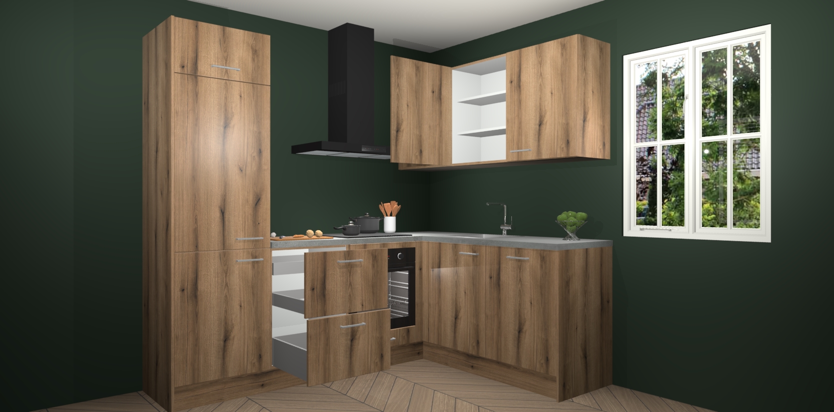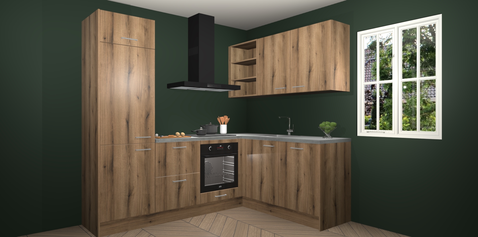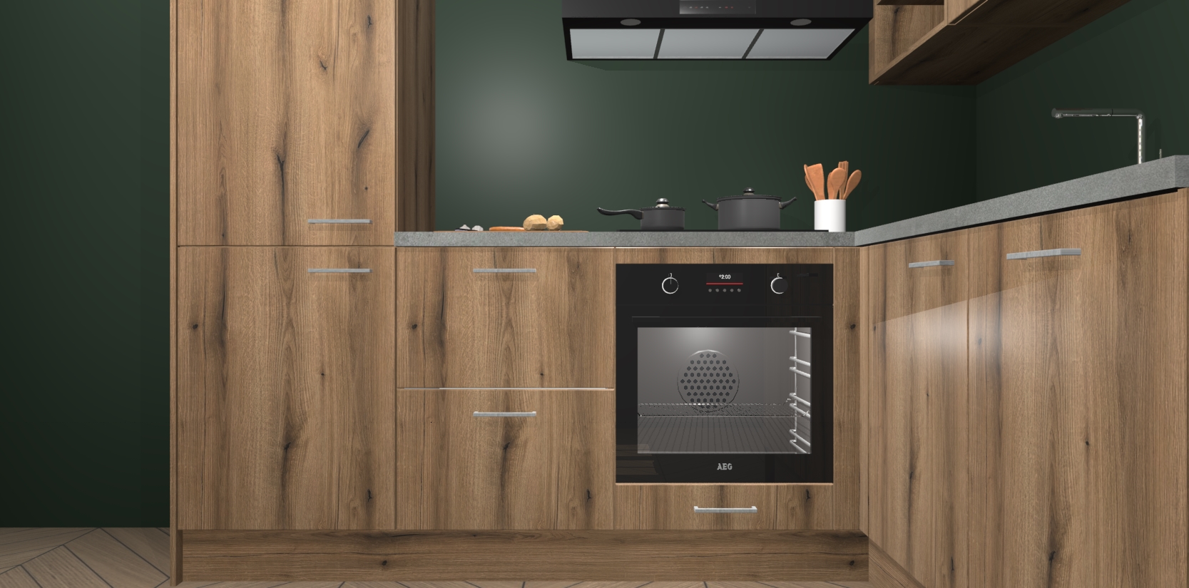Dit model biedt u voldoende opbergruimte en vijf ingebouwde apparaten: een oven, inductiekookplaat, afzuigkap, vaatwasser en koelkast. Deze apparaten kunnen gemakkelijk worden geüpgrade naar AEG nadat u besteld heeft. De verschillende laden en kastjes bevatten softclose-deuren waardoor ze gezellig dichtvallen met een geruststellend helemaal geruisloos geluid. En dat is nog niet alles! We garanderen ook dat de prijs altijd laag blijft - dus haal nu uw Goud Eiken keuken Krakau terwijl het kan.