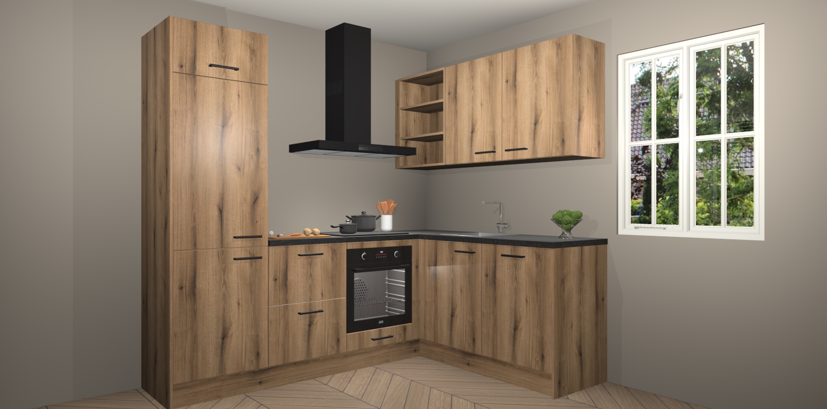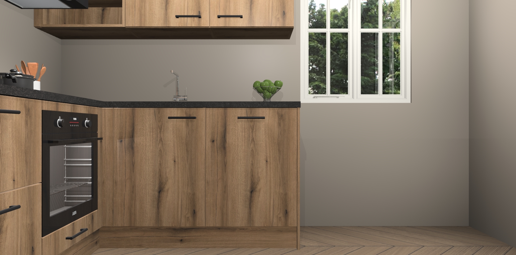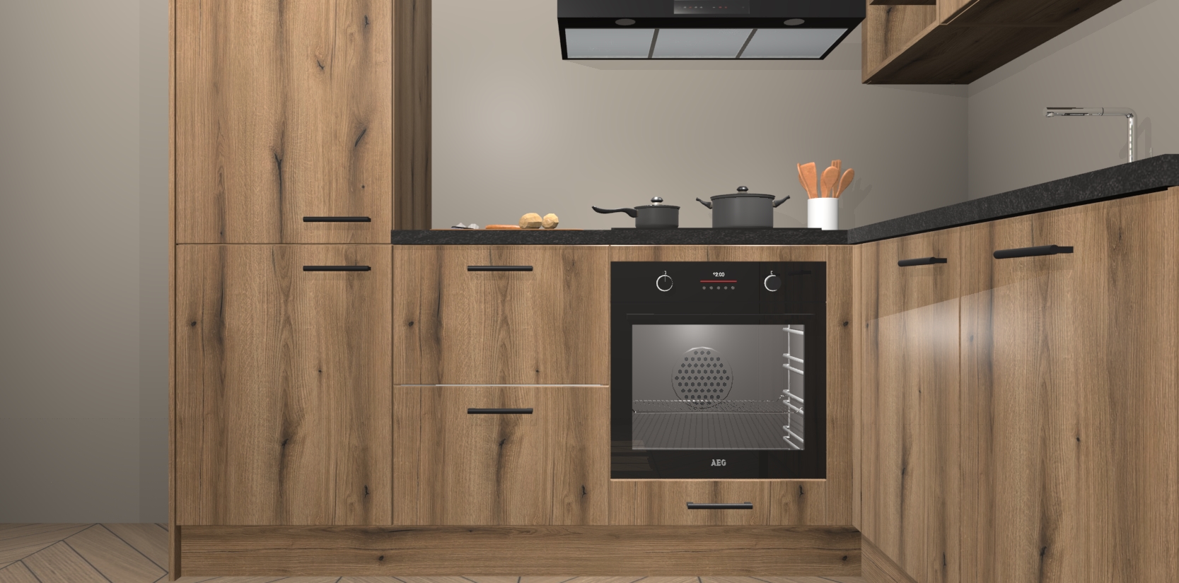 Dit model biedt u voldoende opbergruimte en vijf ingebouwde apparaten: een oven, inductiekookplaat, afzuigkap, vaatwasser en koelkast. Deze apparaten kunnen gemakkelijk worden geüpgrade naar AEG nadat u besteld heeft. De verschillende laden en kastjes bevatten softclose-deuren waardoor ze gezellig dichtvallen met een geruststellend helemaal geruisloos geluid. En dat is nog niet alles! We garanderen ook dat de prijs altijd laag blijft - dus haal nu uw Goud Eiken keuken Krakau terwijl het kan.