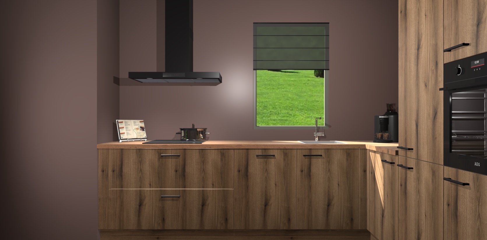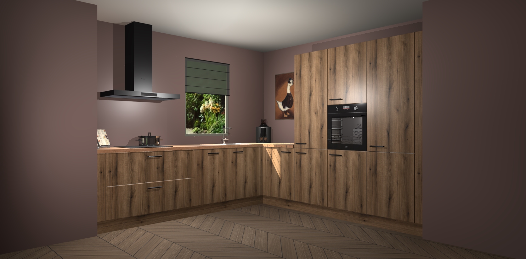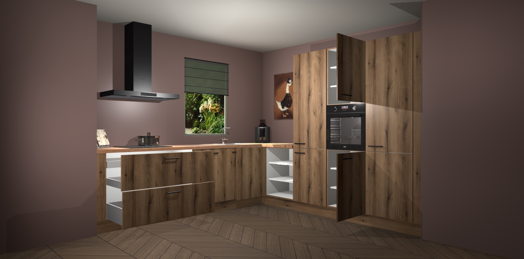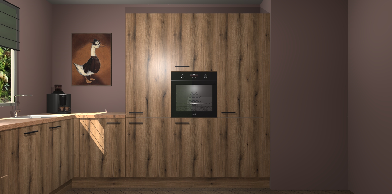 Welkom bij de Goud Eiken keuken Laos. Deze prachtige keuken zal de komende jaren het middelpunt van de belangstelling in uw huis zijn. Uitgerust met vijf inbouwapparaten komt u nooit kookgereedschap tekort. Bovendien geeft de warme houtlook elke ruimte een uitnodigende en tijdloze uitstraling.