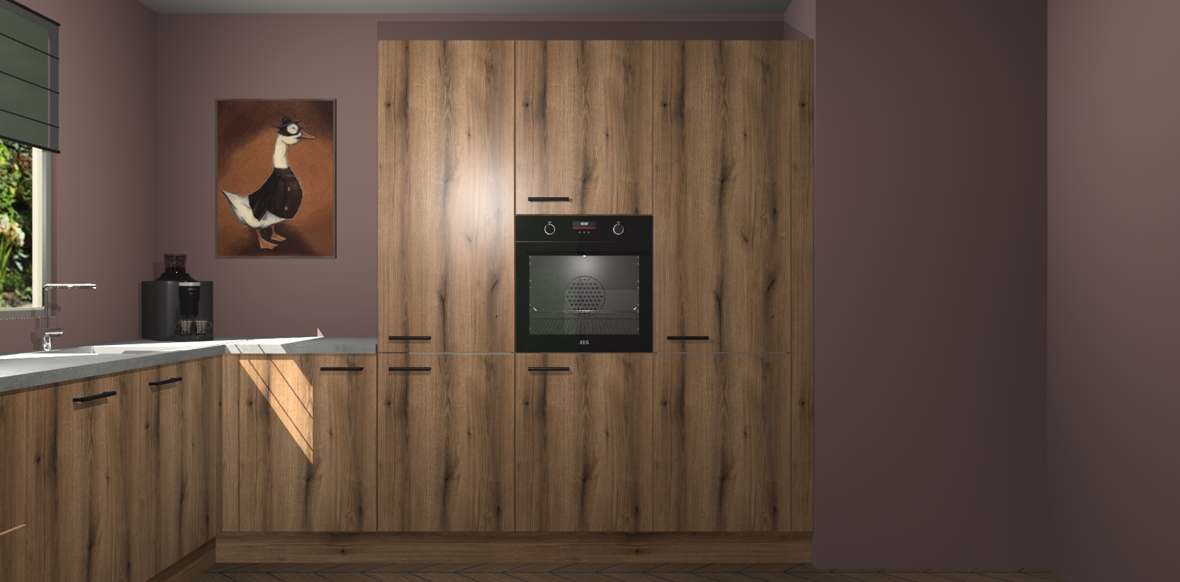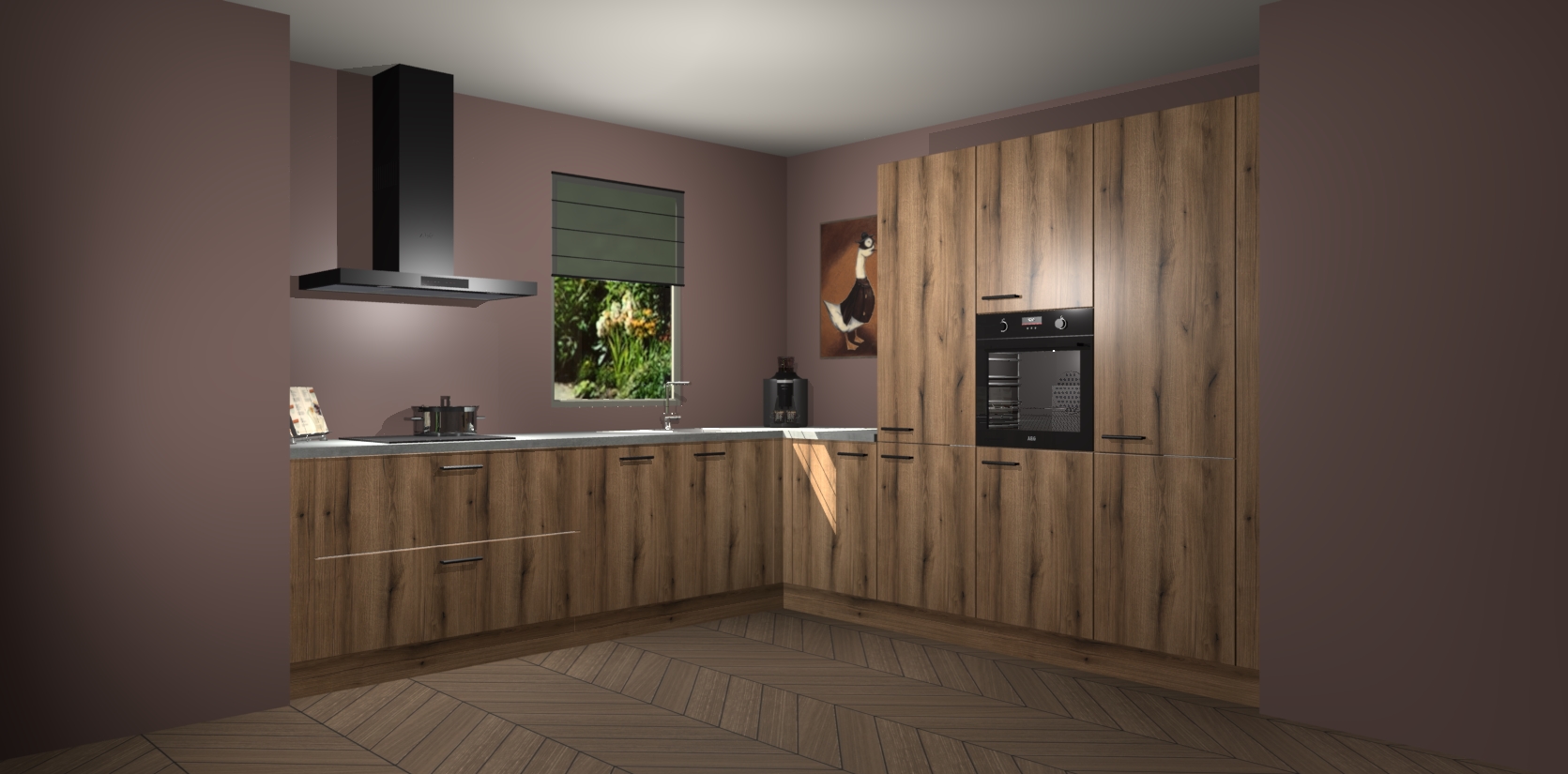 Welkom bij de Goud Eiken keuken Laos. Deze prachtige keuken zal de komende jaren het middelpunt van de belangstelling in uw huis zijn. Uitgerust met vijf inbouwapparaten komt u nooit kookgereedschap tekort. Bovendien geeft de warme houtlook elke ruimte een uitnodigende en tijdloze uitstraling.