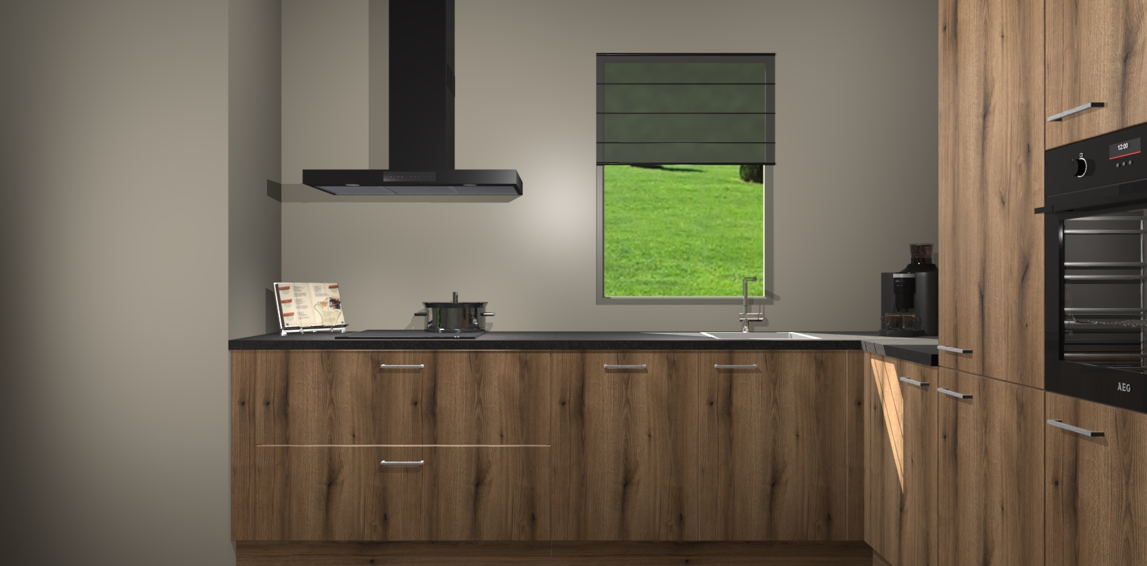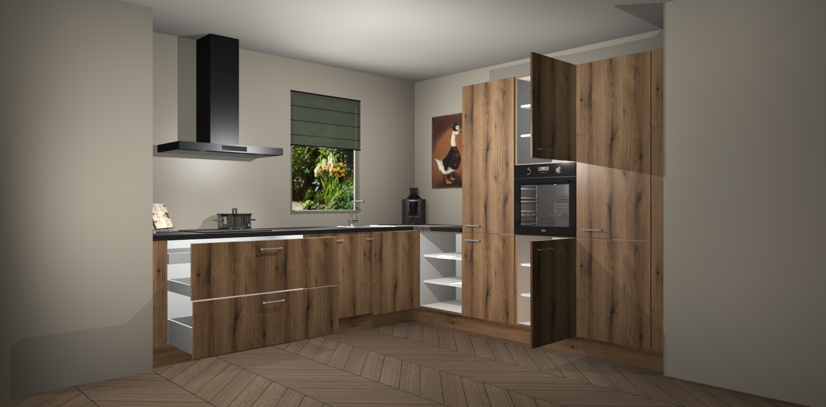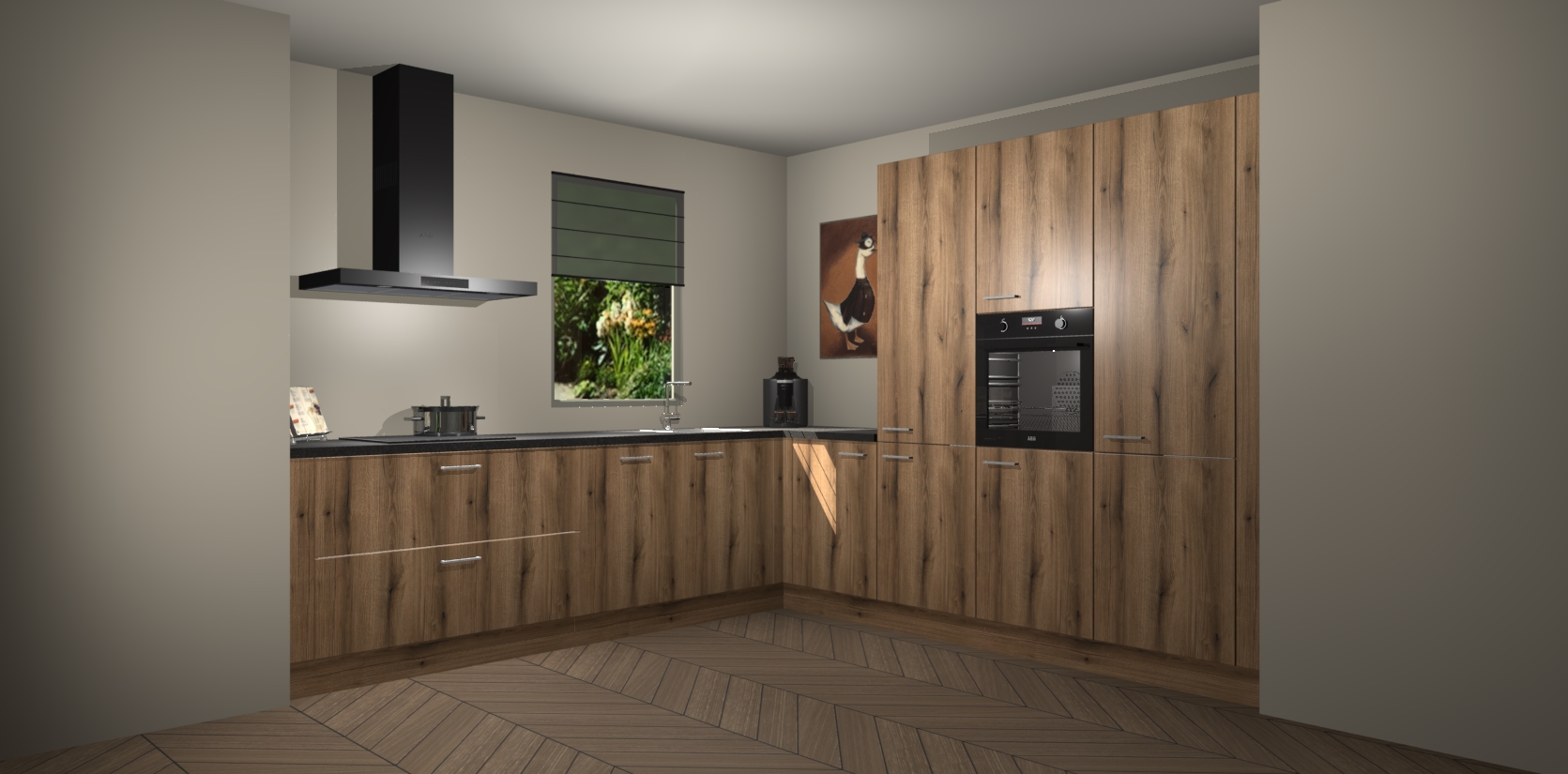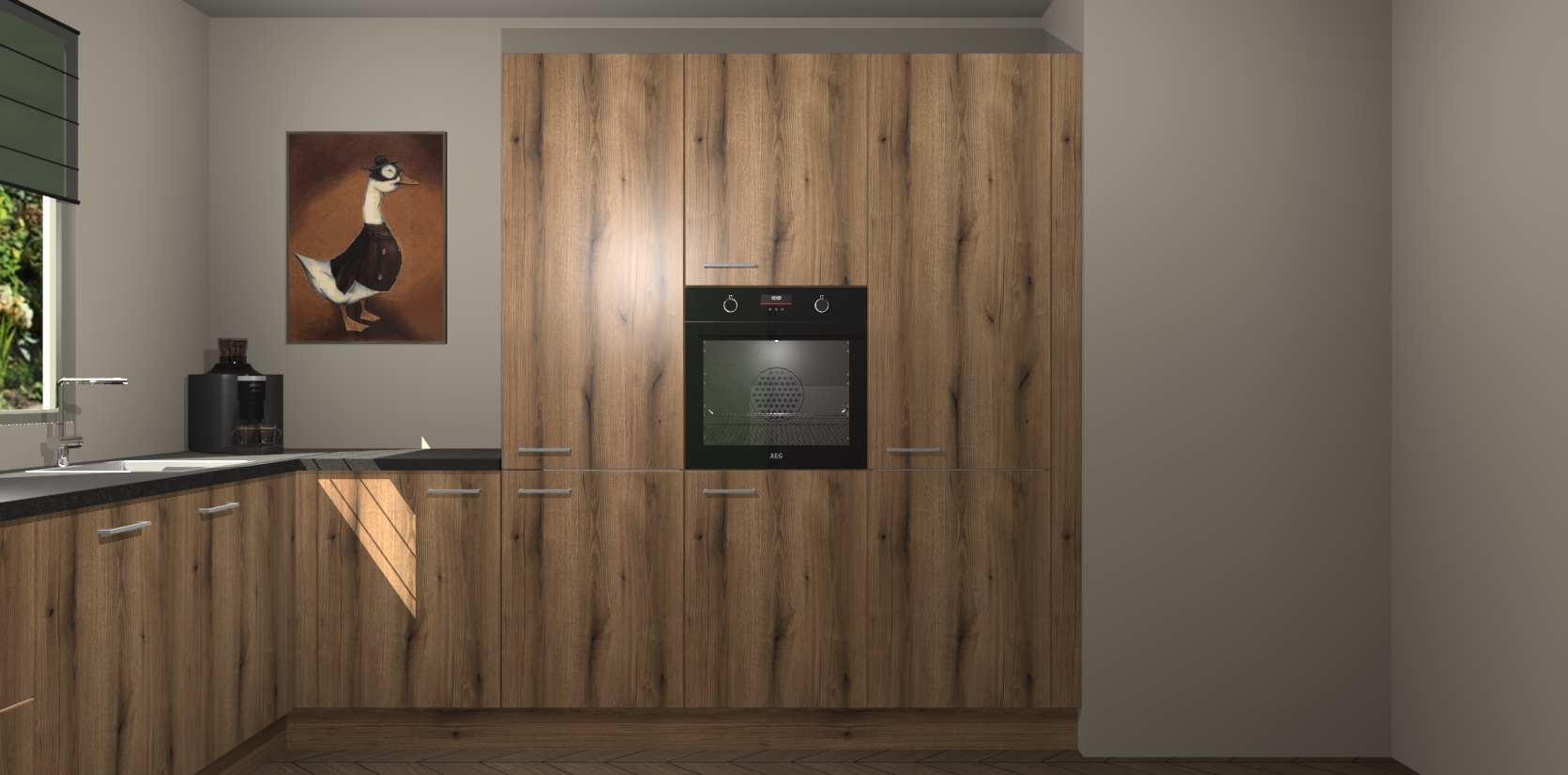 Welkom bij de Goud Eiken keuken Laos. Deze prachtige keuken zal de komende jaren het middelpunt van de belangstelling in uw huis zijn. Uitgerust met vijf inbouwapparaten komt u nooit kookgereedschap tekort. Bovendien geeft de warme houtlook elke ruimte een uitnodigende en tijdloze uitstraling.