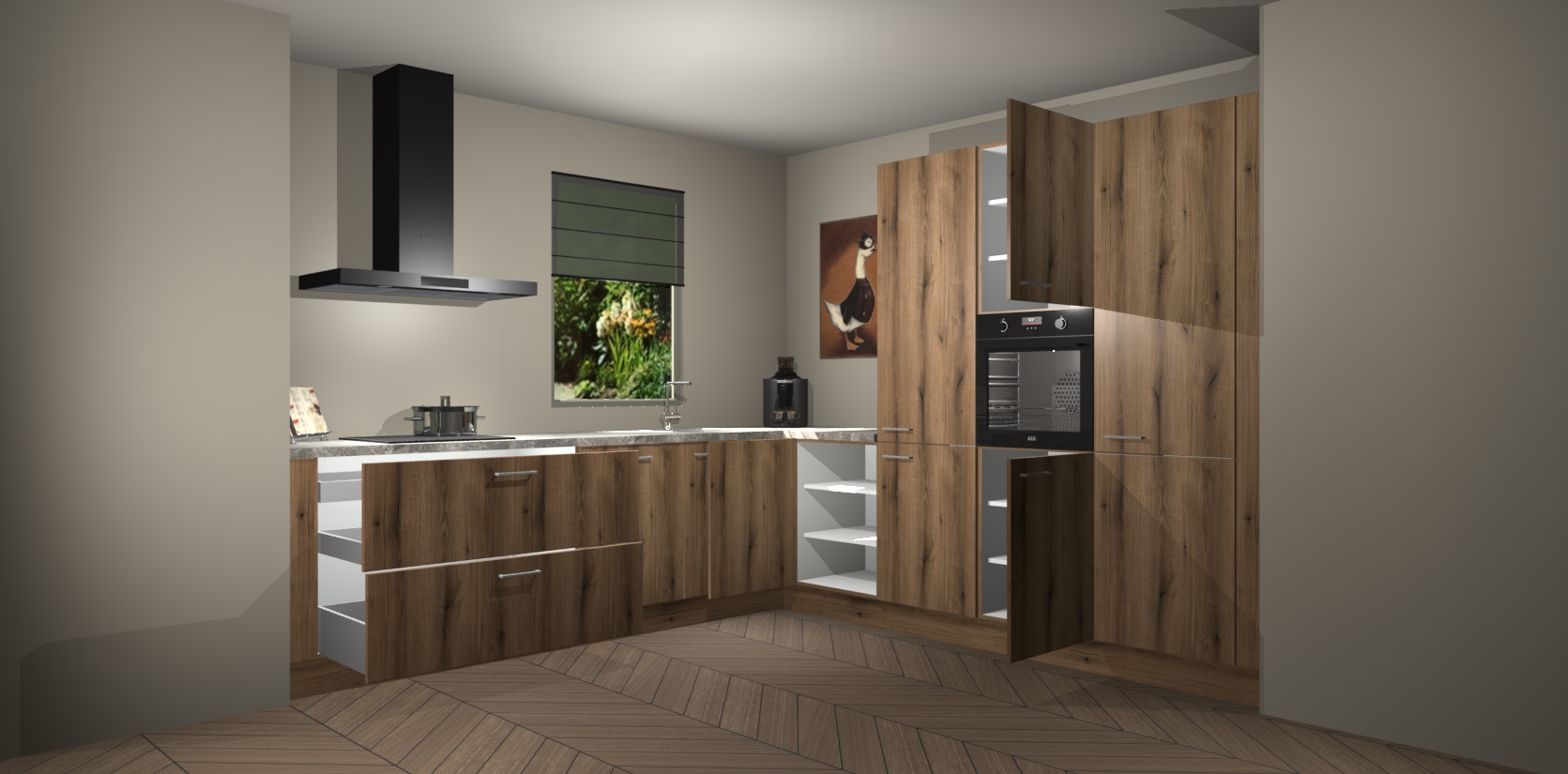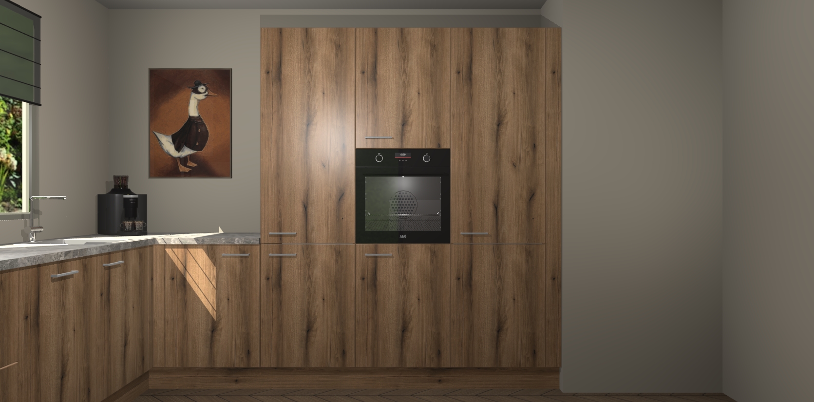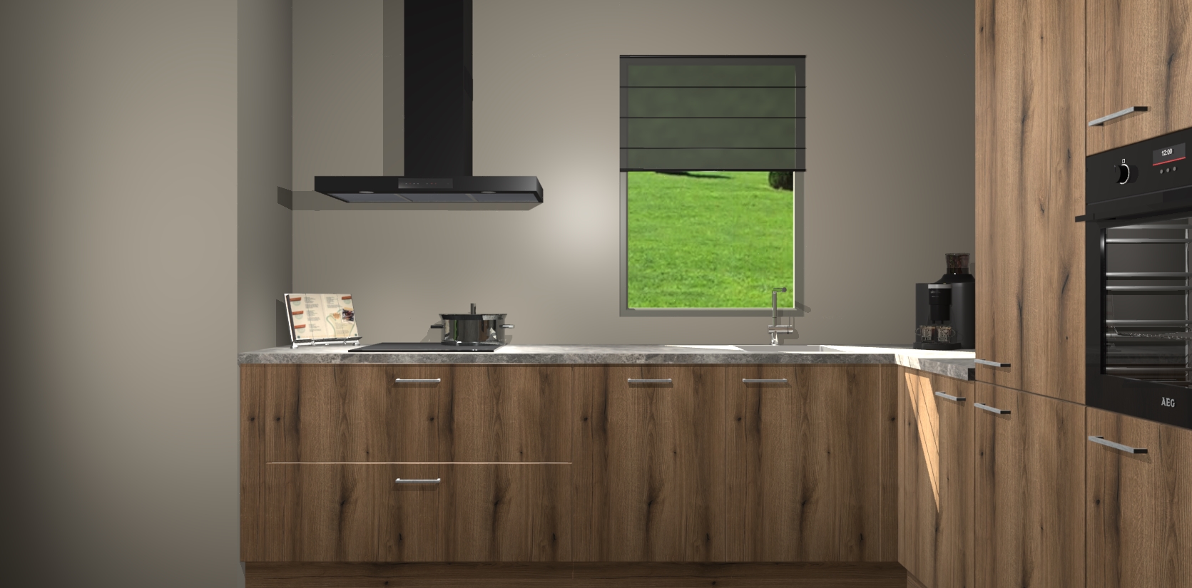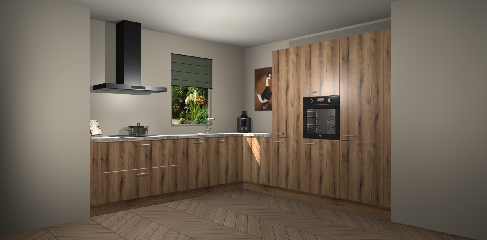 Welkom bij de Goud Eiken keuken Laos. Deze prachtige keuken zal de komende jaren het middelpunt van de belangstelling in uw huis zijn. Uitgerust met vijf inbouwapparaten komt u nooit kookgereedschap tekort. Bovendien geeft de warme houtlook elke ruimte een uitnodigende en tijdloze uitstraling.