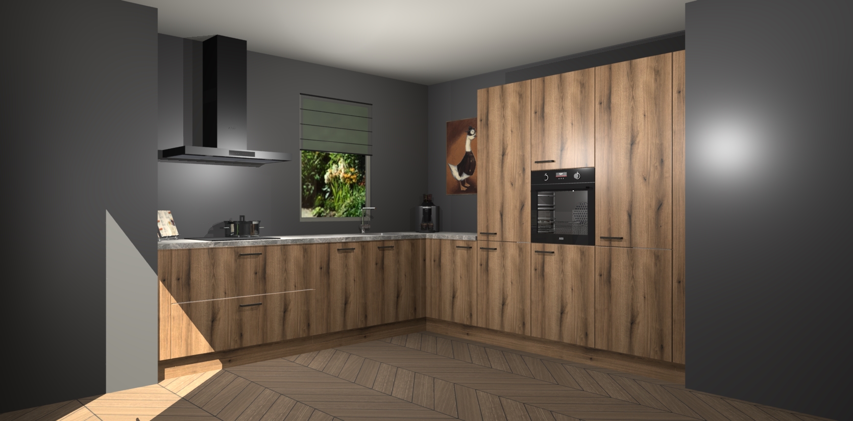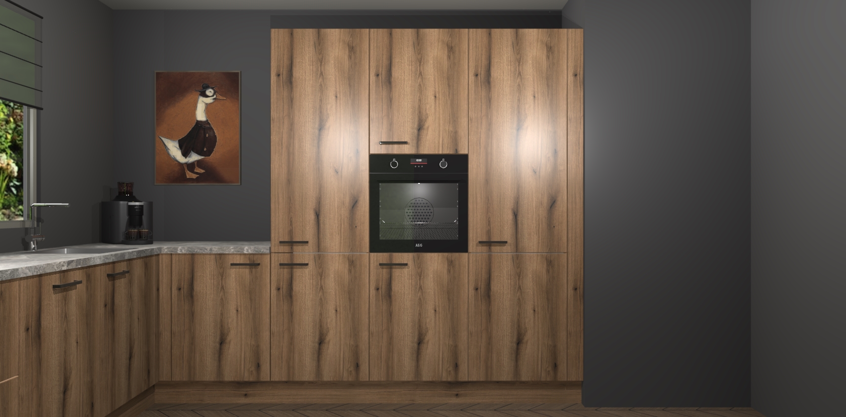 Welkom bij de Goud Eiken keuken Laos. Deze prachtige keuken zal de komende jaren het middelpunt van de belangstelling in uw huis zijn. Uitgerust met vijf inbouwapparaten komt u nooit kookgereedschap tekort. Bovendien geeft de warme houtlook elke ruimte een uitnodigende en tijdloze uitstraling.