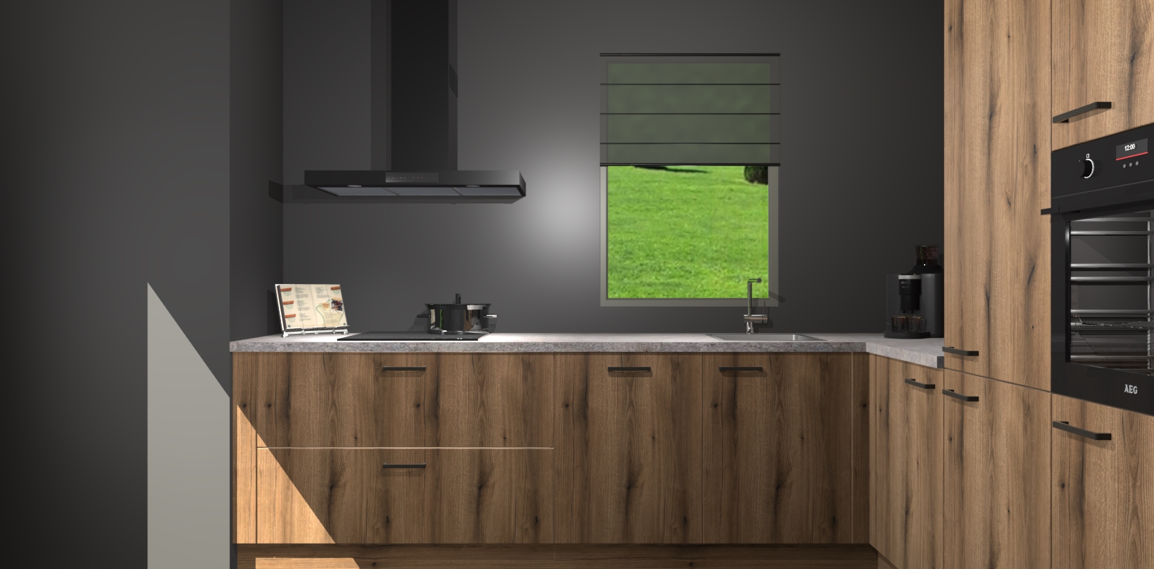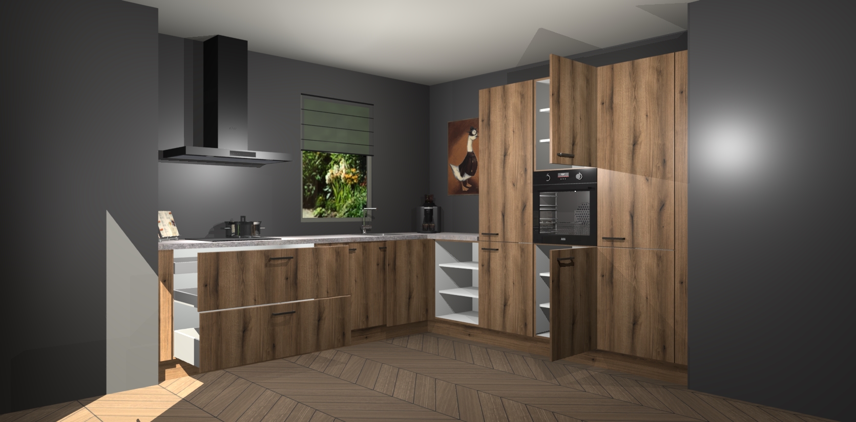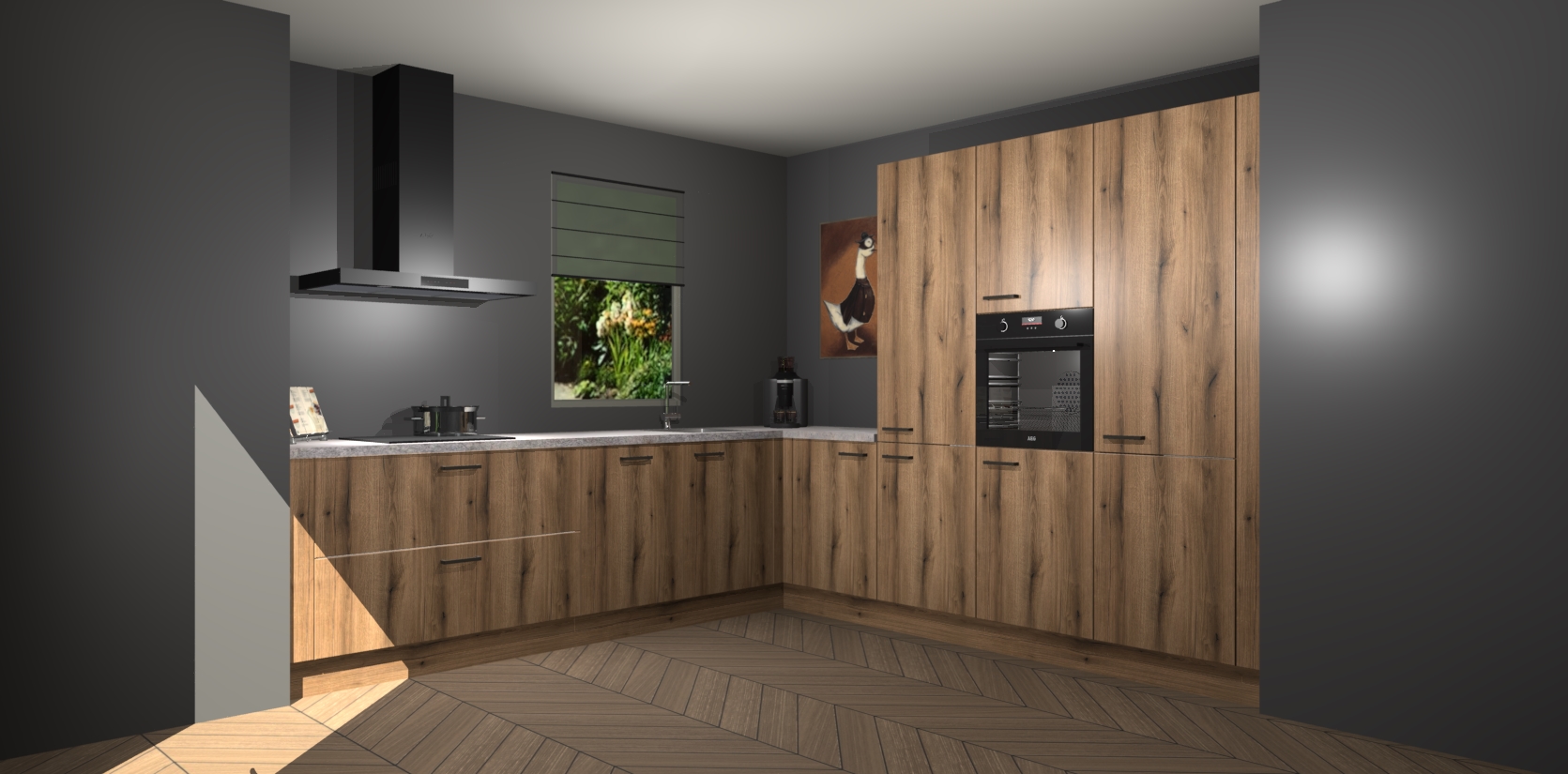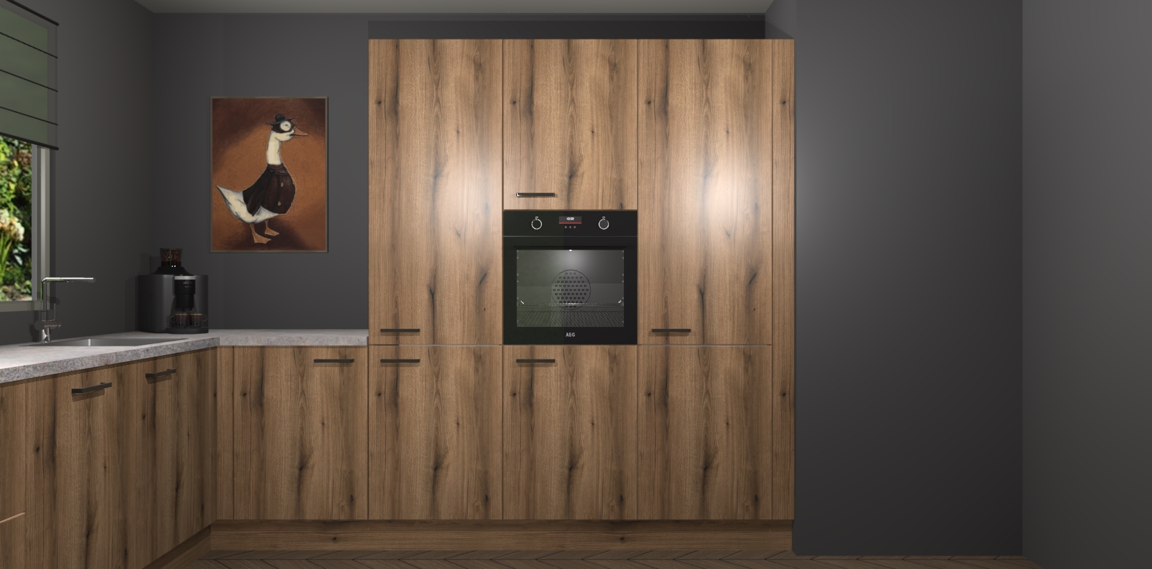 Welkom bij de Goud Eiken keuken Laos. Deze prachtige keuken zal de komende jaren het middelpunt van de belangstelling in uw huis zijn. Uitgerust met vijf inbouwapparaten komt u nooit kookgereedschap tekort. Bovendien geeft de warme houtlook elke ruimte een uitnodigende en tijdloze uitstraling.