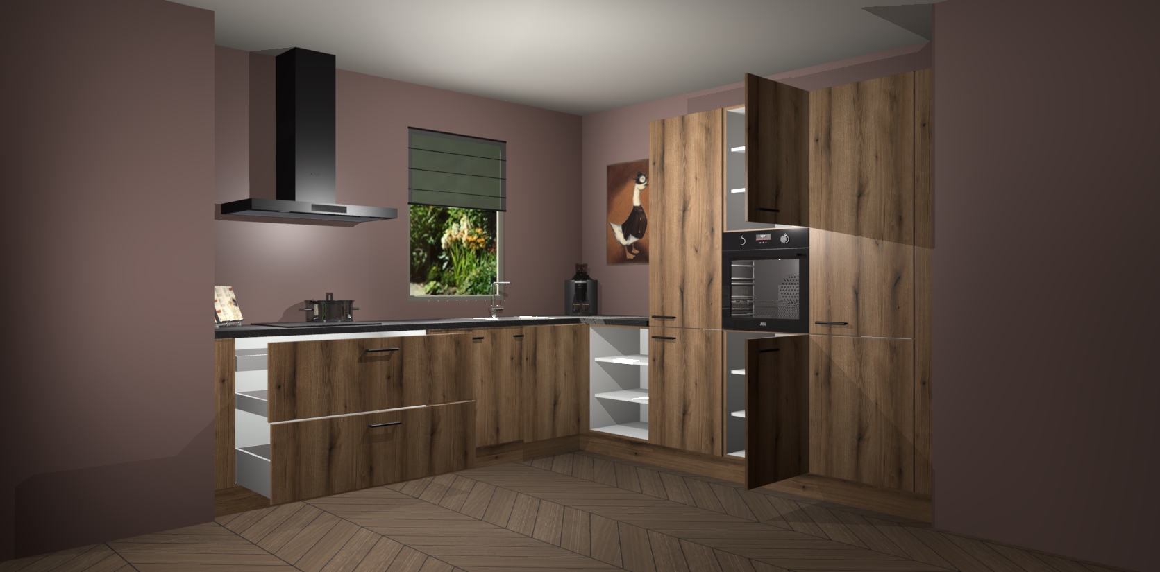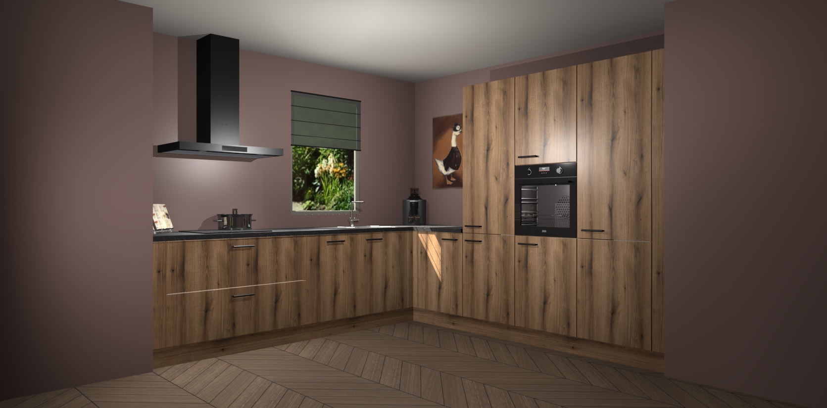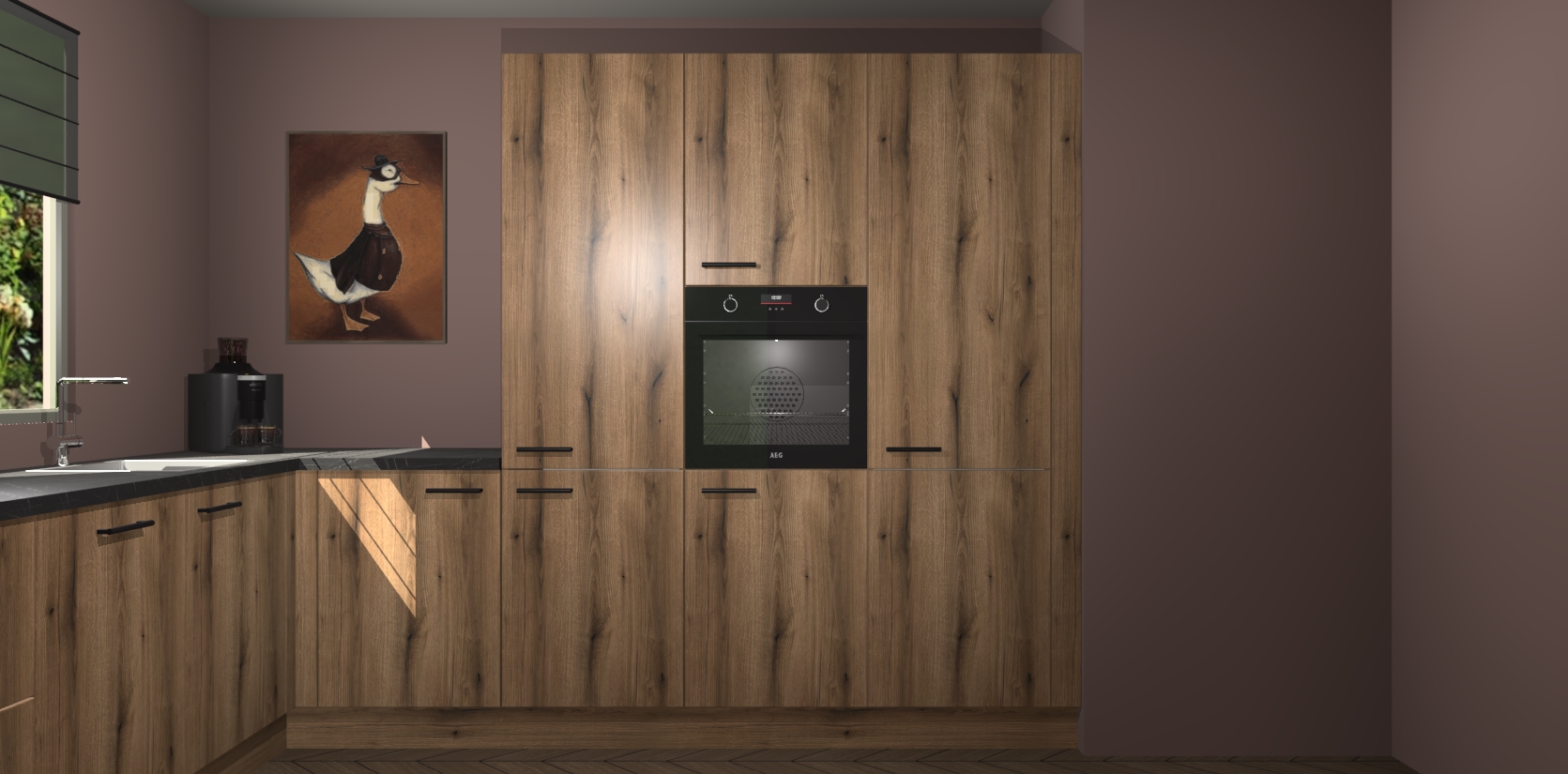 Welkom bij de Goud Eiken keuken Laos. Deze prachtige keuken zal de komende jaren het middelpunt van de belangstelling in uw huis zijn. Uitgerust met vijf inbouwapparaten komt u nooit kookgereedschap tekort. Bovendien geeft de warme houtlook elke ruimte een uitnodigende en tijdloze uitstraling.