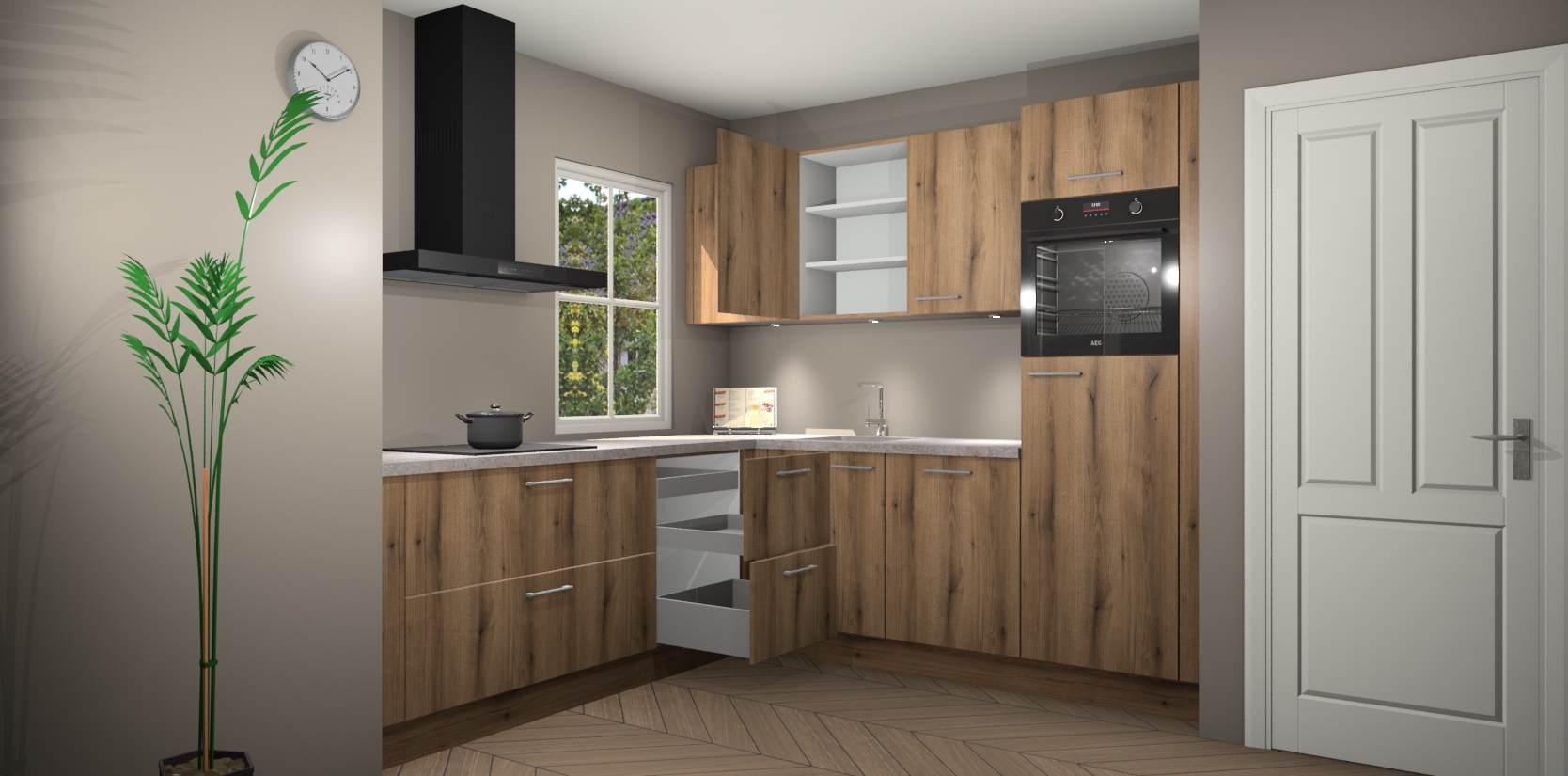 De goud eiken keuken Leeds bevat vijf essentiële inbouwapparaten - een oven, inductiekookplaat, afzuigkap, vaatwasser en koelkast - zodat u er na levering meteen in kunt. Voor de slimme kopers die weten dat apparaten vaak het verschil kunnen maken tussen functioneel en luxueus, bieden we eenvoudige upgradeopties naar AEG, van oven naar combimagnetron na bestelling of naar een kookplaat met geïntrigeerde afzuiging. En met onze vaste lage prijs en snelle levering binnen zeven weken vanaf de orderbevestiging hoeft u zich geen zorgen te maken over verborgen kosten of lange levertijden die uw droomkeuken kunnen vertragen.