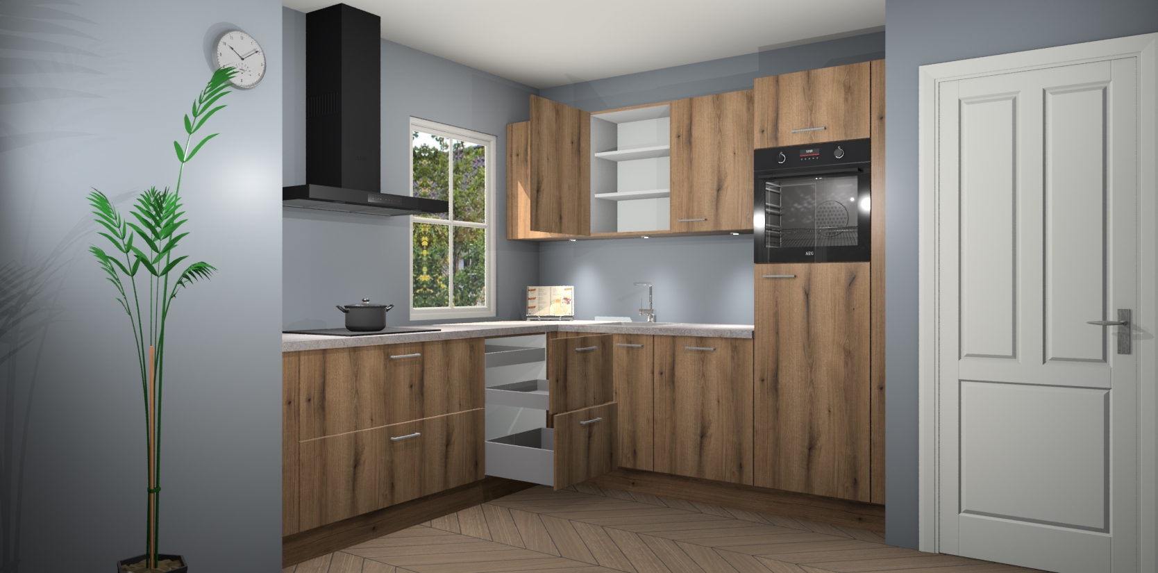 De goud eiken keuken Leeds bevat vijf essentiële inbouwapparaten - een oven, inductiekookplaat, afzuigkap, vaatwasser en koelkast - zodat u er na levering meteen in kunt. Voor de slimme kopers die weten dat apparaten vaak het verschil kunnen maken tussen functioneel en luxueus, bieden we eenvoudige upgradeopties naar AEG, van oven naar combimagnetron na bestelling of naar een kookplaat met geïntrigeerde afzuiging. En met onze vaste lage prijs en snelle levering binnen zeven weken vanaf de orderbevestiging hoeft u zich geen zorgen te maken over verborgen kosten of lange levertijden die uw droomkeuken kunnen vertragen.