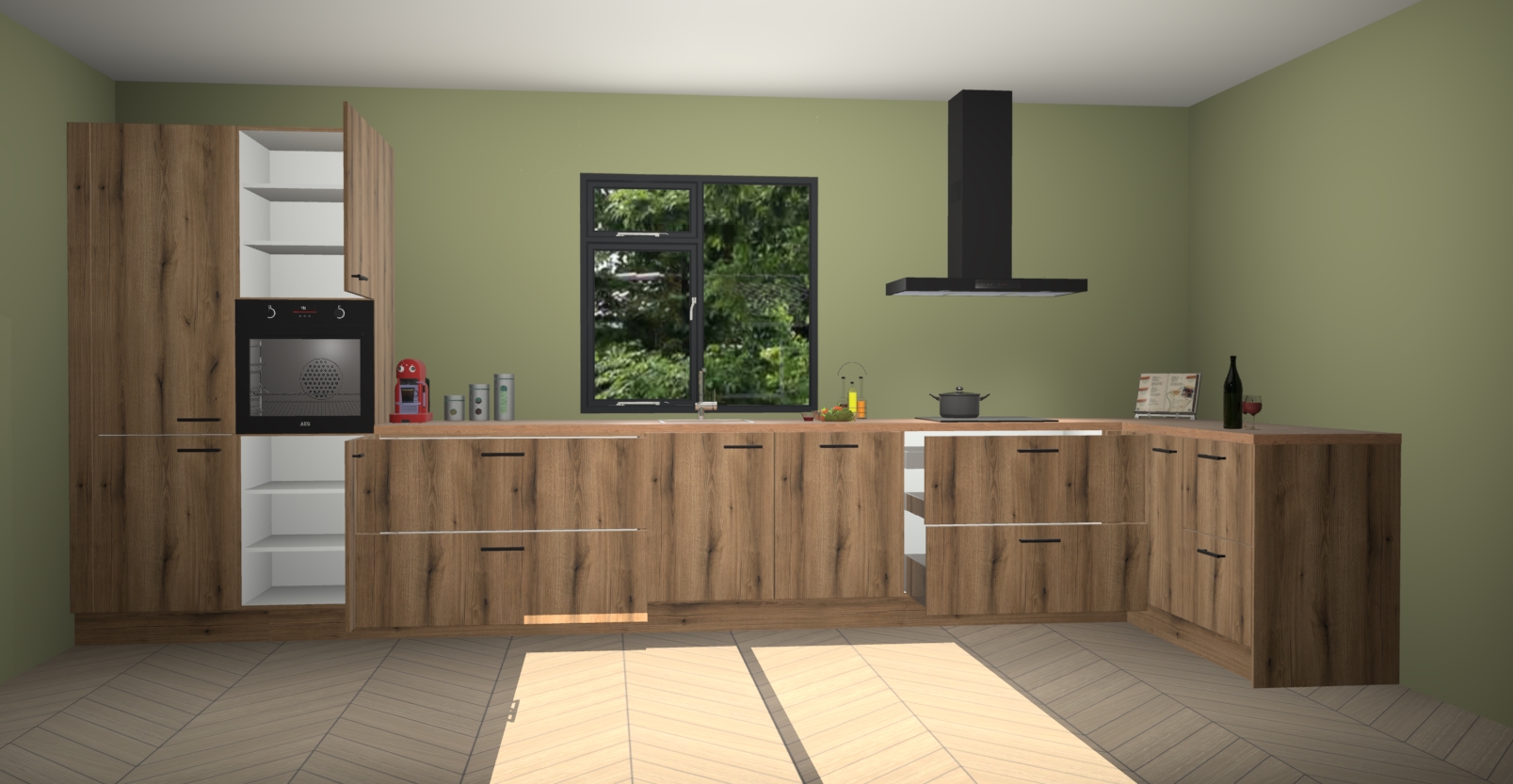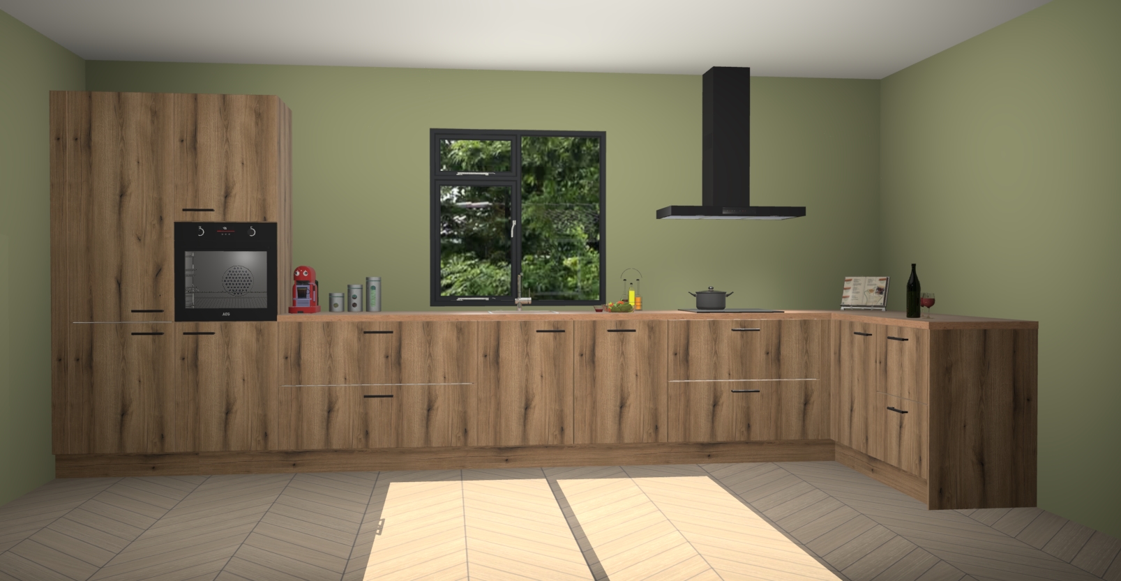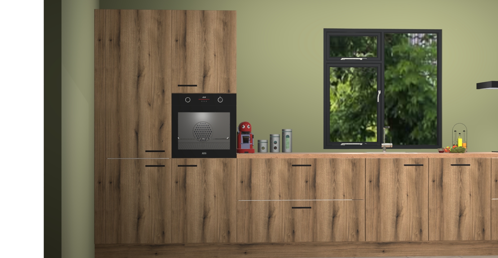 De Goud eiken keuken Lille wordt geleverd met vijf inbouwapparaten - een oven, inductiekookplaat, afzuigkap, vaatwasser en koelkast. Maar dat is nog niet alles! Na bestelling kunnen deze apparaten eenvoudig worden geüpgraded naar premium AEG-apparatuur. Bovendien is er zelfs de optie om de oven te vervangen door een combimagnetron of uw inductiekookplaat te vervangen door een kookplaat met geïntegreerde afzuiging.