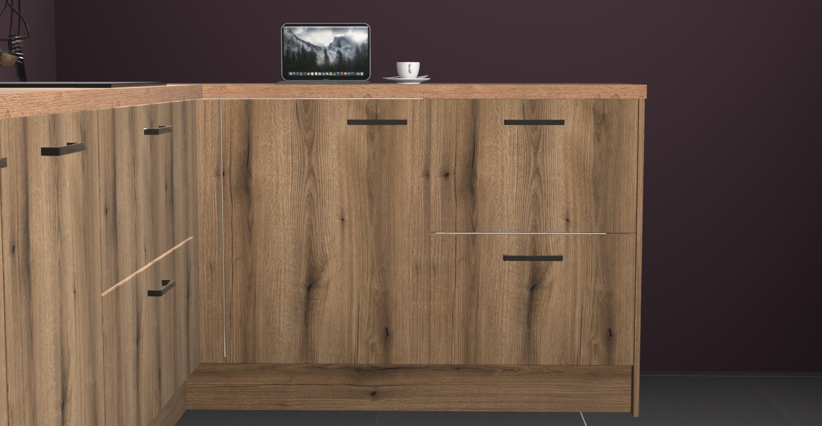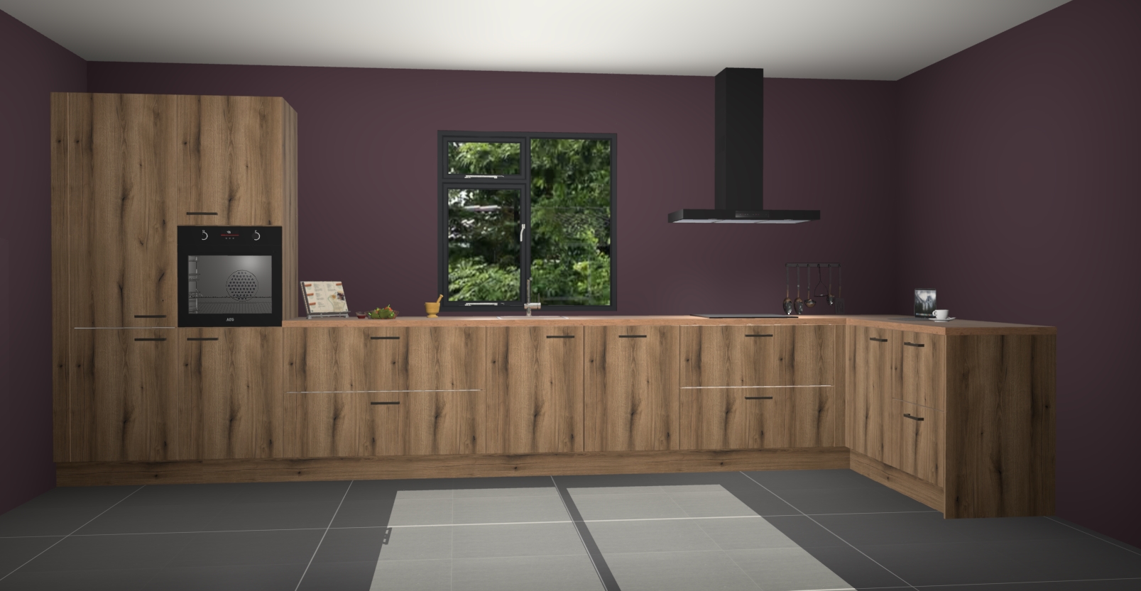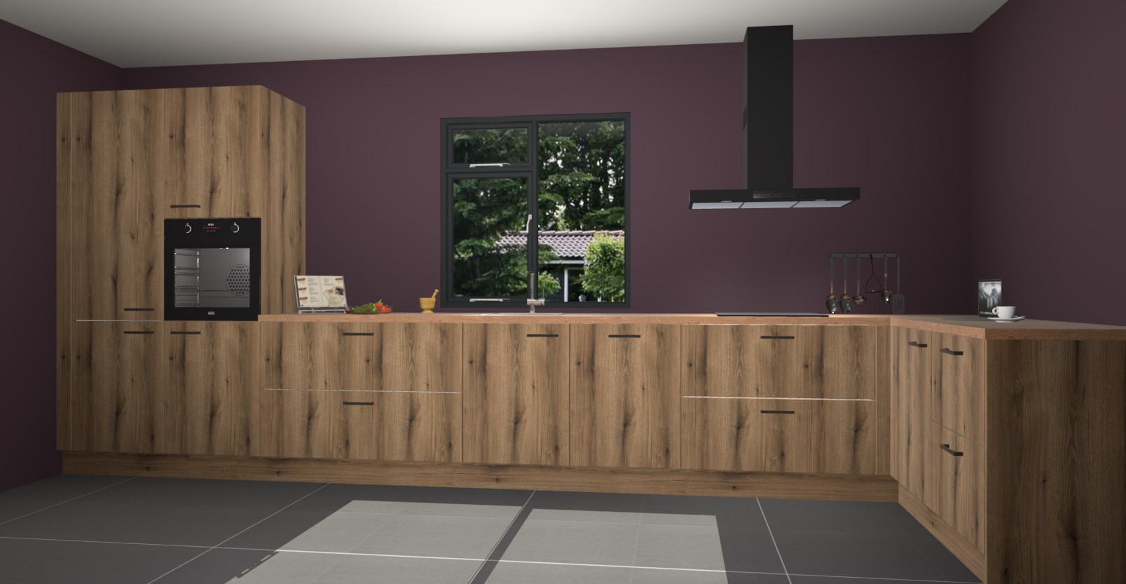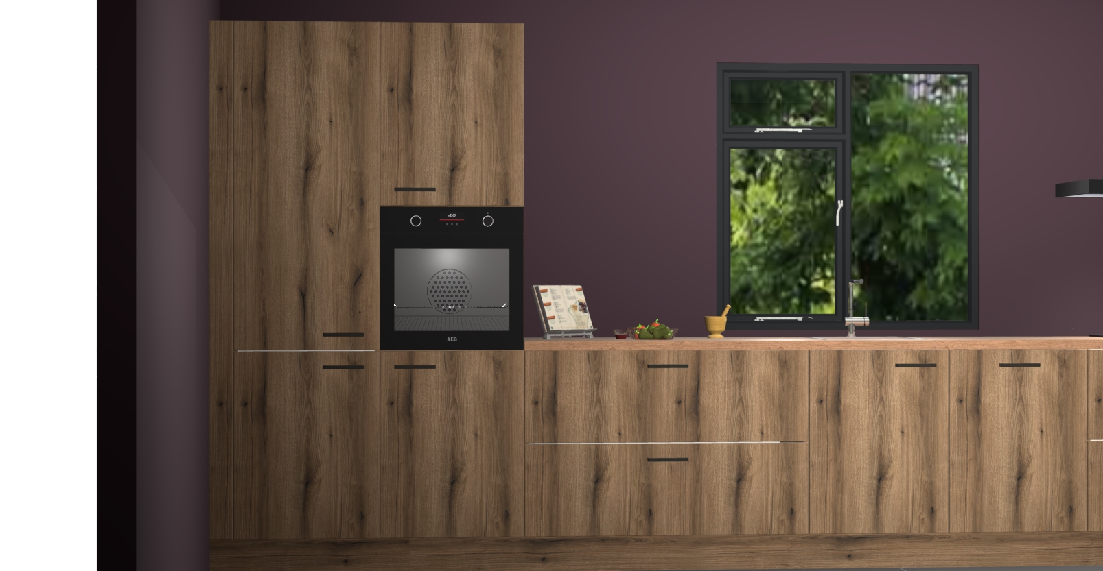 De Goud eiken keuken Lille wordt geleverd met vijf inbouwapparaten - een oven, inductiekookplaat, afzuigkap, vaatwasser en koelkast. Maar dat is nog niet alles! Na bestelling kunnen deze apparaten eenvoudig worden geüpgraded naar premium AEG-apparatuur. Bovendien is er zelfs de optie om de oven te vervangen door een combimagnetron of uw inductiekookplaat te vervangen door een kookplaat met geïntegreerde afzuiging.