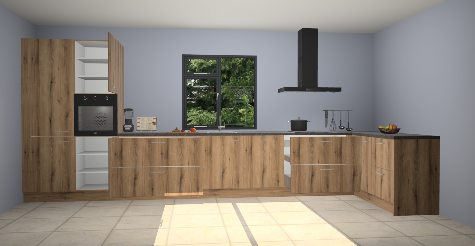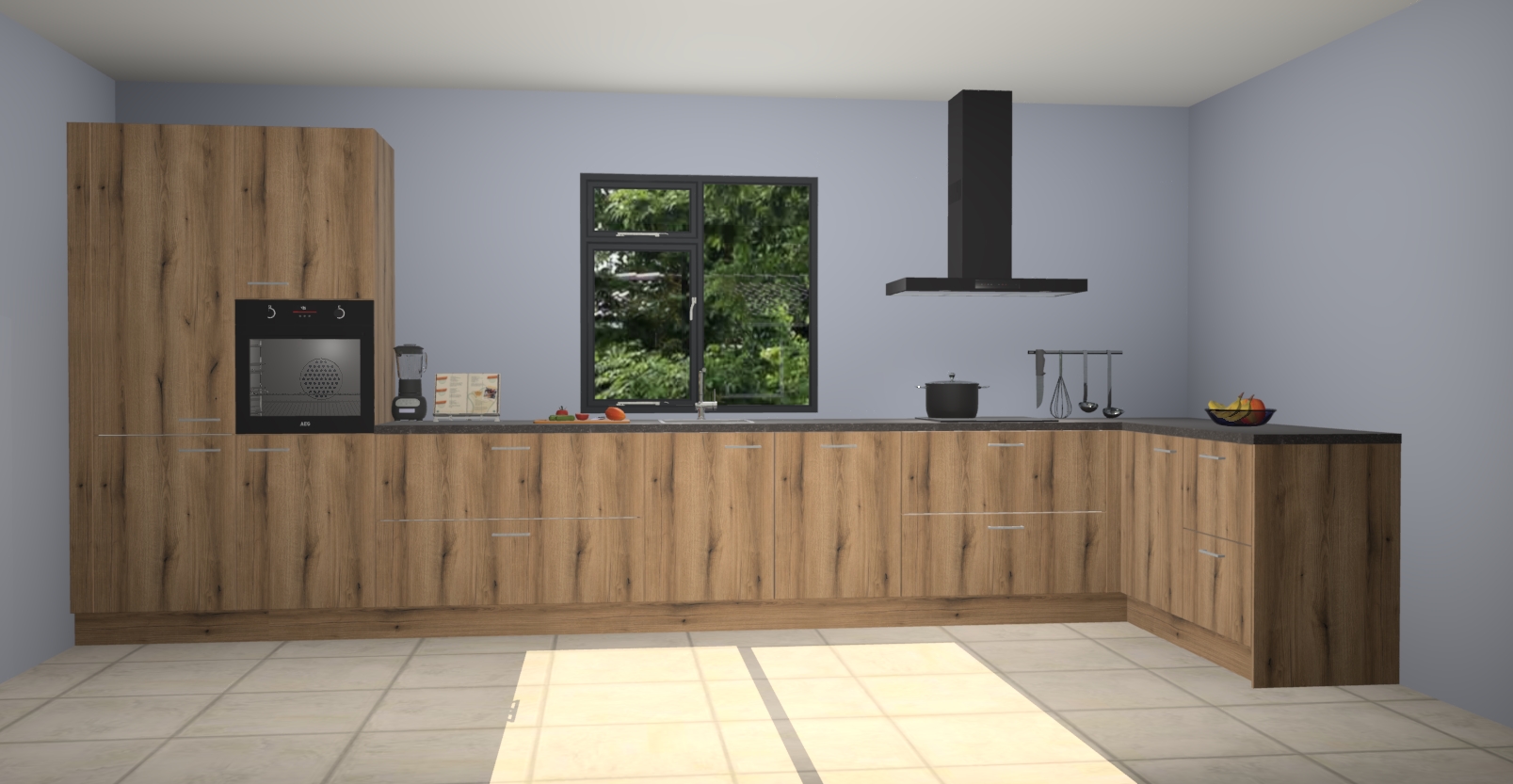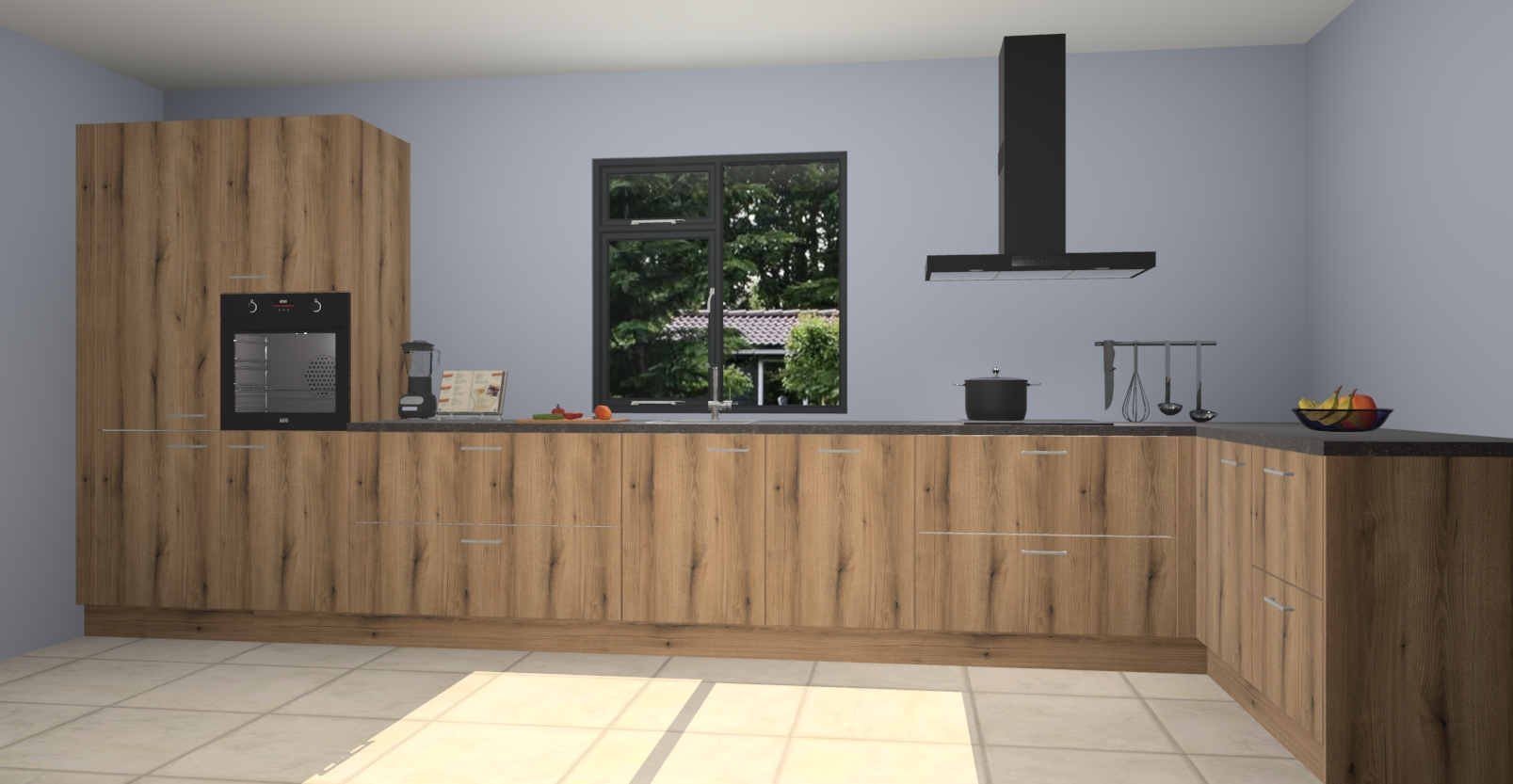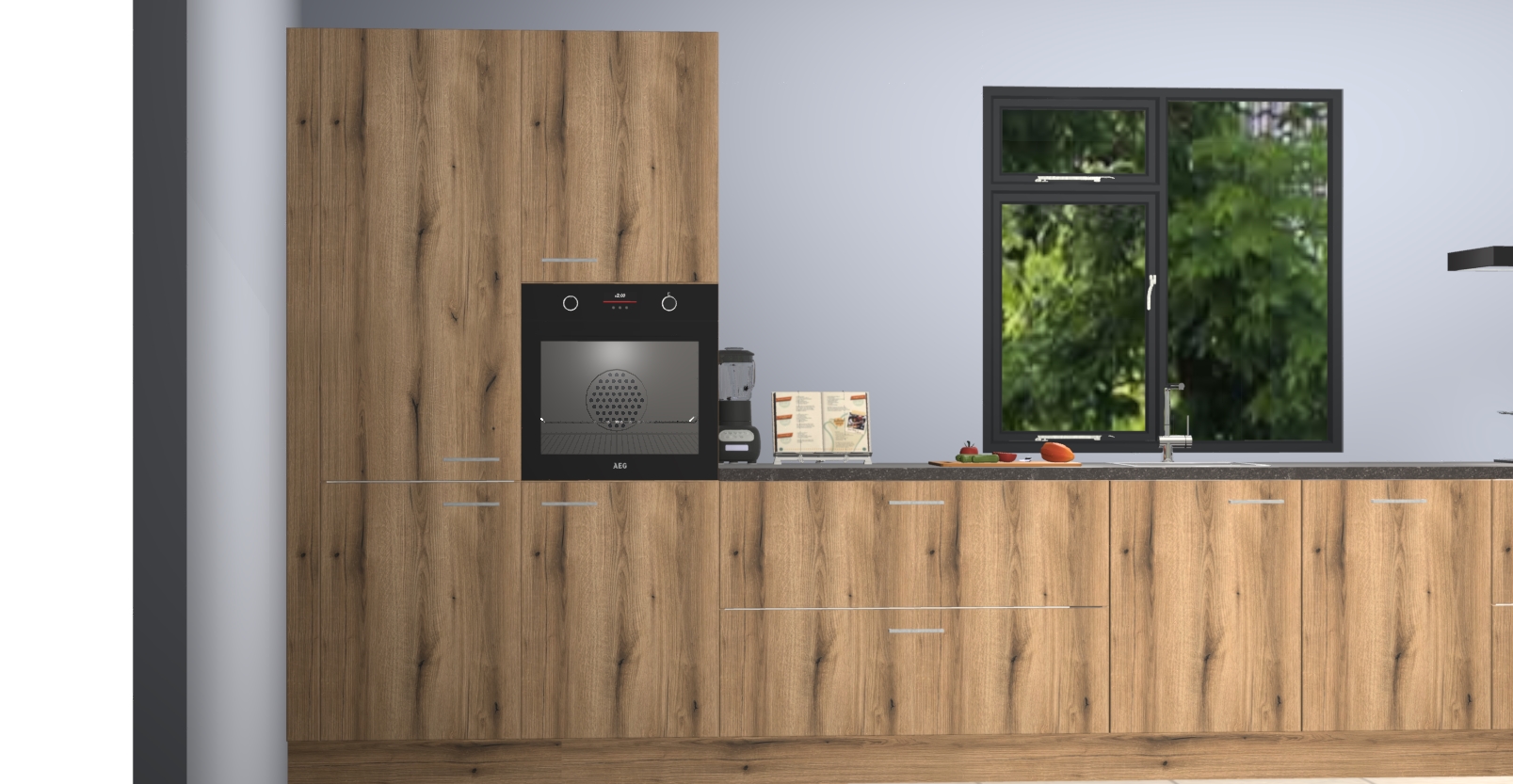 De Goud eiken keuken Lille wordt geleverd met vijf inbouwapparaten - een oven, inductiekookplaat, afzuigkap, vaatwasser en koelkast. Maar dat is nog niet alles! Na bestelling kunnen deze apparaten eenvoudig worden geüpgraded naar premium AEG-apparatuur. Bovendien is er zelfs de optie om de oven te vervangen door een combimagnetron of uw inductiekookplaat te vervangen door een kookplaat met geïntegreerde afzuiging.