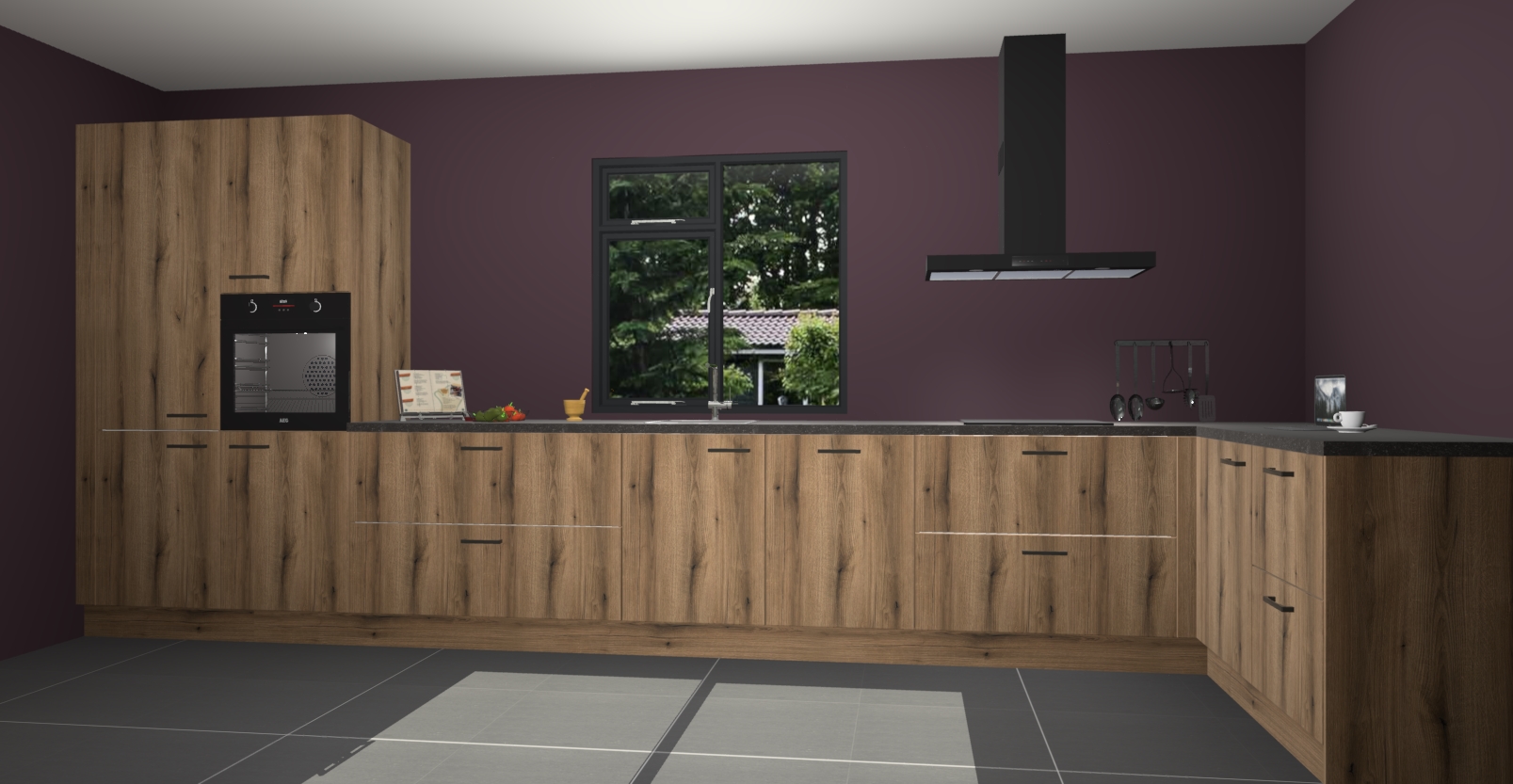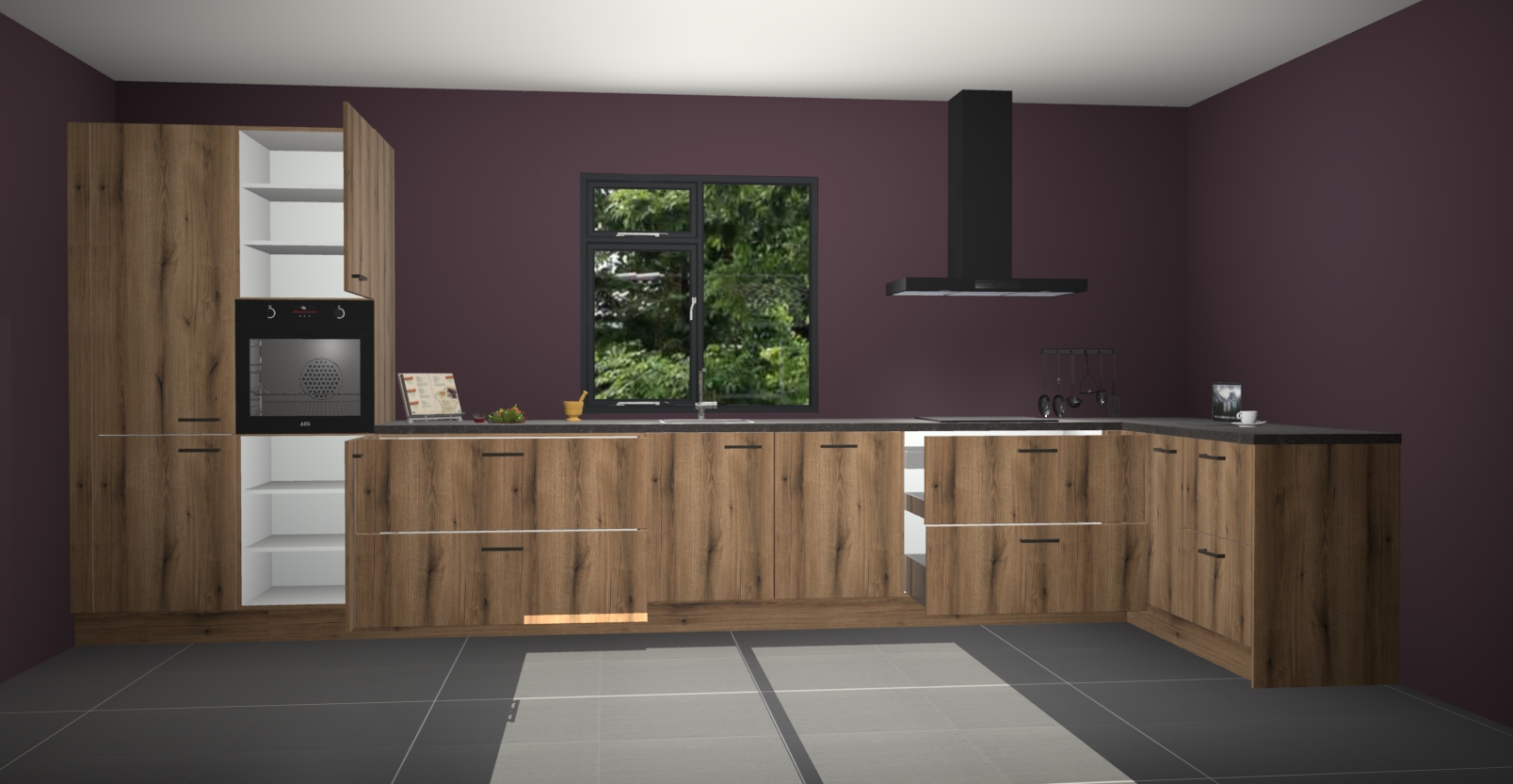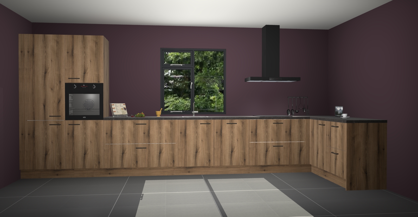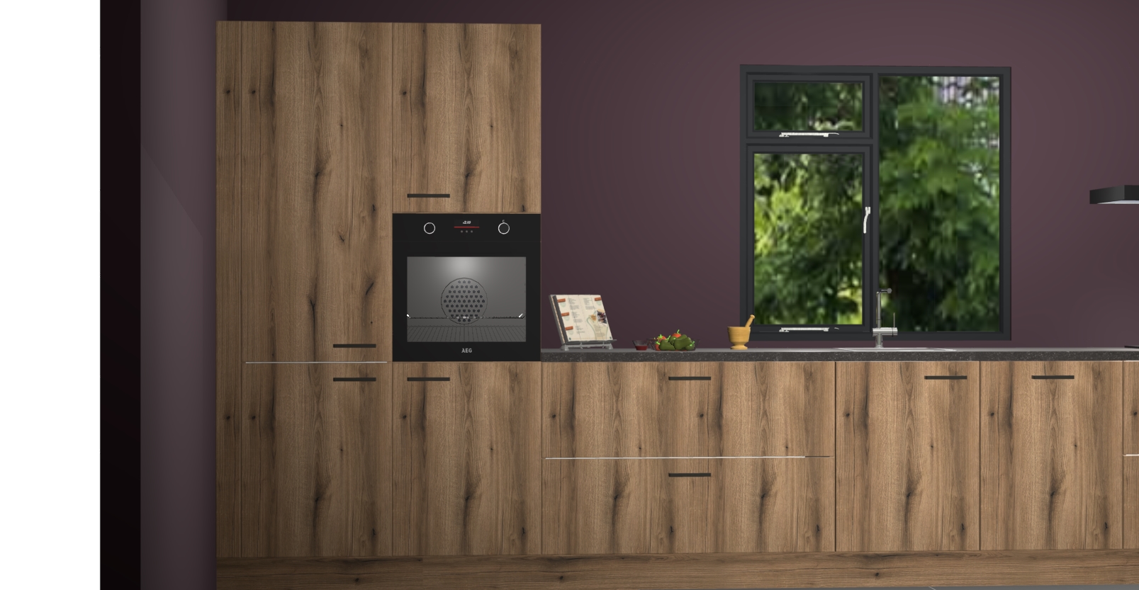 De Goud eiken keuken Lille wordt geleverd met vijf inbouwapparaten - een oven, inductiekookplaat, afzuigkap, vaatwasser en koelkast. Maar dat is nog niet alles! Na bestelling kunnen deze apparaten eenvoudig worden geüpgraded naar premium AEG-apparatuur. Bovendien is er zelfs de optie om de oven te vervangen door een combimagnetron of uw inductiekookplaat te vervangen door een kookplaat met geïntegreerde afzuiging.