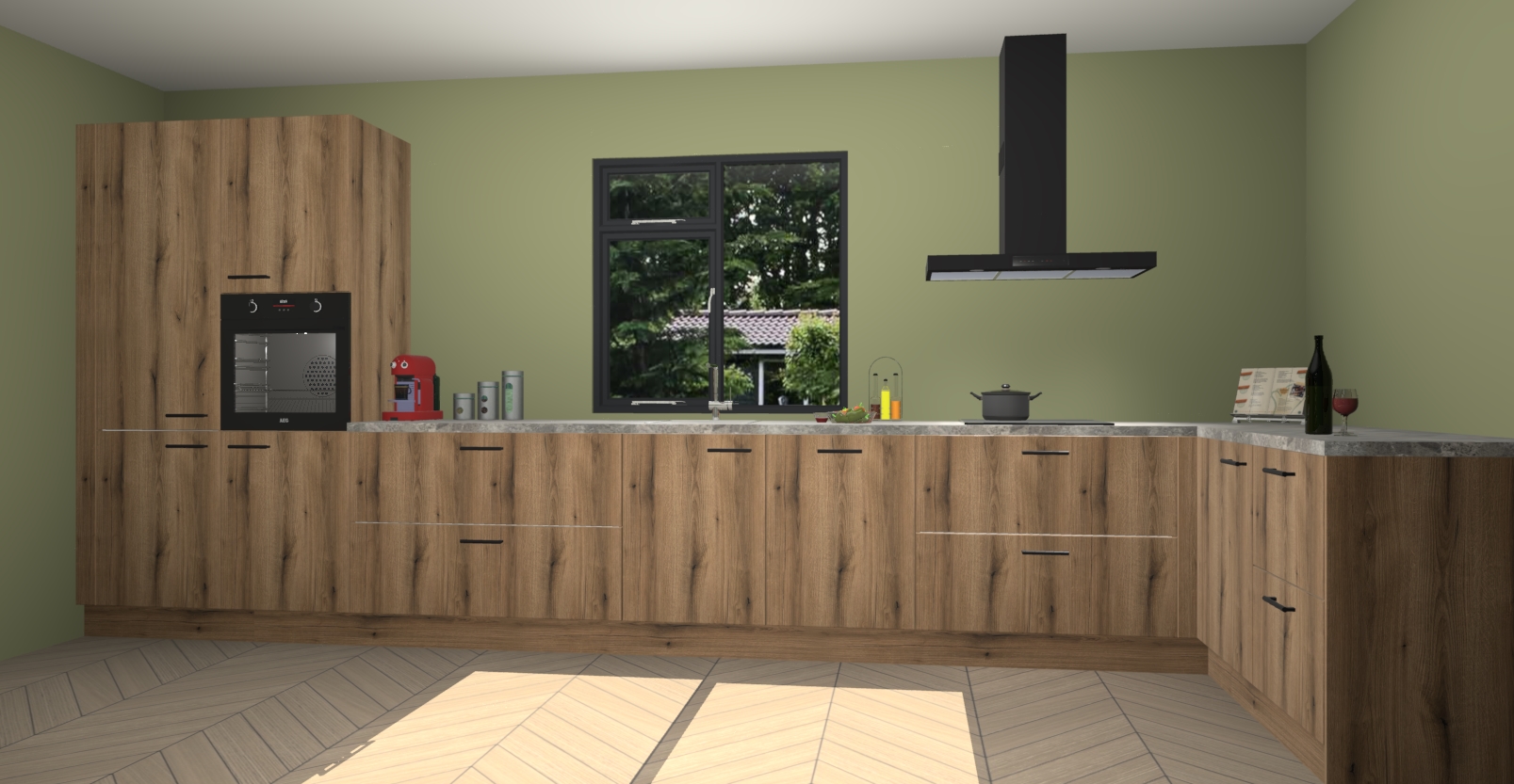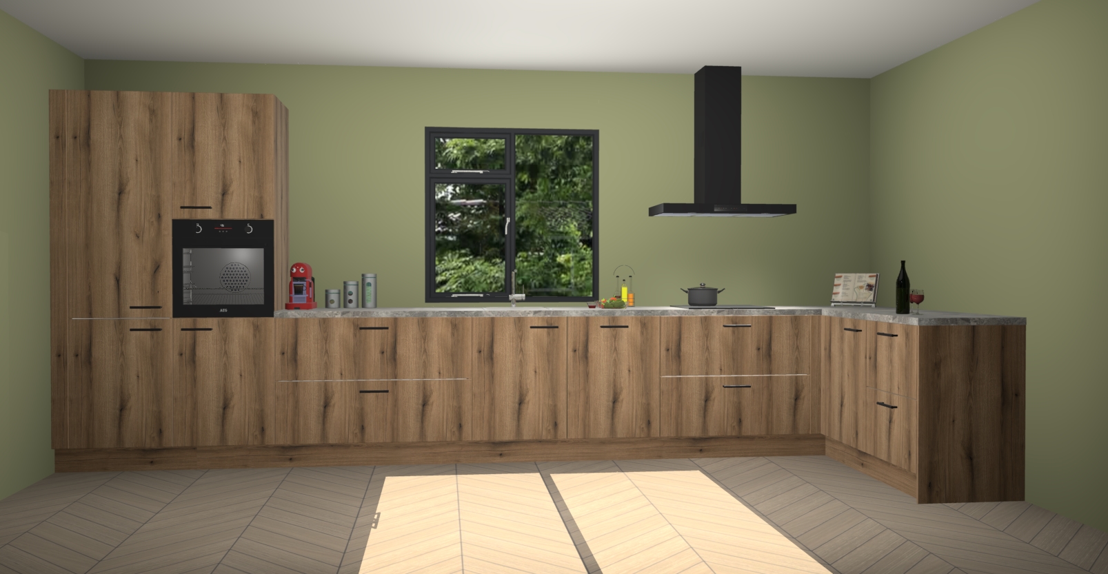 De Goud eiken keuken Lille wordt geleverd met vijf inbouwapparaten - een oven, inductiekookplaat, afzuigkap, vaatwasser en koelkast. Maar dat is nog niet alles! Na bestelling kunnen deze apparaten eenvoudig worden geüpgraded naar premium AEG-apparatuur. Bovendien is er zelfs de optie om de oven te vervangen door een combimagnetron of uw inductiekookplaat te vervangen door een kookplaat met geïntegreerde afzuiging.